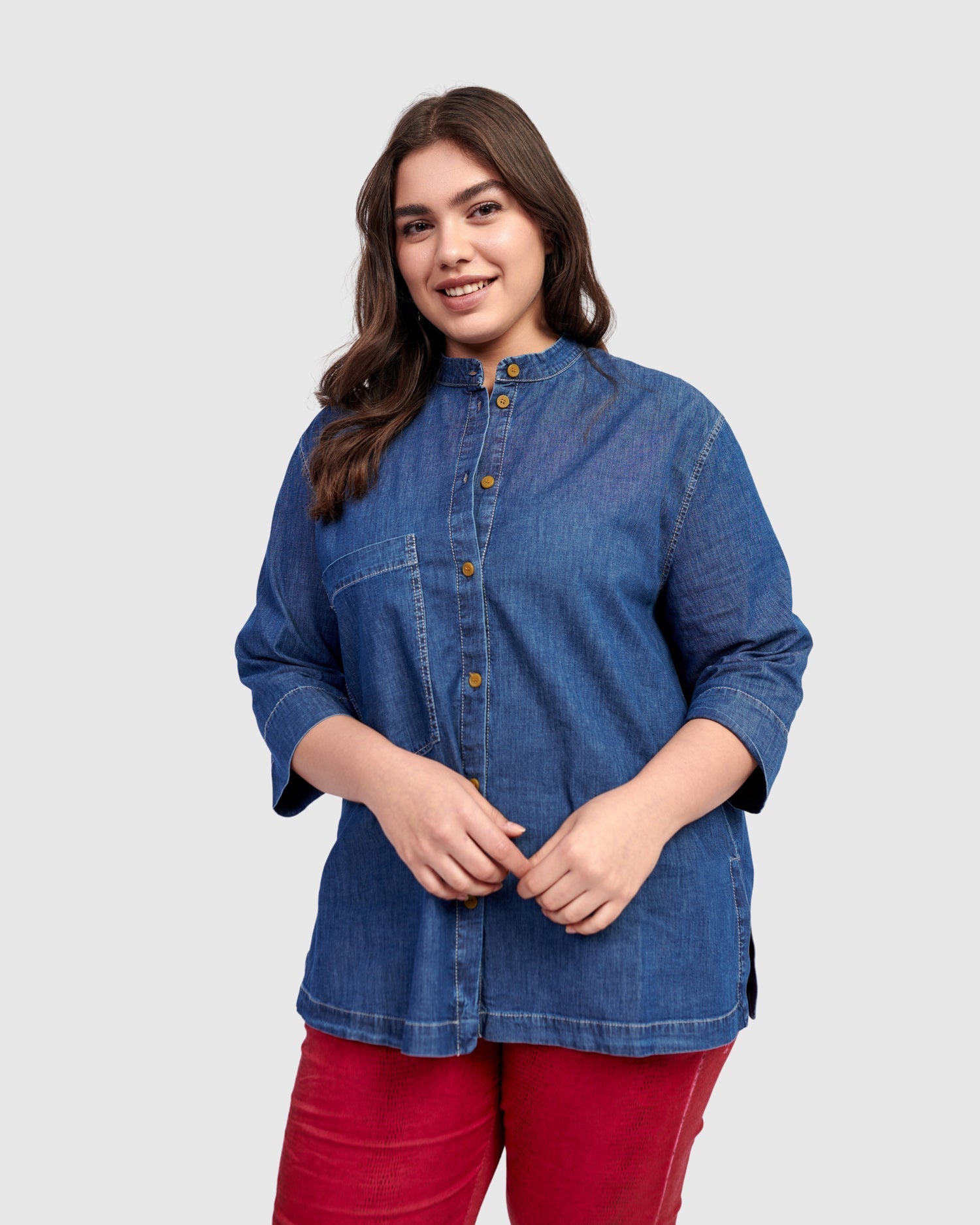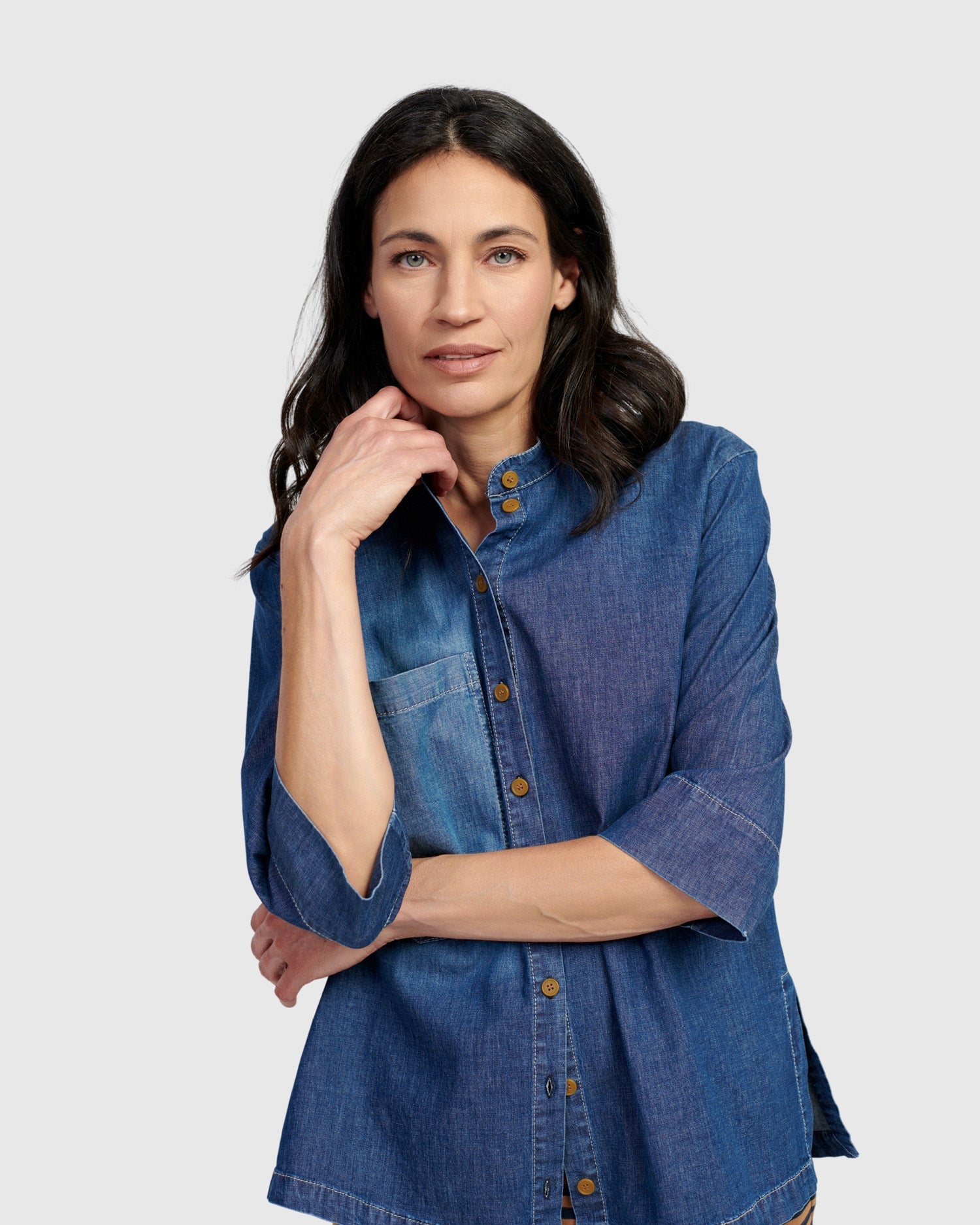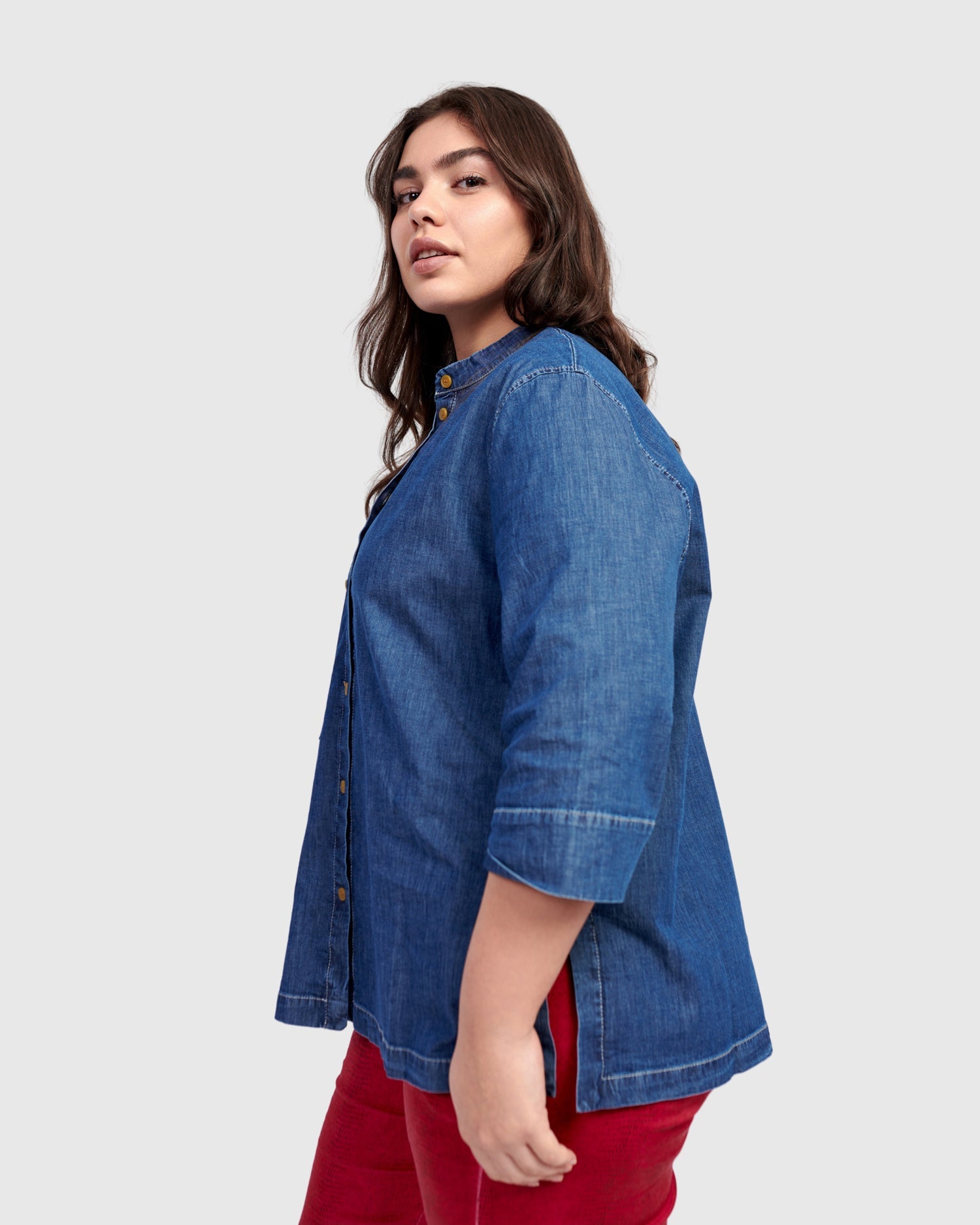 This classic button down shirt has a Mandarin collar, full button placket with front pocket, three-quarter length sleeves and hits just at the hip with side slits. The slim, straight silhouette refines your shape, while the lightweight denim fabric gives off a rustic, workwear vibe.