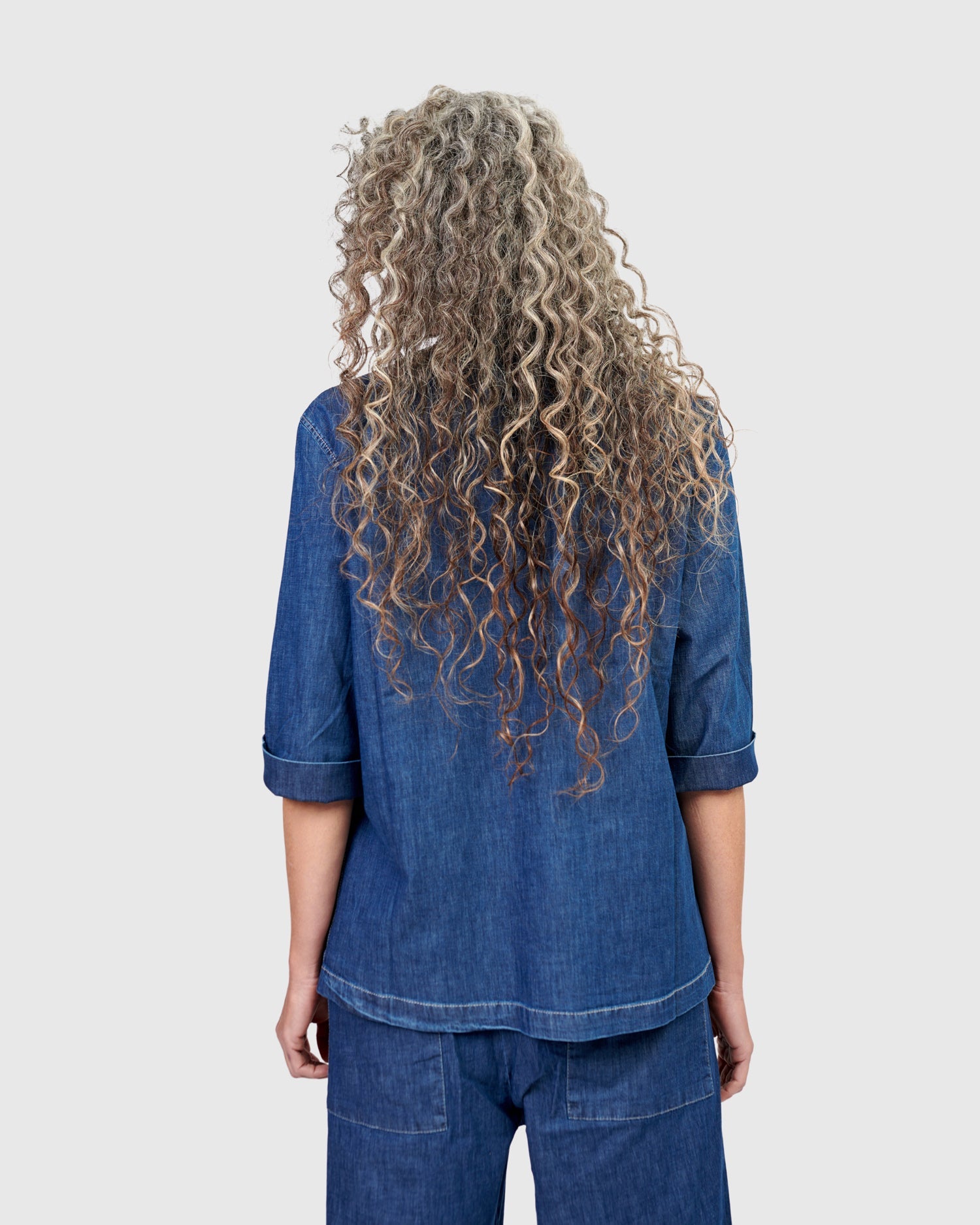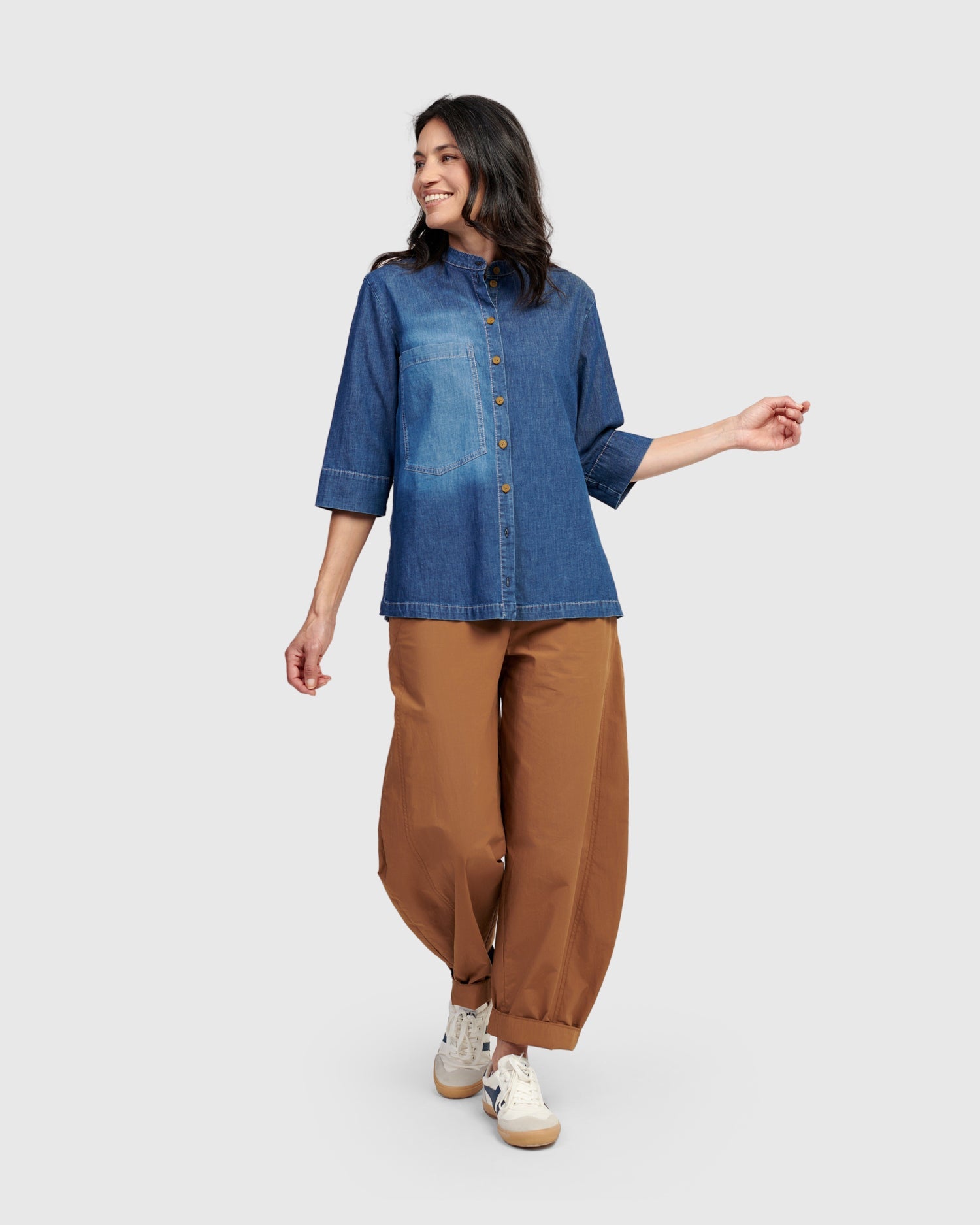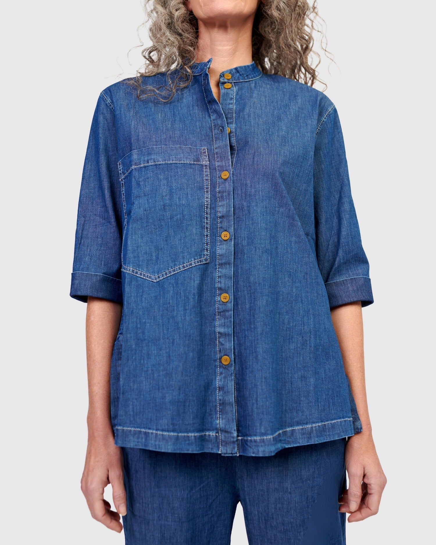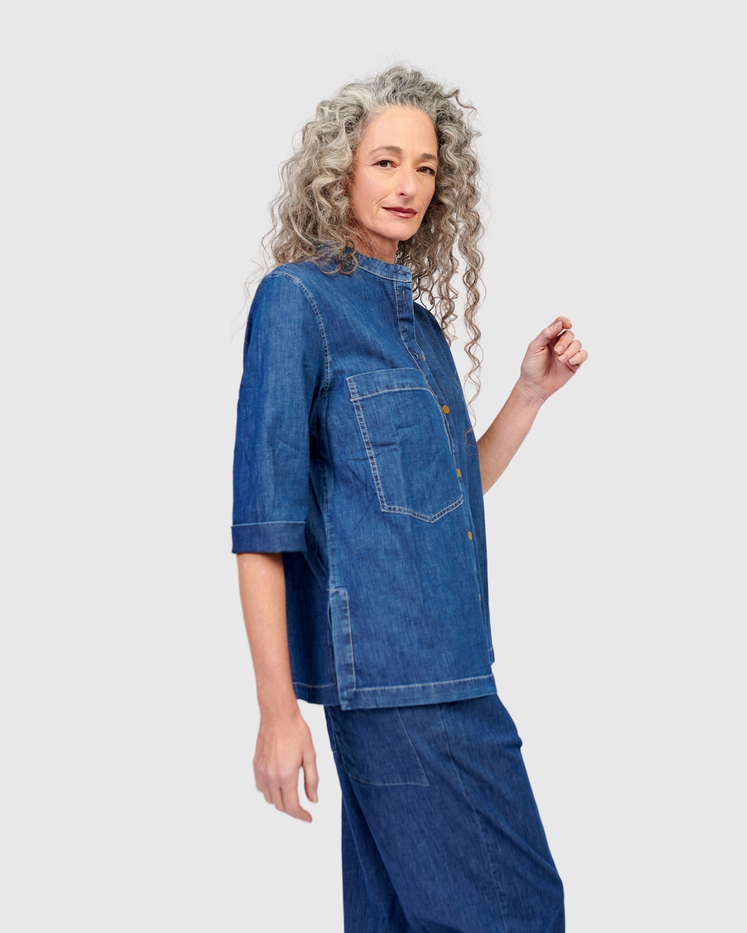 This classic button down shirt has a Mandarin collar, full button placket with front pocket, three-quarter length sleeves and hits just at the hip with side slits. The slim, straight silhouette refines your shape, while the lightweight denim fabric gives off a rustic, workwear vibe.