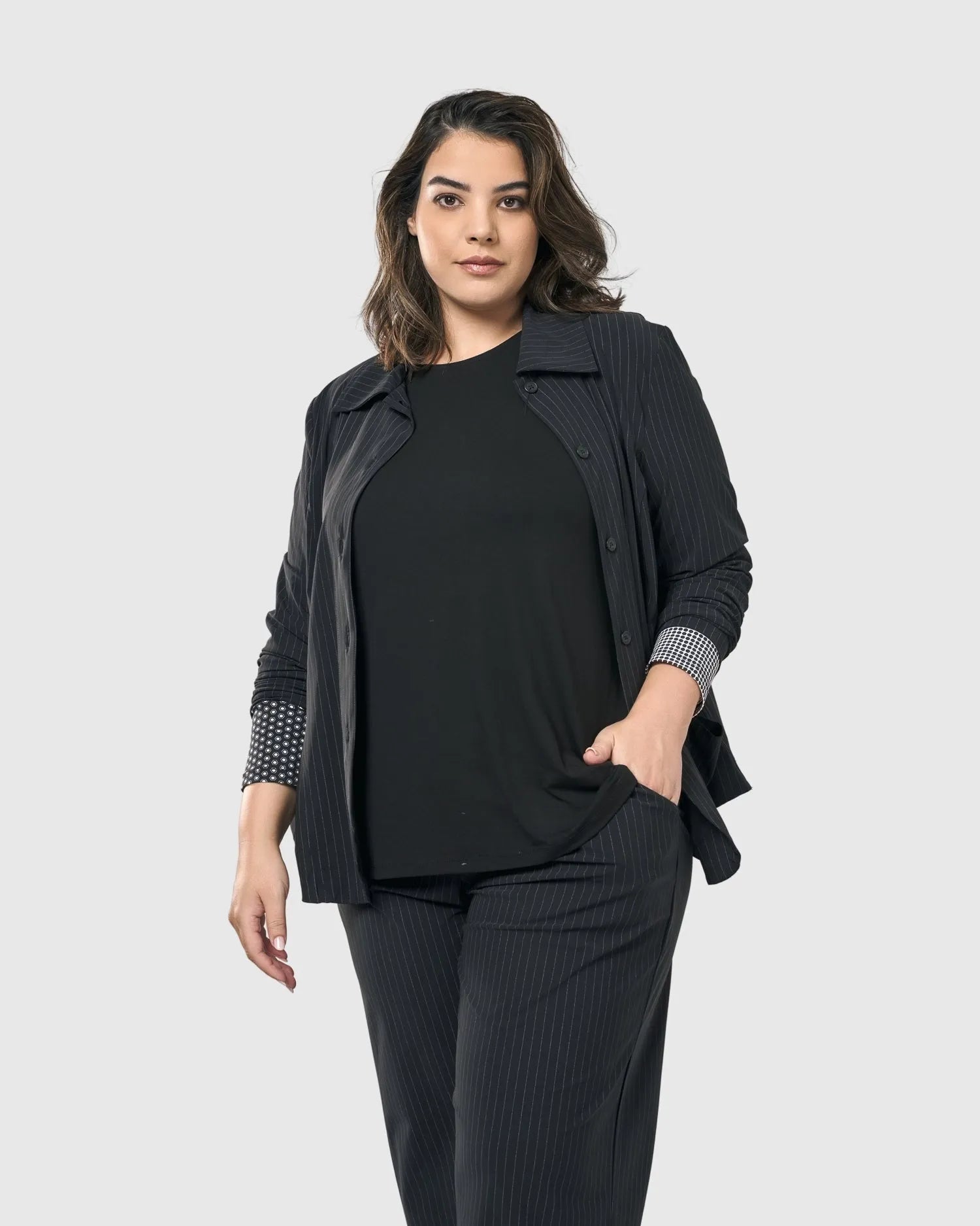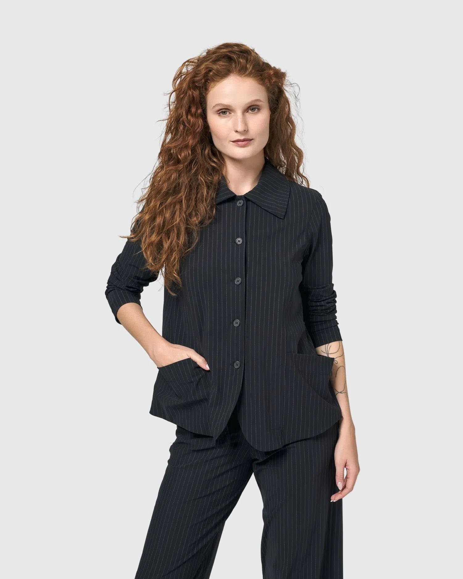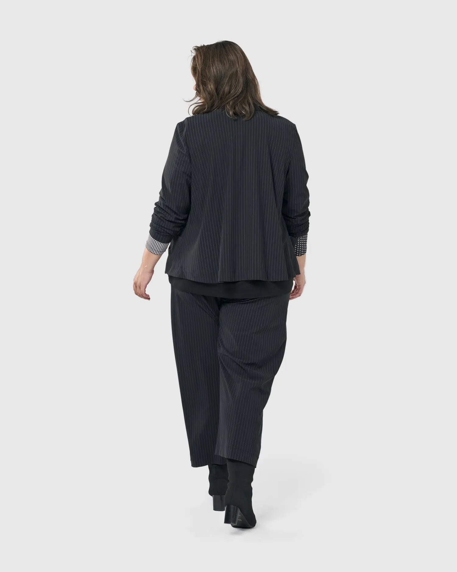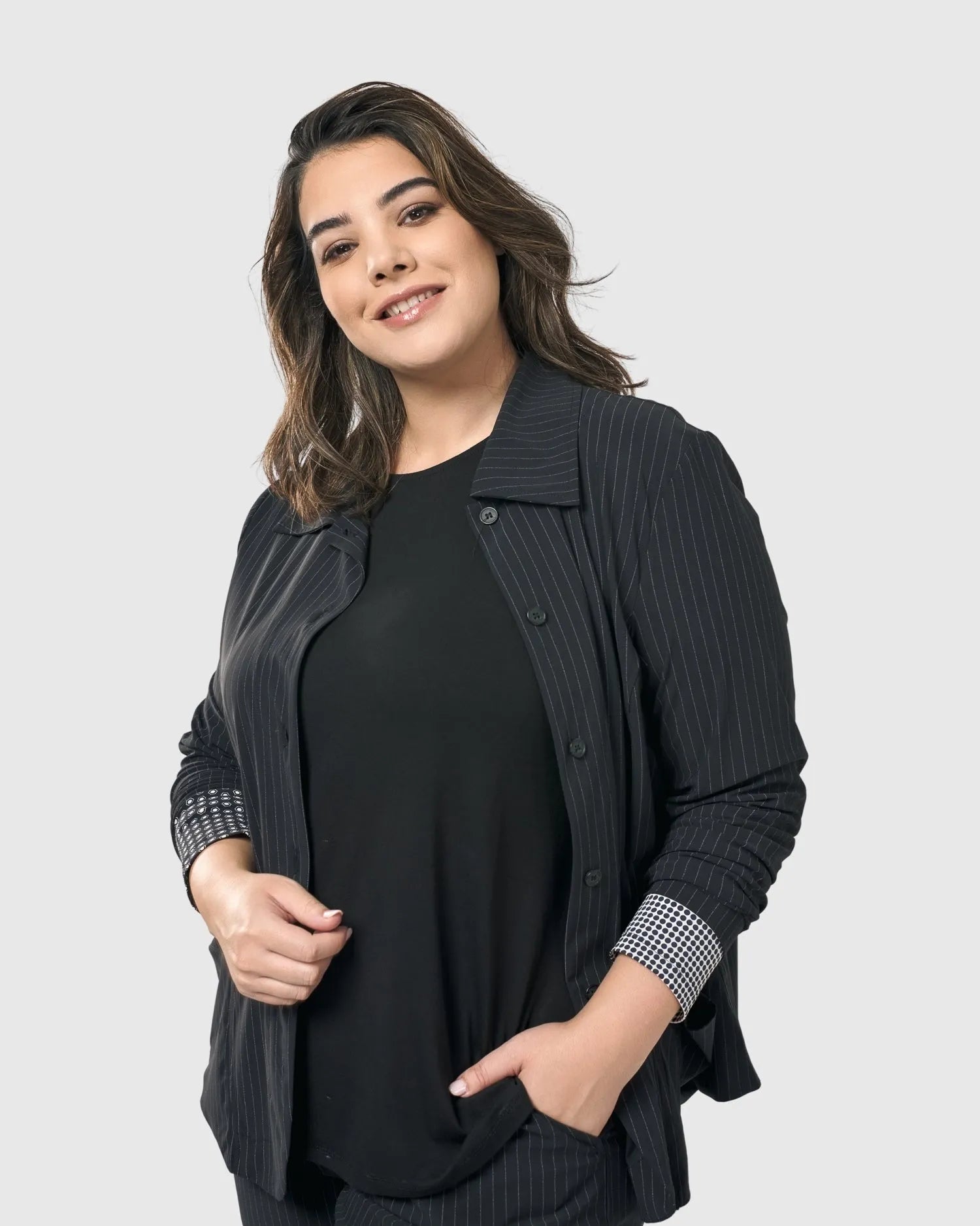 Business meets chic in this slim-fit, stretchy sporty blazer made with pinstriped TECHNO fabric. Features a curved hem, draped side pockets, and flat front buttons.