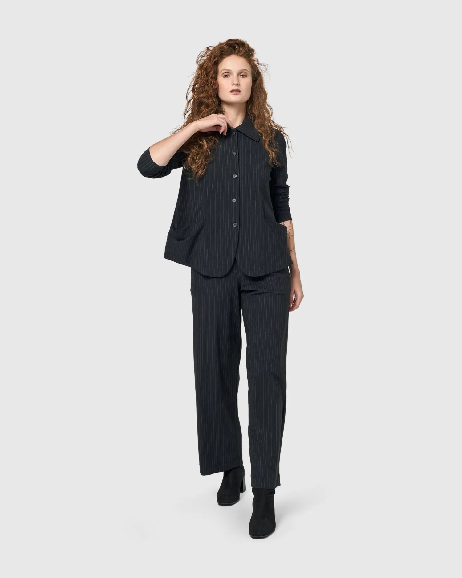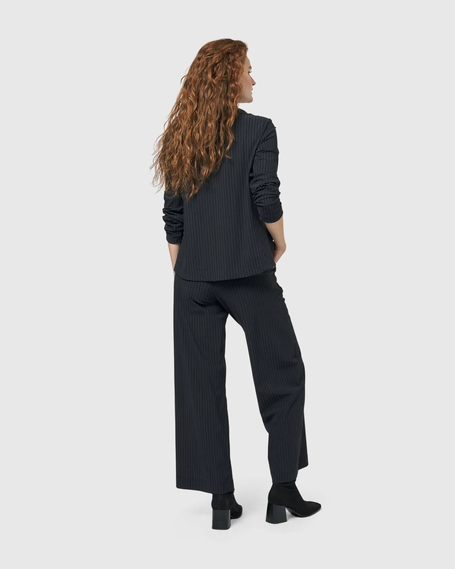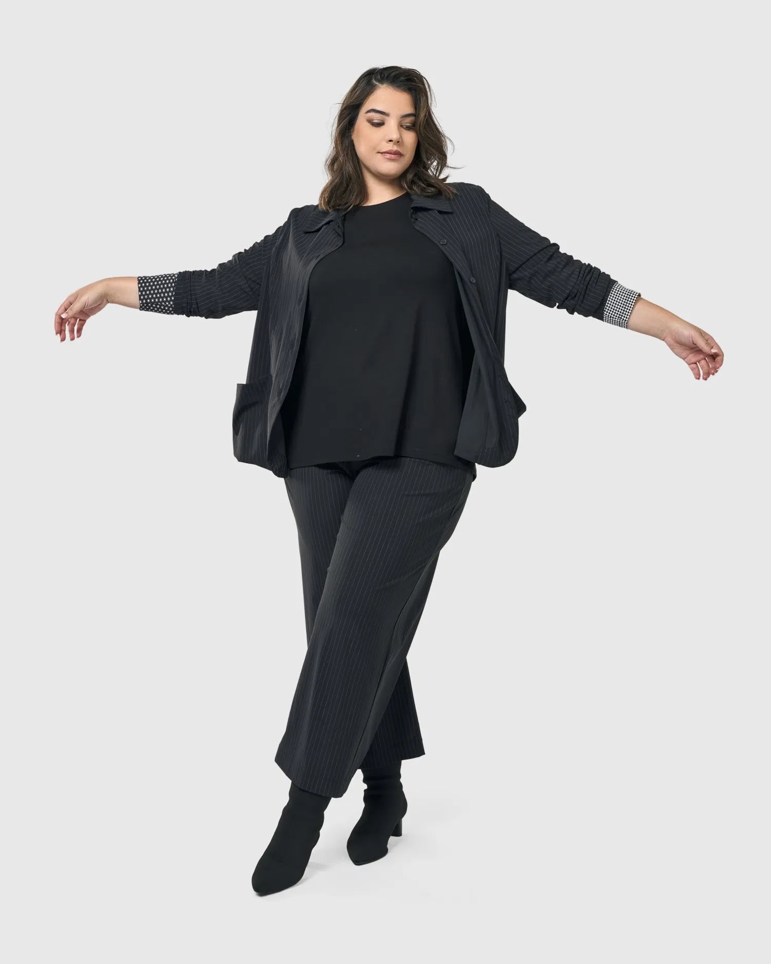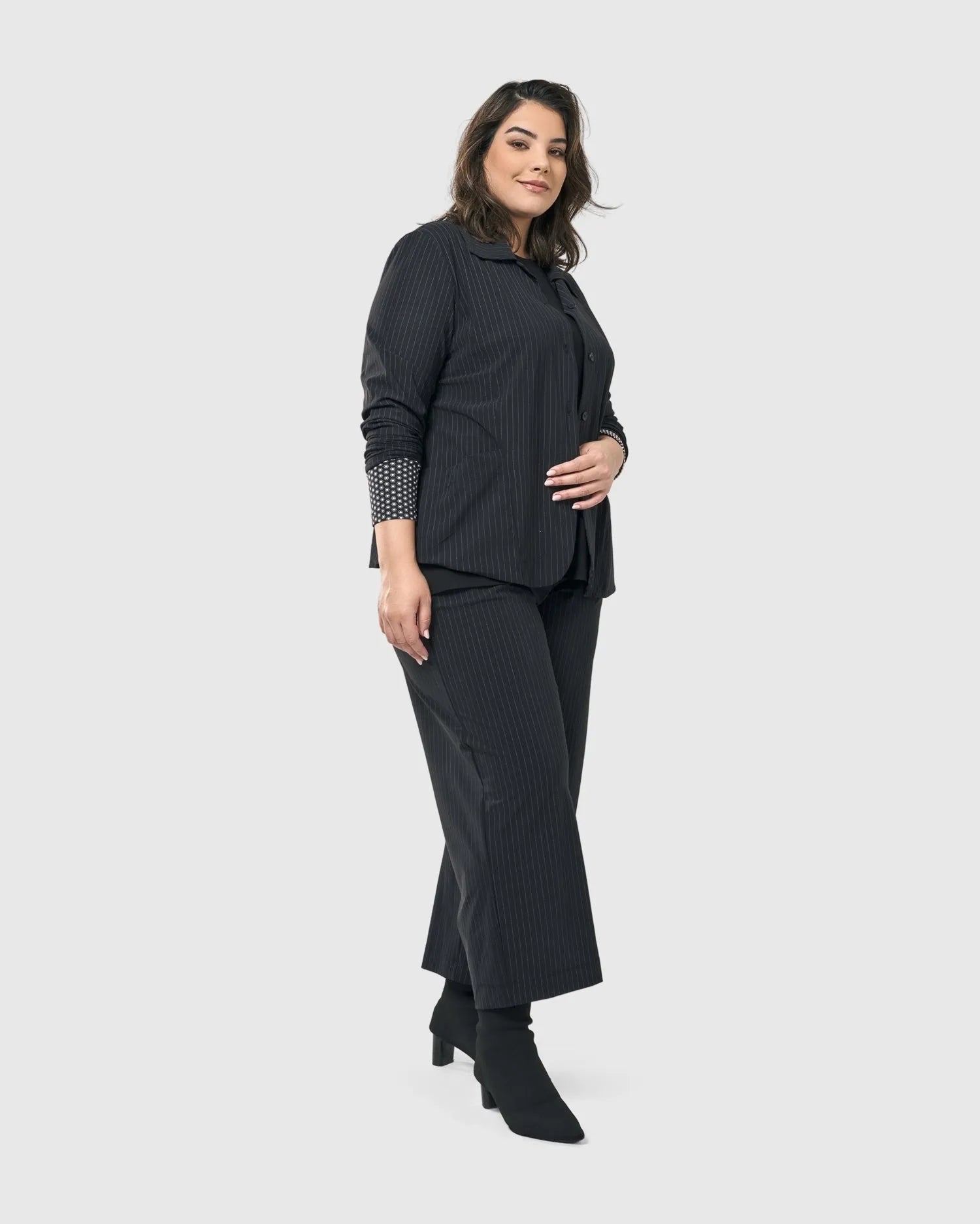 Business meets chic in this slim-fit, stretchy sporty blazer made with pinstriped TECHNO fabric. Features a curved hem, draped side pockets, and flat front buttons.