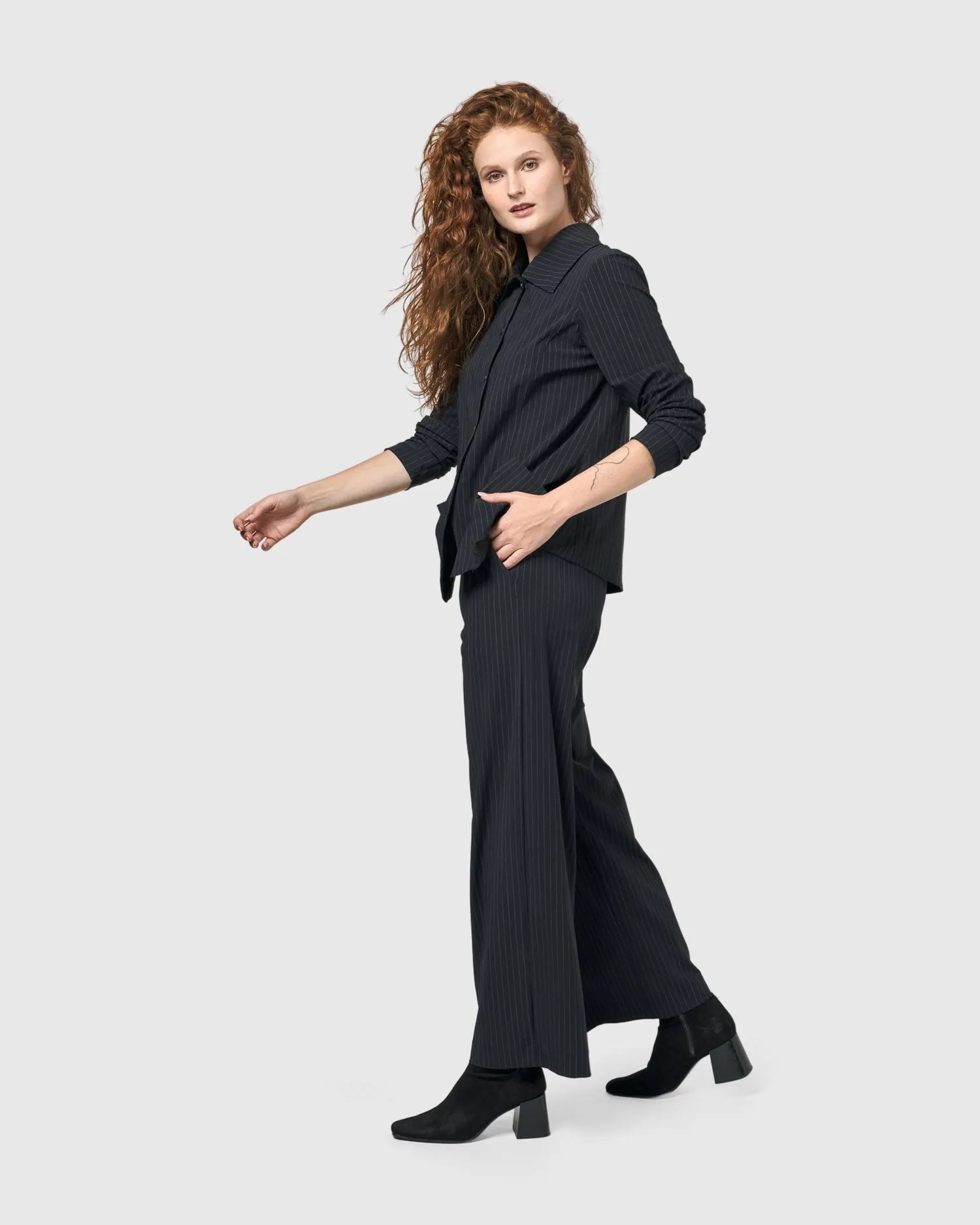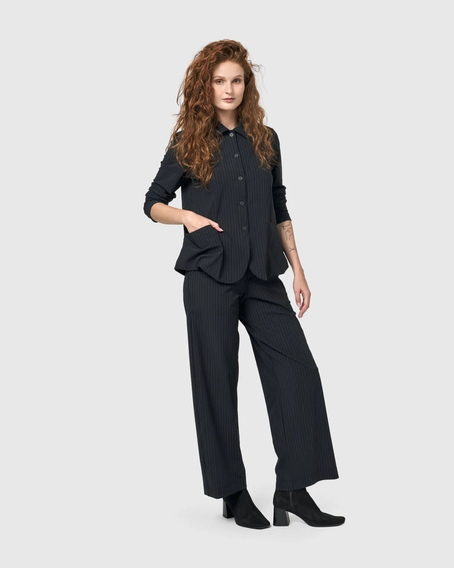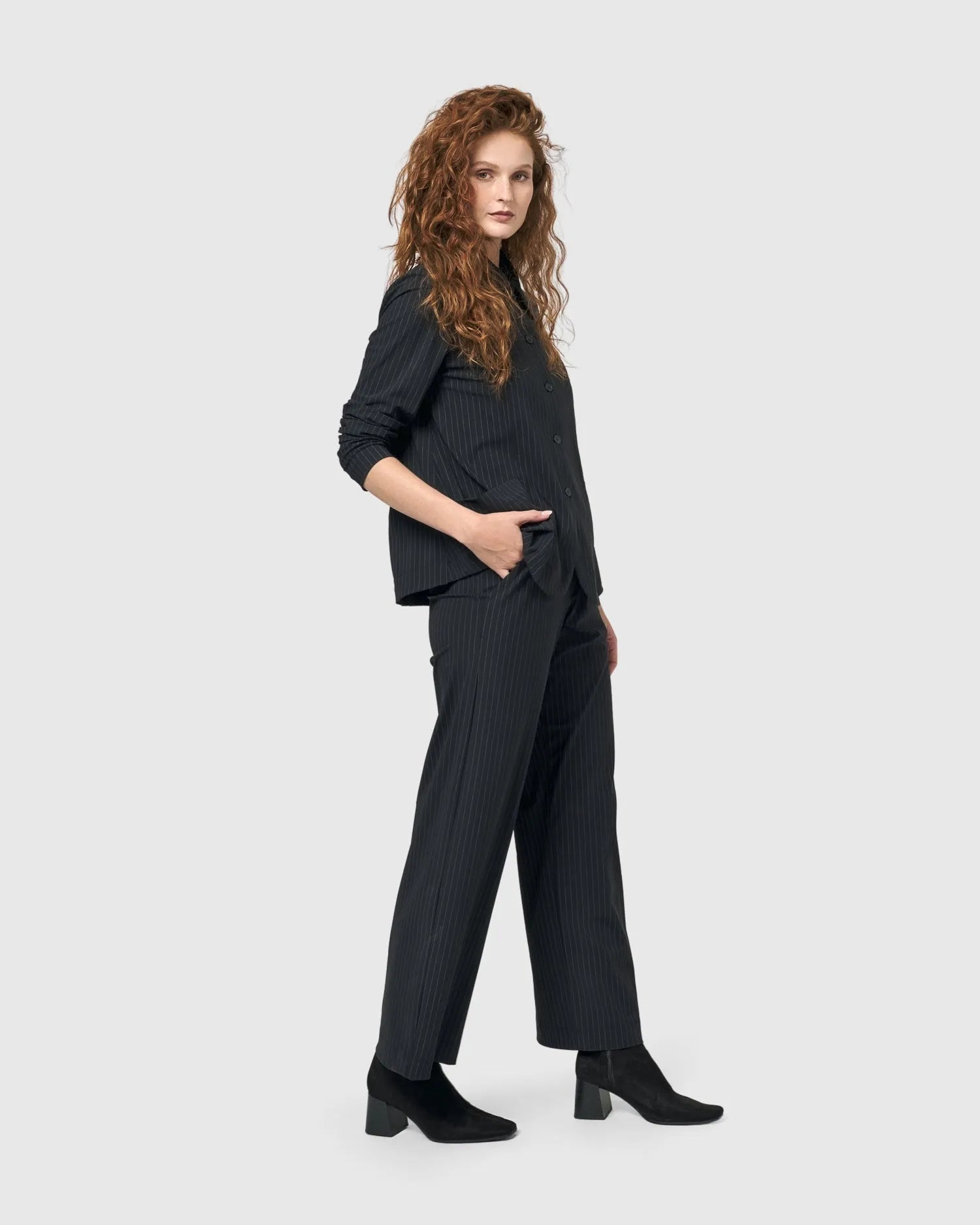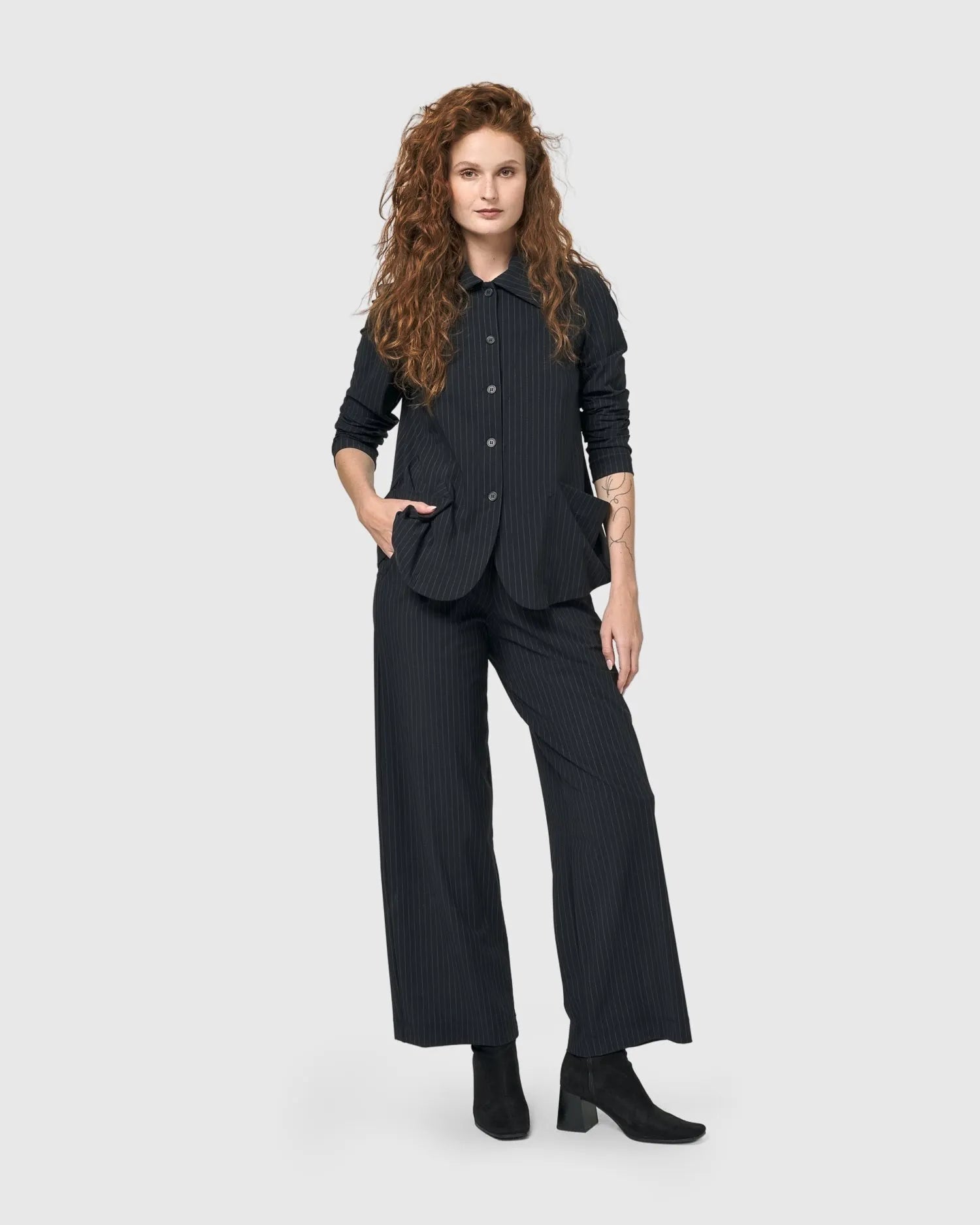 Business meets chic in this slim-fit, stretchy sporty blazer made with pinstriped TECHNO fabric. Features a curved hem, draped side pockets, and flat front buttons.