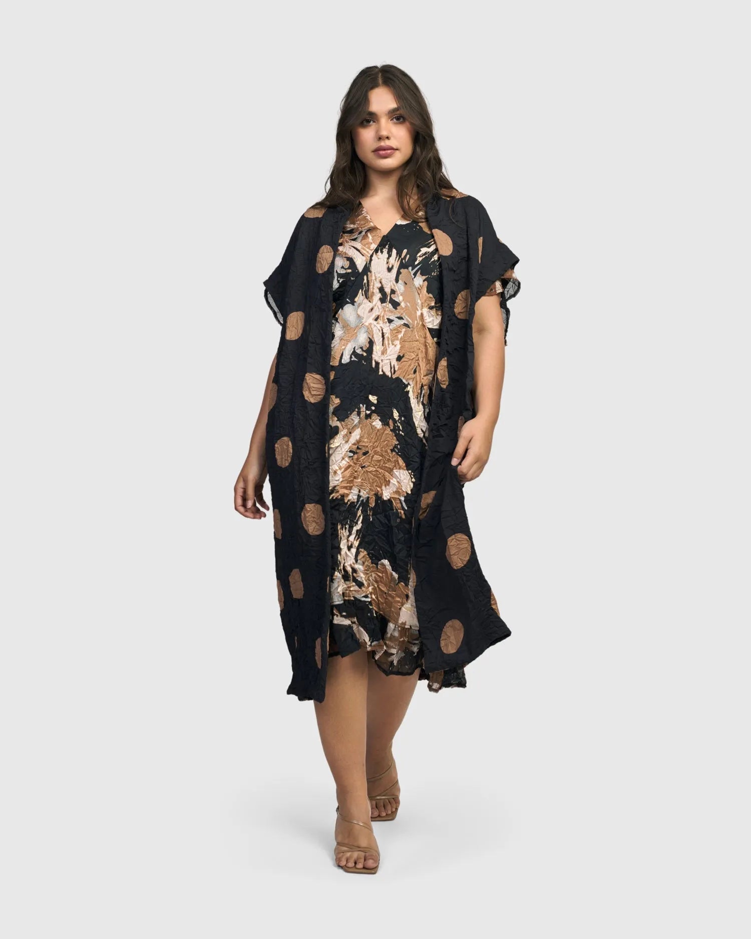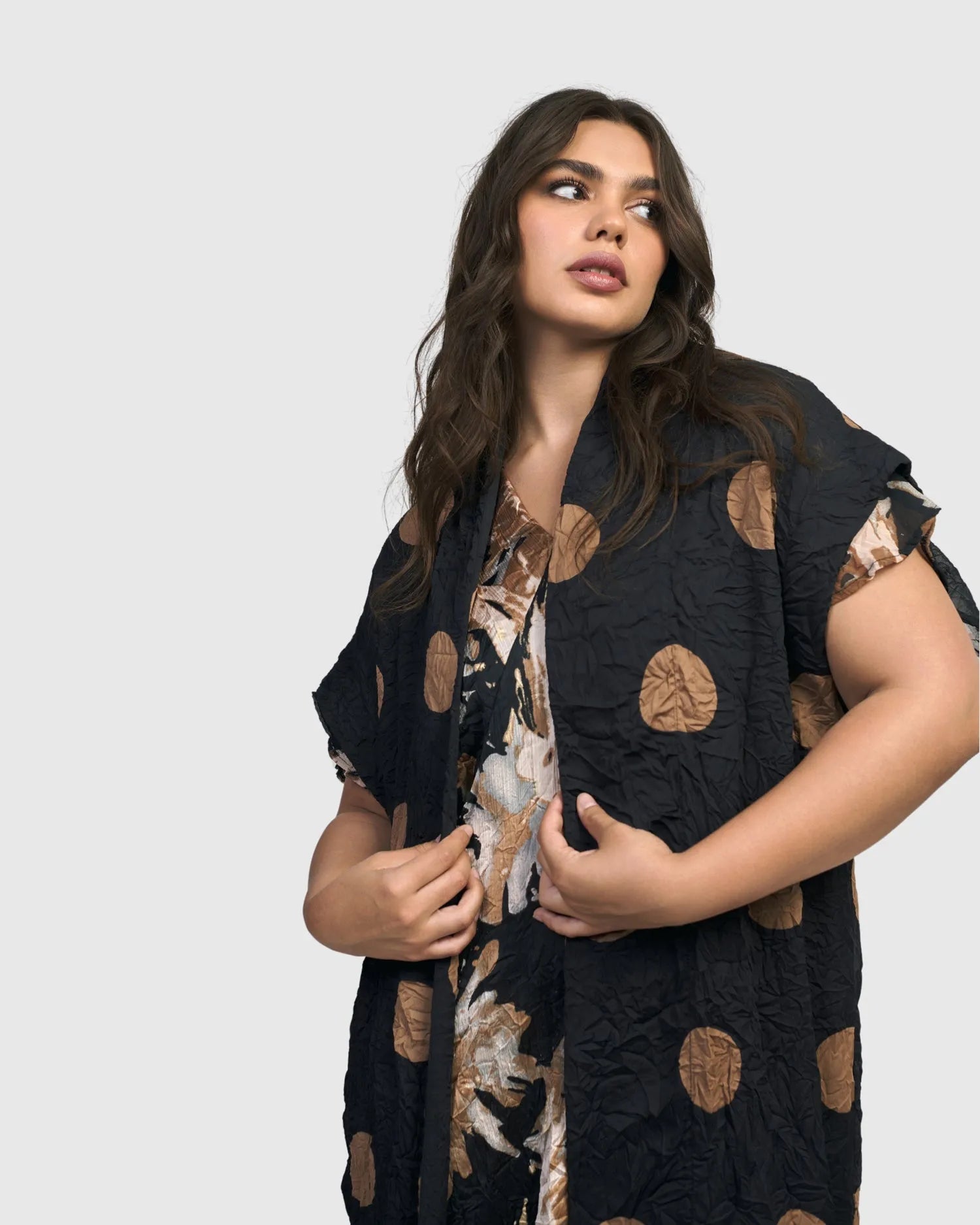 This long sleeveless duster is lightweight, slightly crinkled and has short cuffed sleeves for a finished look. A perfect piece for dynamic styling or when you just want another layer for extra coverage.