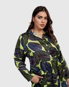 This slinky satin-feel button down shirt is an Alembika interpretation of feminized menswear. Babydoll gathered waist, foldover collar, half button placket with shell buttons, draped front pockets, shirttail hem and tailored bracelet sleeves. We can't get enough of the psychedelic leaf print and oversized fit.