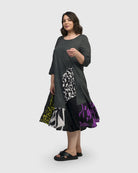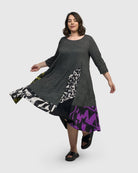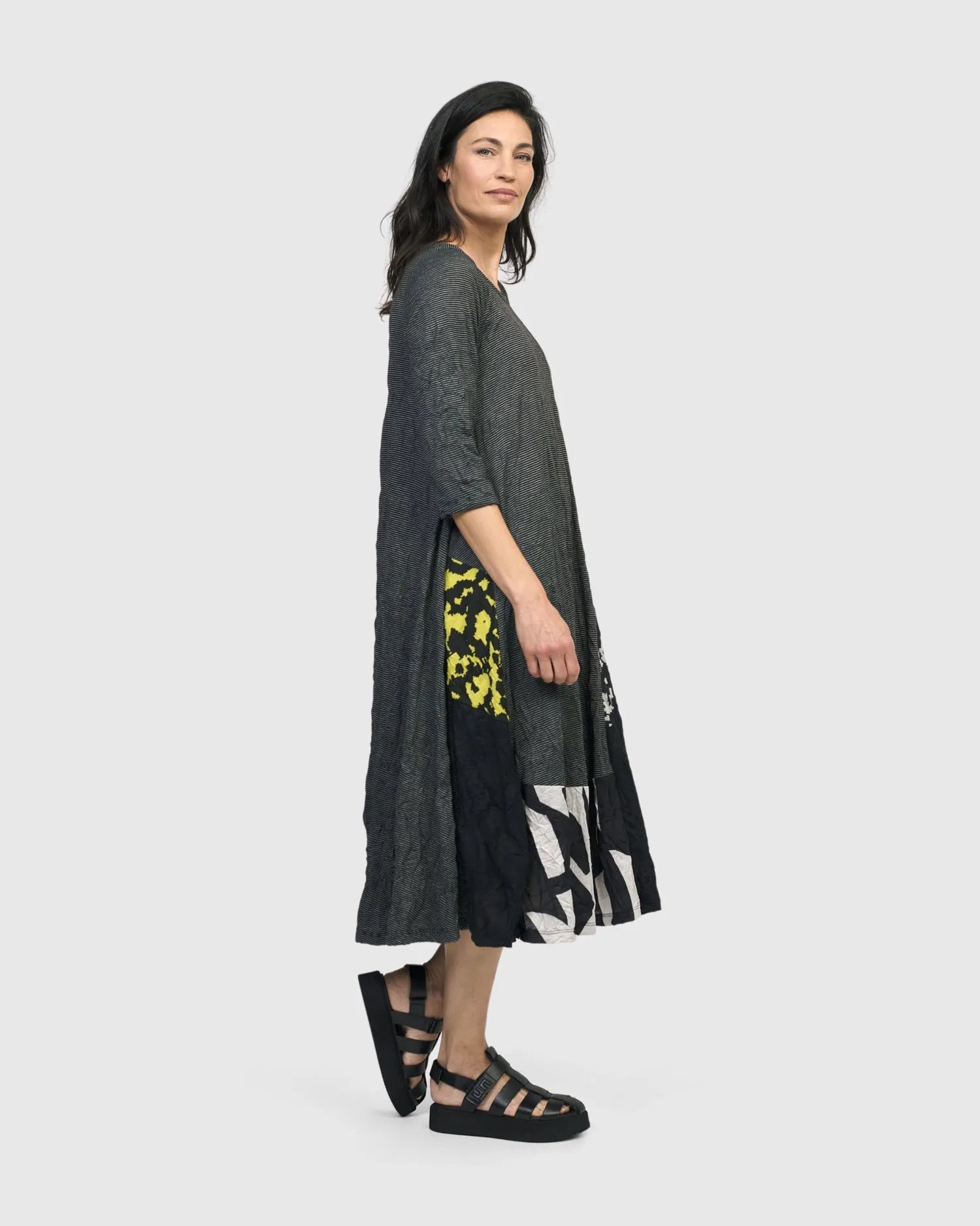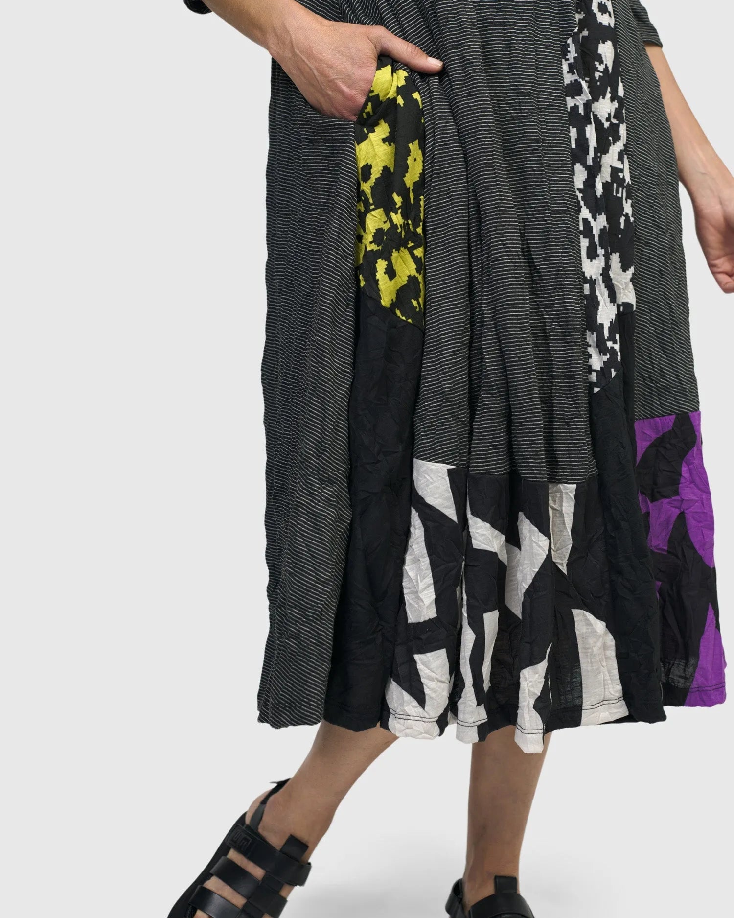 This flared A-line midi dress has a scoop neck, hidden side-seam pockets, a full skirt, and three-quarter length sleeves. Made in a soft crinked pinstriped knit with different patchwork designs, it's sure to be a unique addition to your closet. Fun, flirty and swingy!