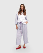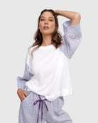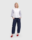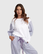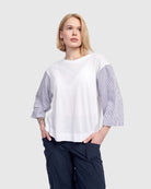This relaxed fit top has an easy, hip-length pullover silhouette and subtle pop of nautical stripes that bring coastal chic to mind. Details: Boxy silhouette with a wide neck, drop shoulder, wide three quarter length sleeves in a crinkled woven contrast stripe.