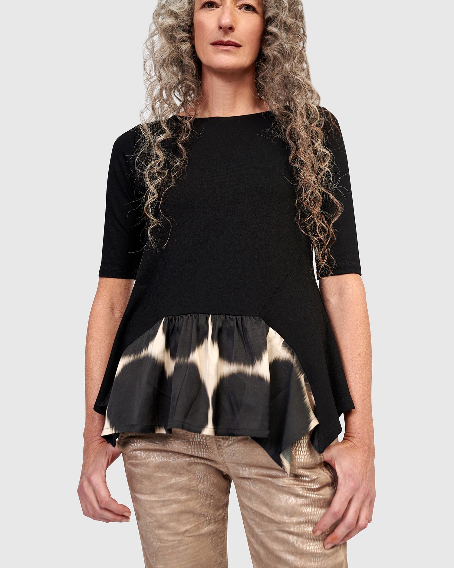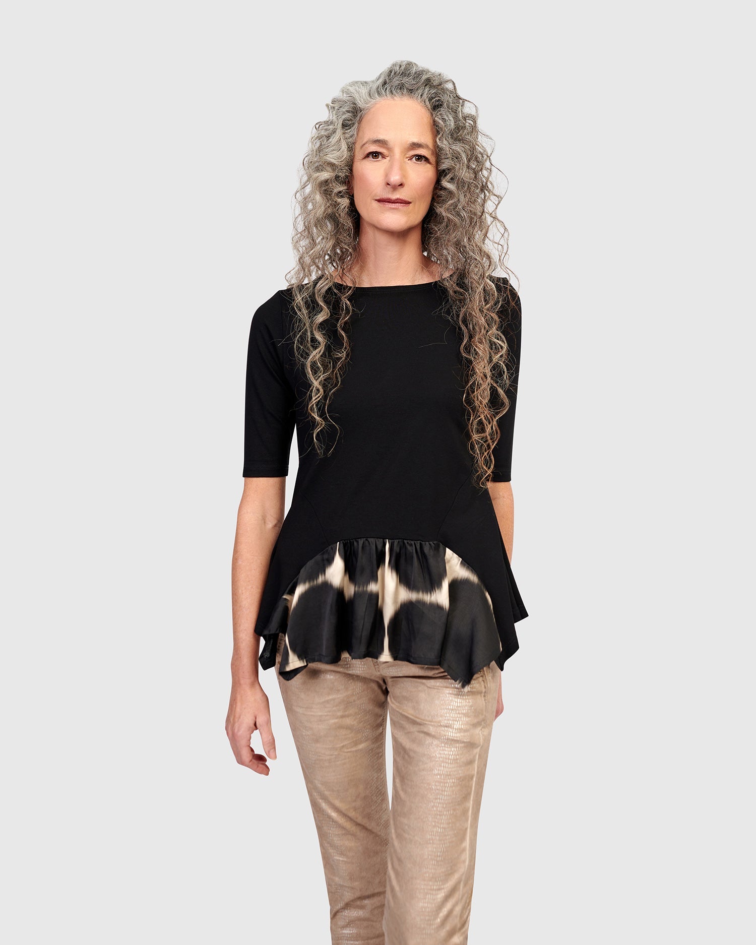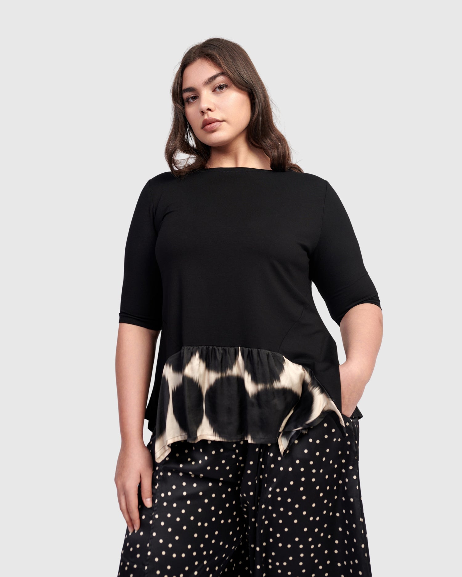 This fitted tee is made special with a flouncy hem pieced with a silky printed fabric, daring to elevate your outfit. Crafted in a stretchy jersey knit and has a wide crew neck, elbow length sleeves, hip length with plenty of swing.