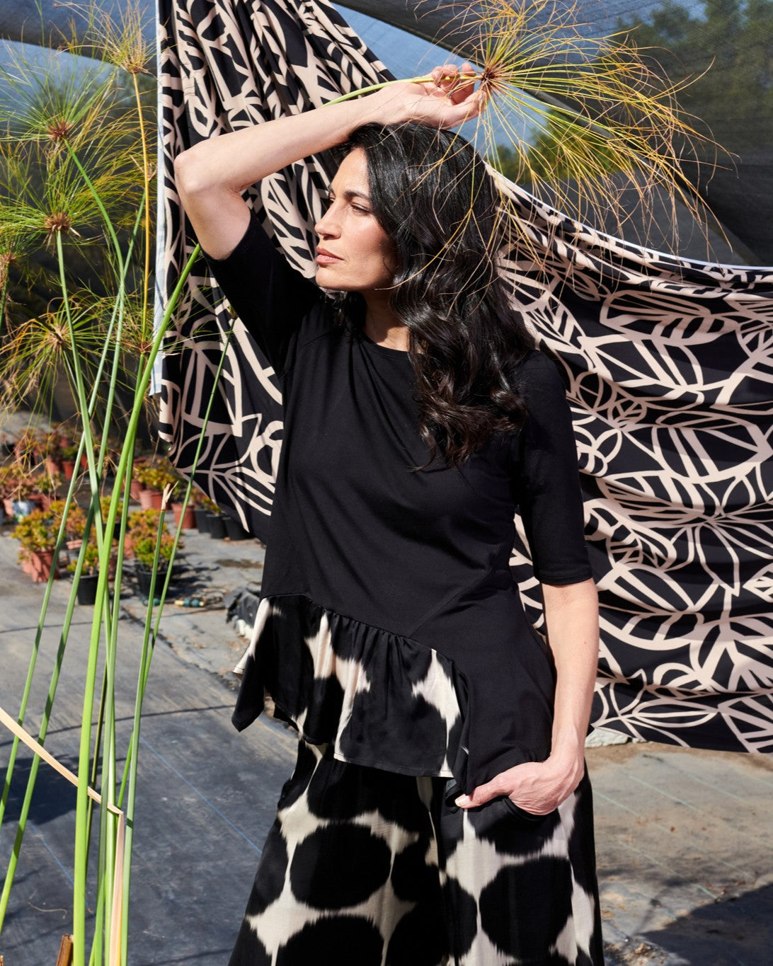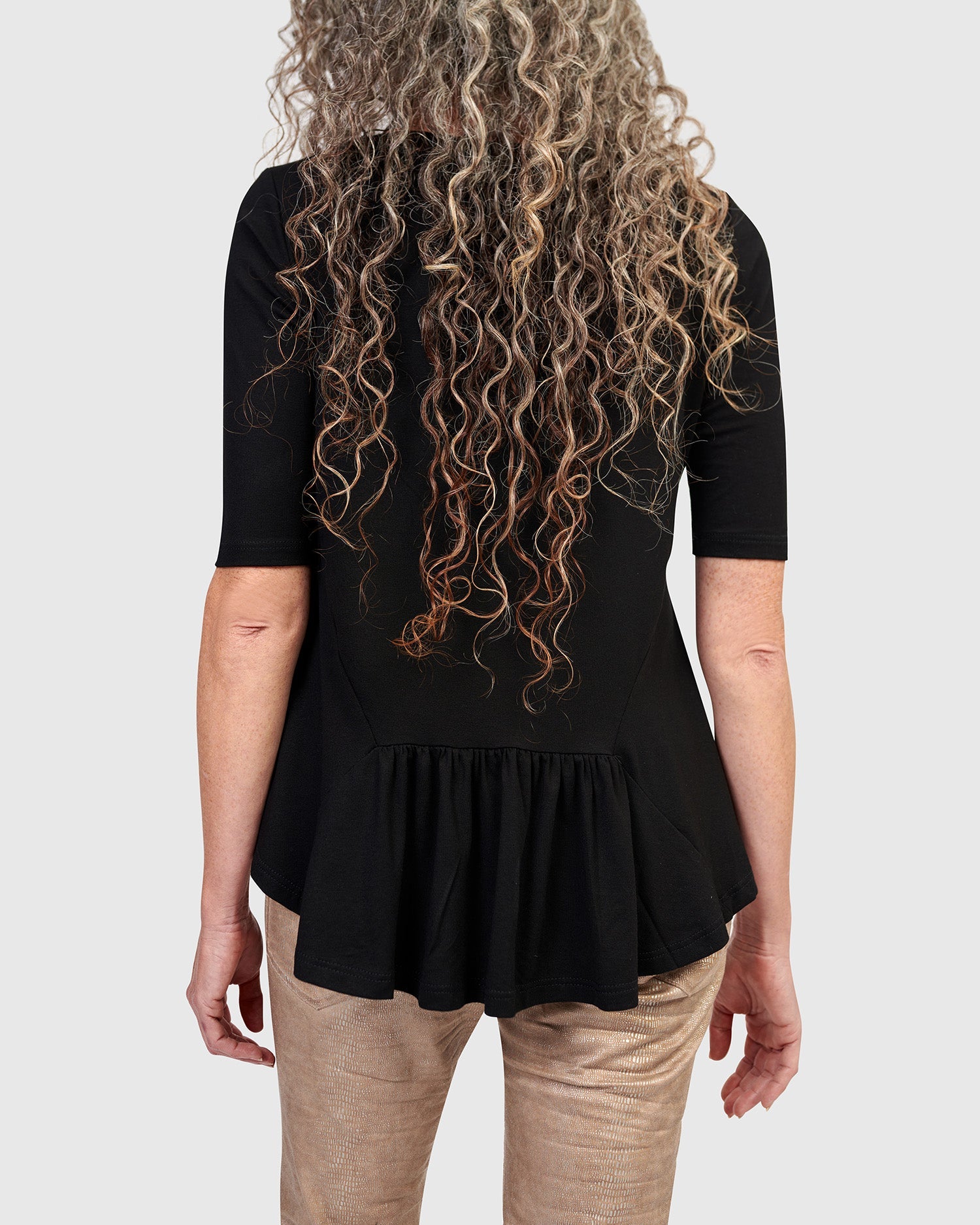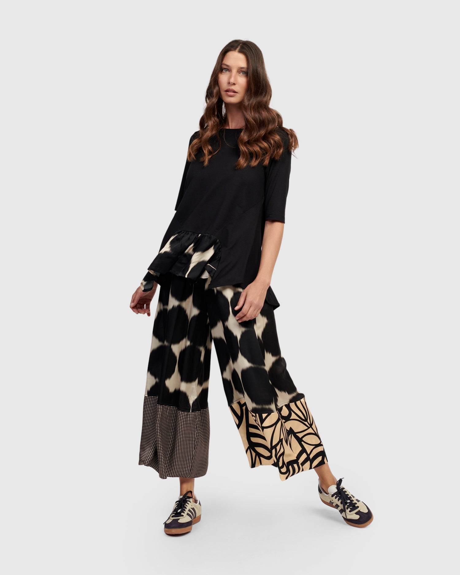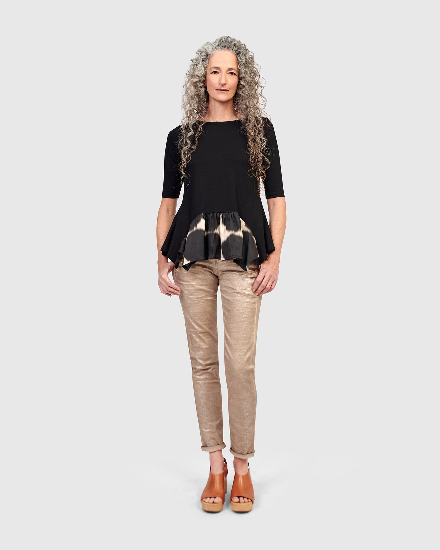 This fitted tee is made special with a flouncy hem pieced with a silky printed fabric, daring to elevate your outfit. Crafted in a stretchy jersey knit and has a wide crew neck, elbow length sleeves, hip length with plenty of swing.