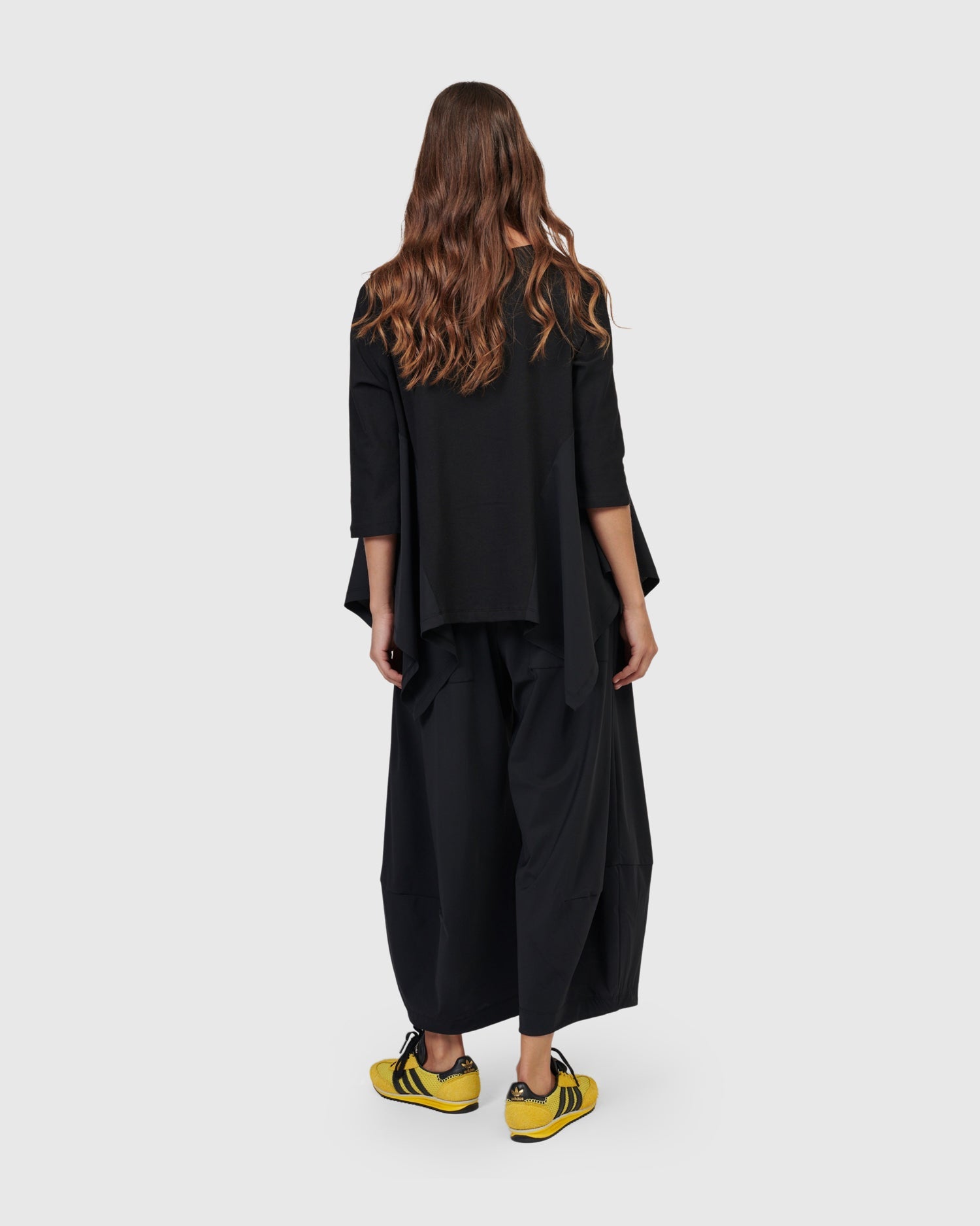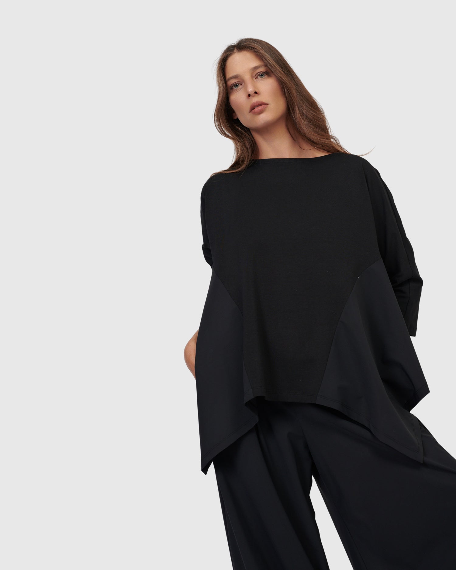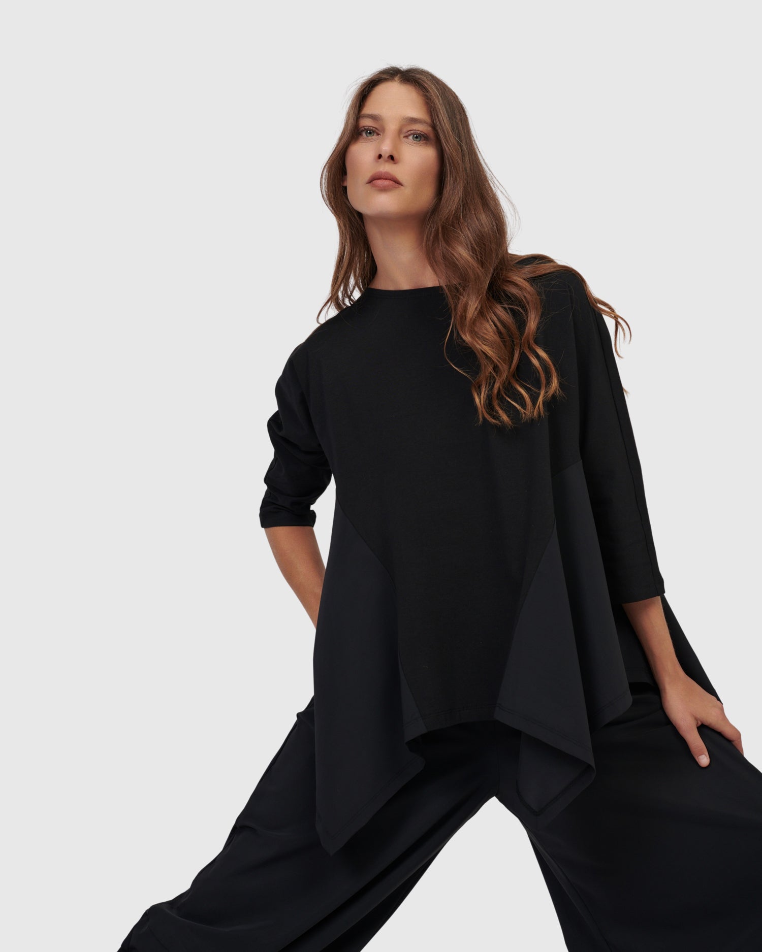 This easy pullover top is made in a stretch jersey knit with flowy TECHNO insets that fall into a true handkerchief hem. The loose fit and boxy silhouette allows for plenty of mobility and comfort. Three-quarter length sleeves, boat neck, cropped length.