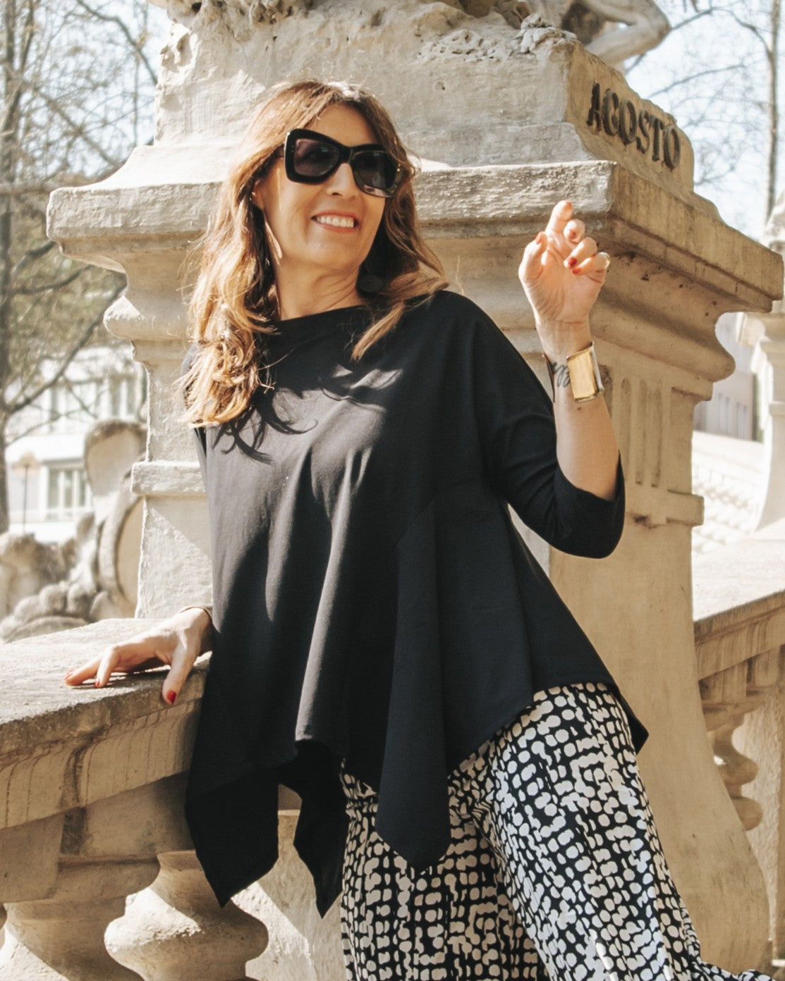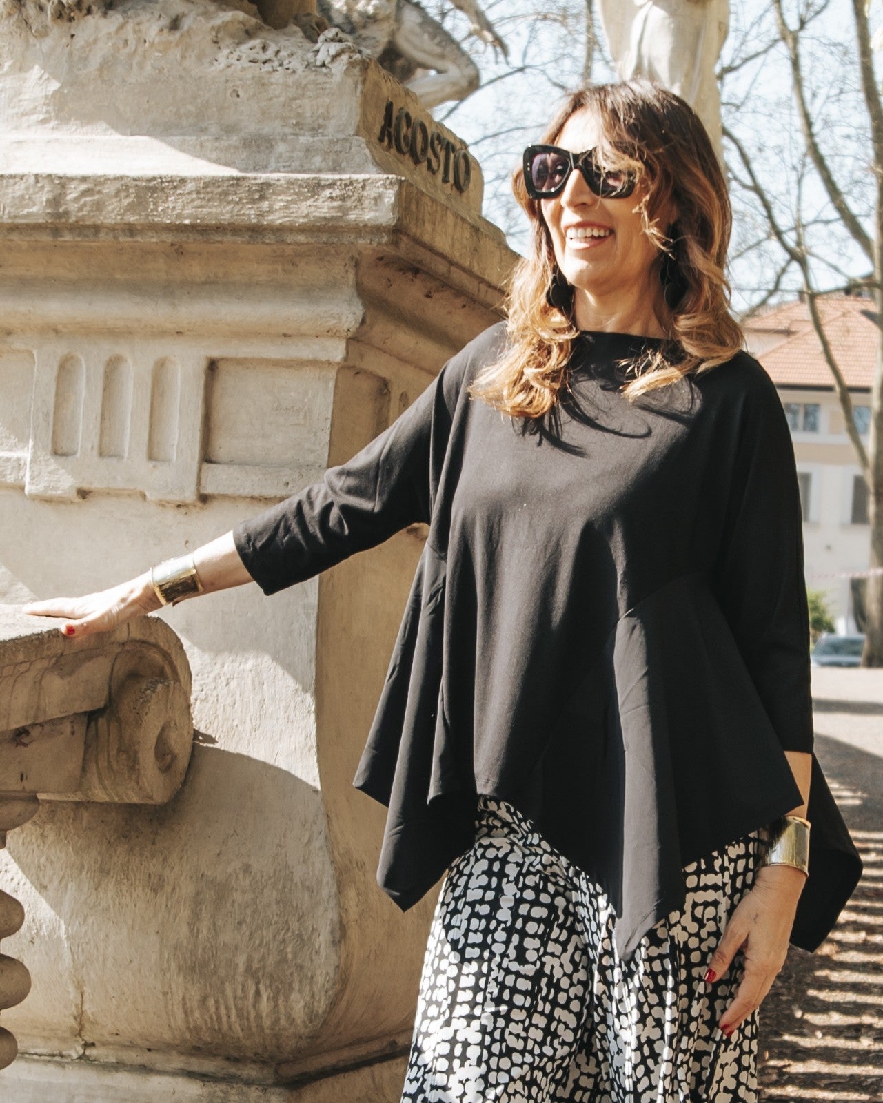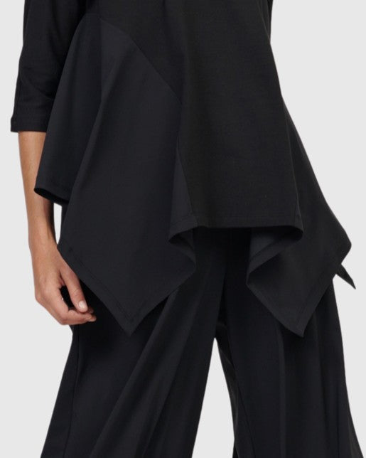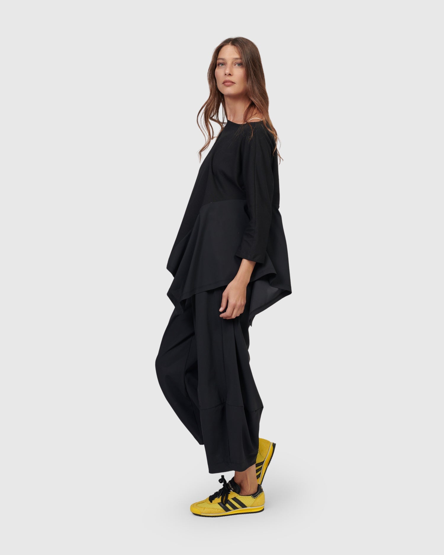 This easy pullover top is made in a stretch jersey knit with flowy TECHNO insets that fall into a true handkerchief hem. The loose fit and boxy silhouette allows for plenty of mobility and comfort. Three-quarter length sleeves, boat neck, cropped length.