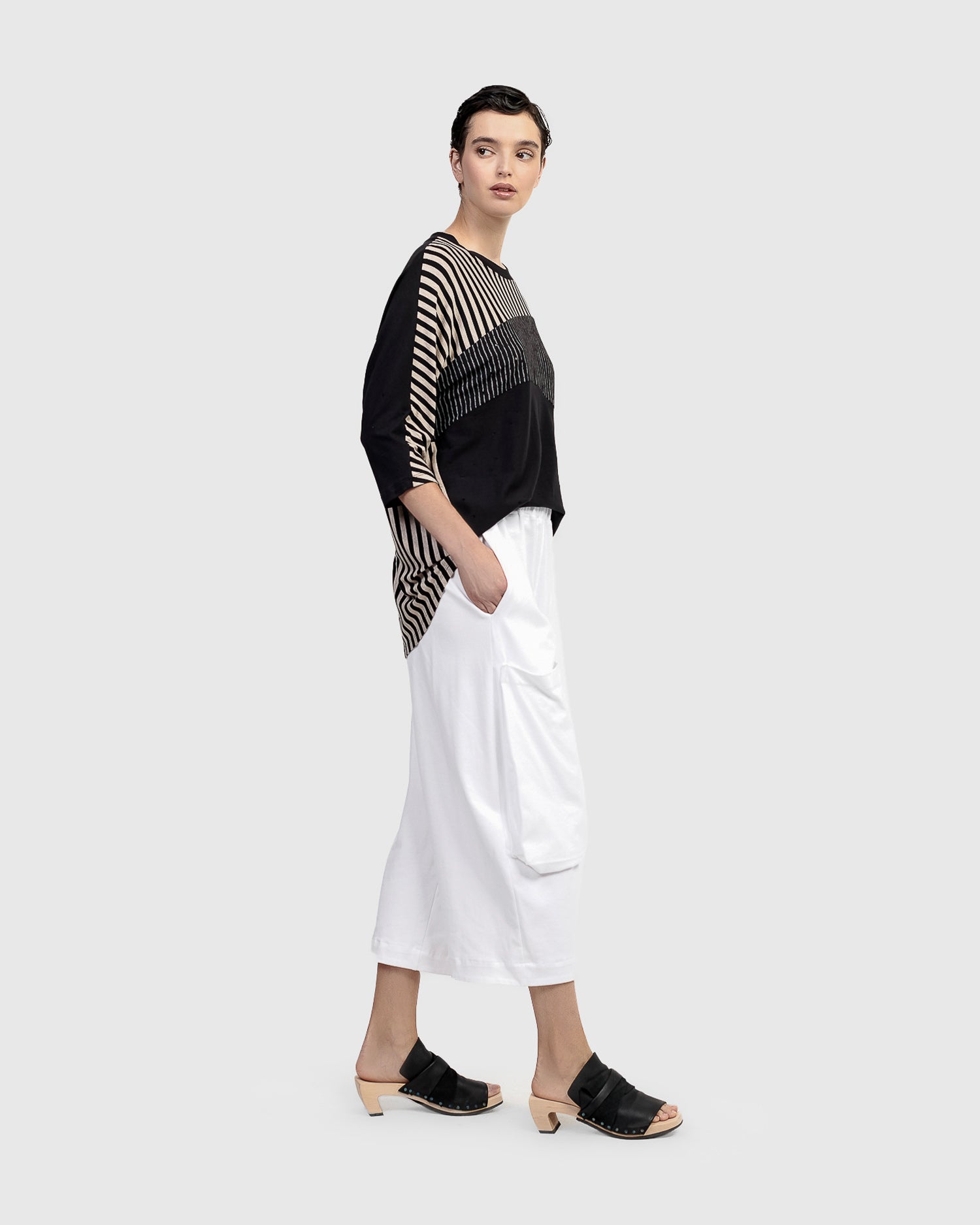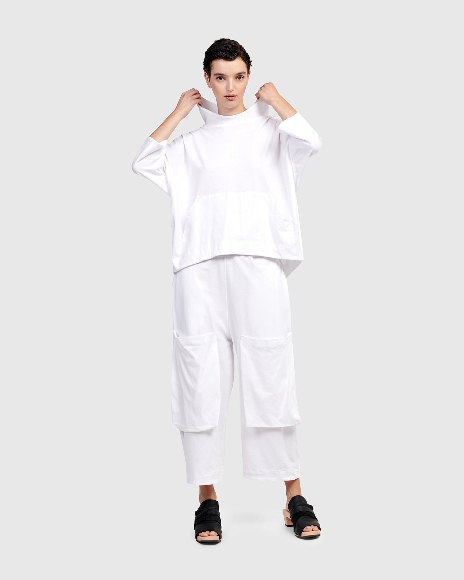 These high-waisted pants have an all-around elastic waist and a relaxed, straight cropped leg, finished with hidden in-seam side pockets and large front patch pockets. Made in a soft midweight cotton knit that will never sacrifice style for comfort.