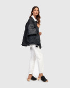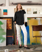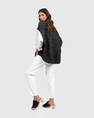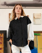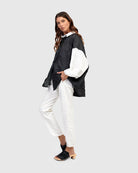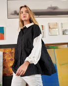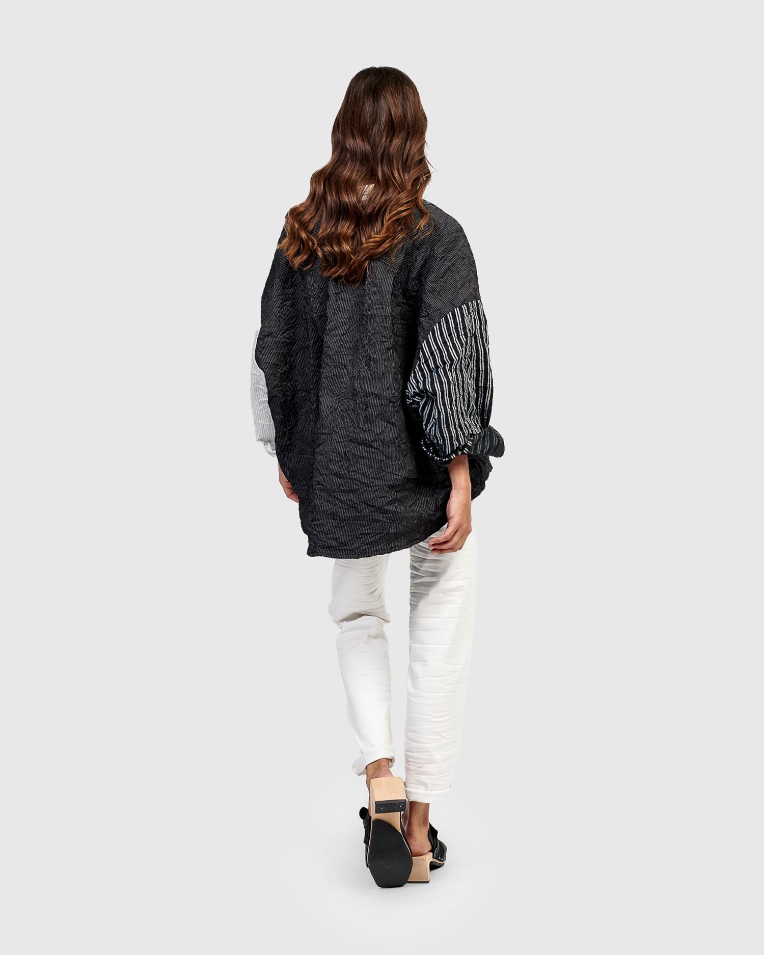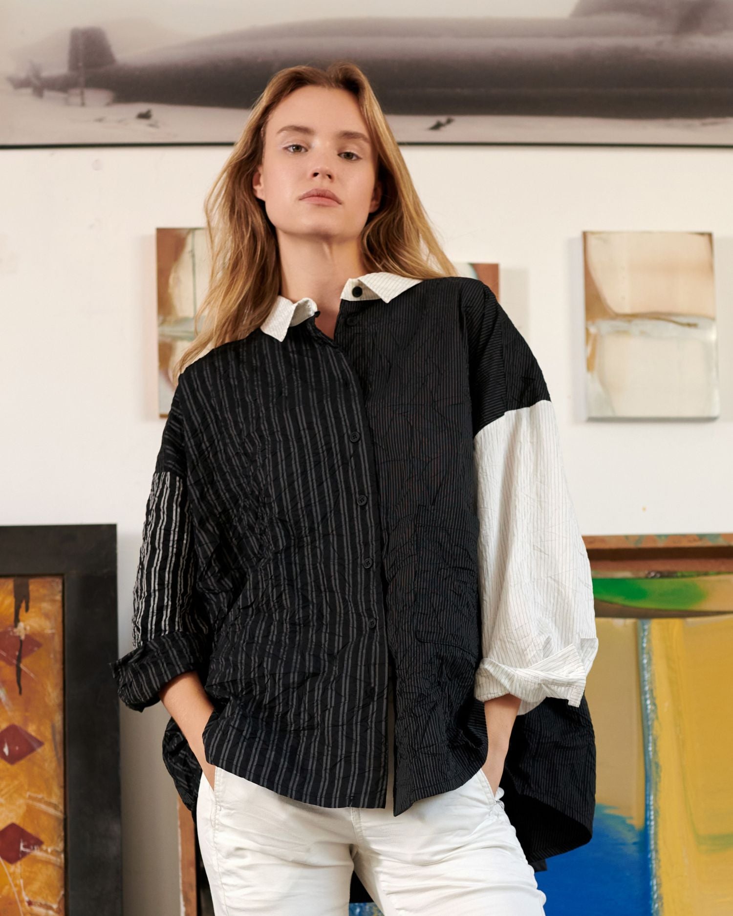 This oversized button down shirt is made in a lightweight, crinkled woven fabric and has a relaxed, boxy silhouette. Details include a full button placket with collar, drop shoulders, button cuff long sleeves, a front draped pocket, and a slight shirttail hem that falls below the hip.