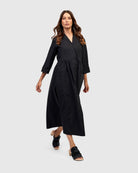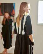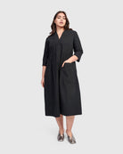 This midi dress has a relaxed fit with an A-line silhouette and babydoll waist, giving a chic prairie-style vibe in front with a contrast abstract print on back. V-neck, front patch pockets, three-quarter length sleeves. Made in a lightweight cotton woven.