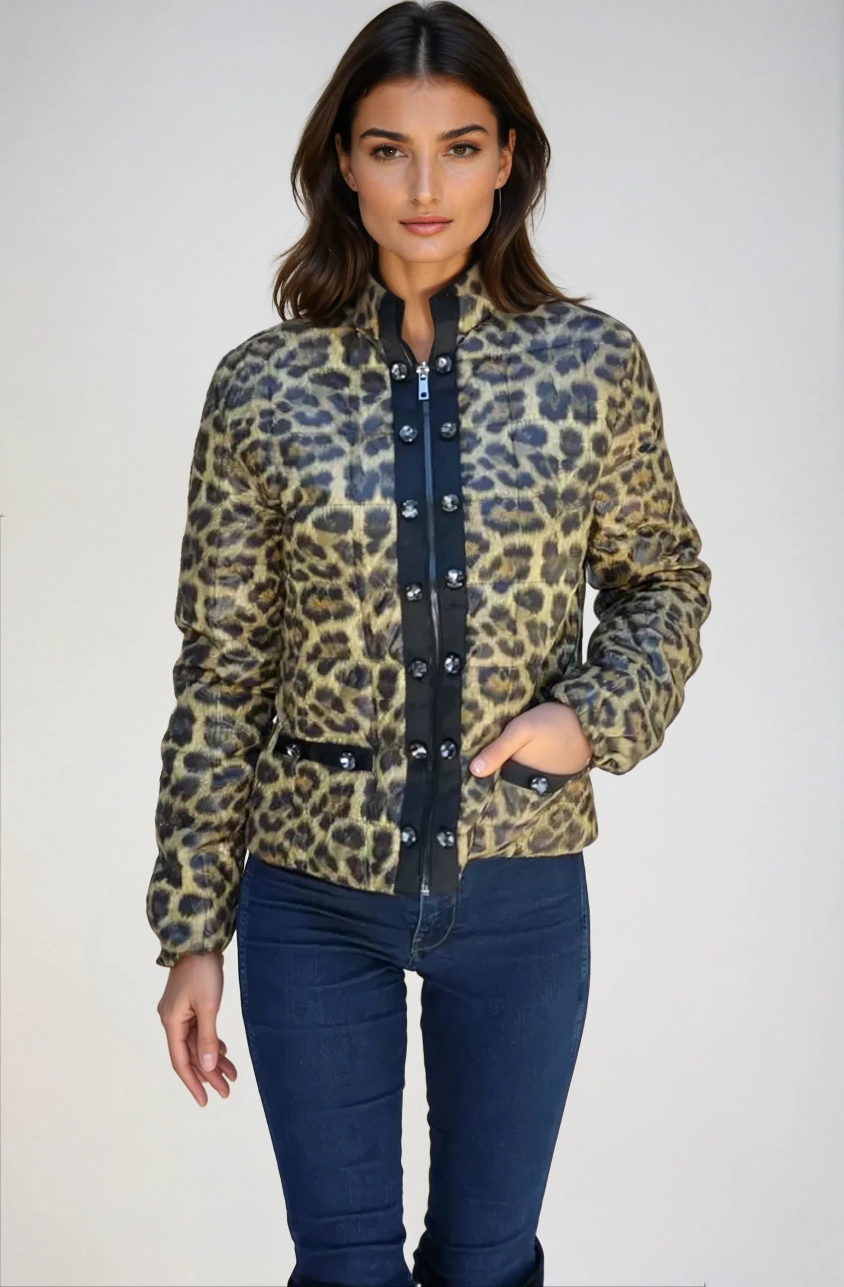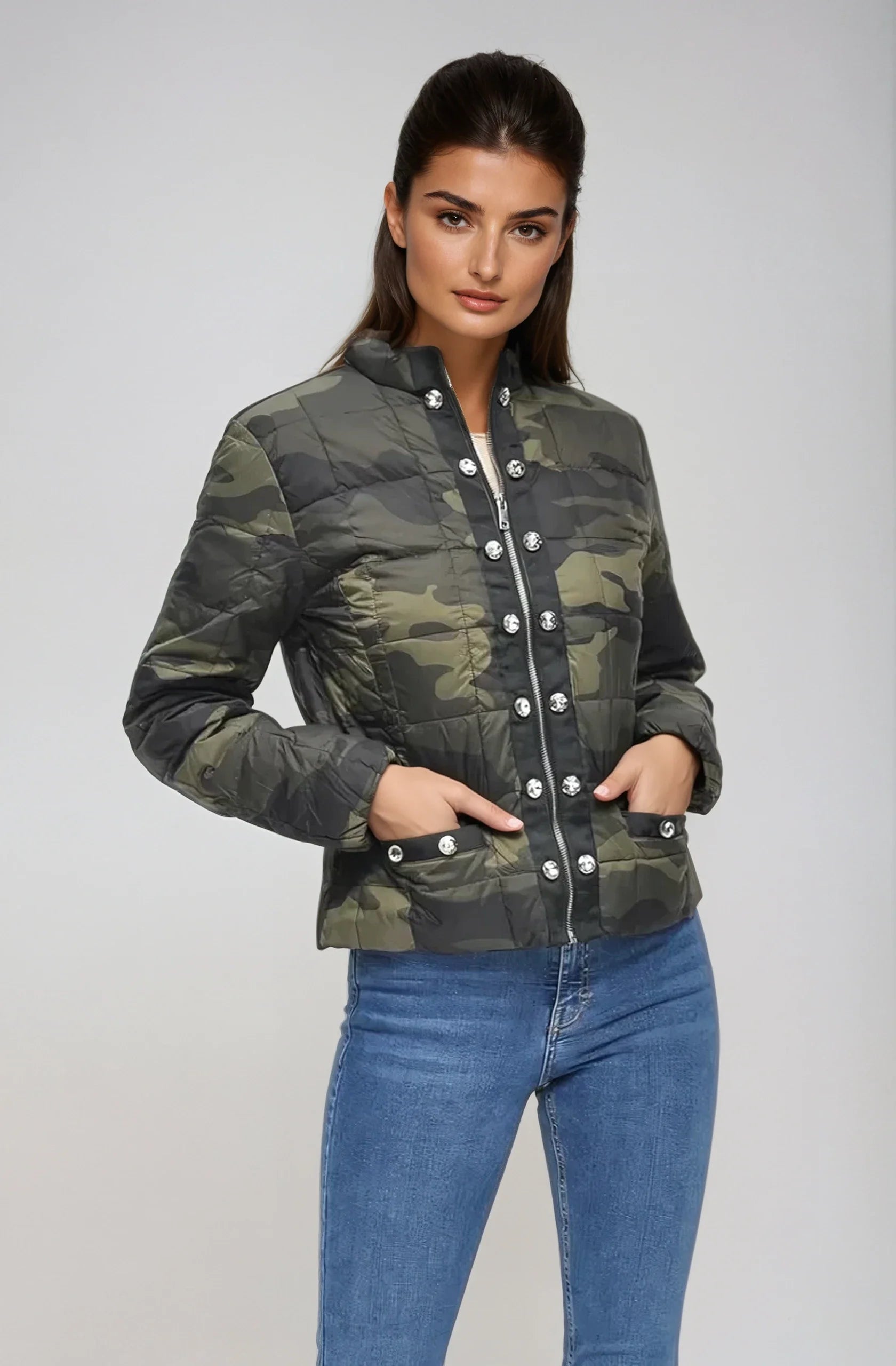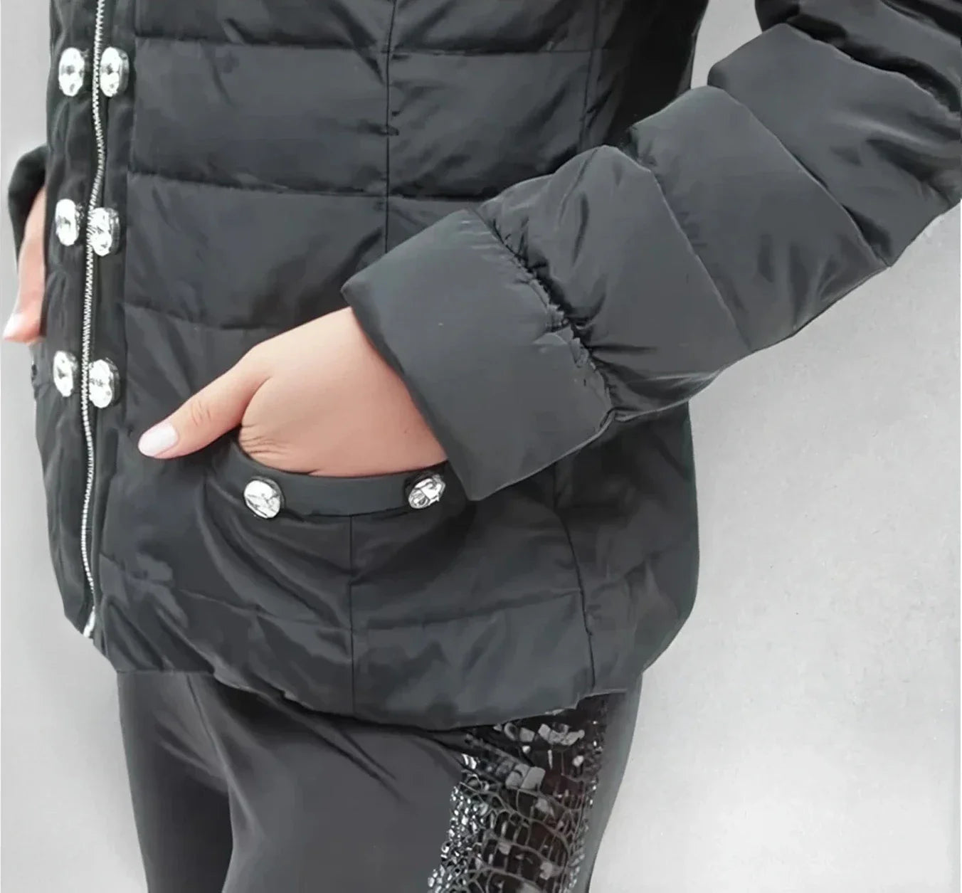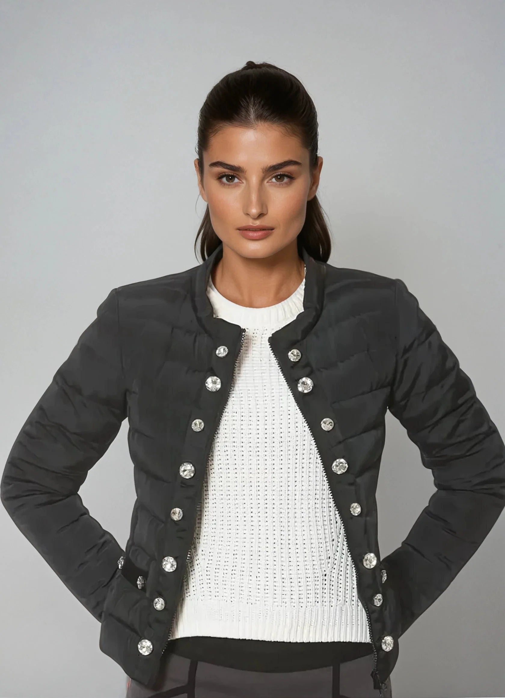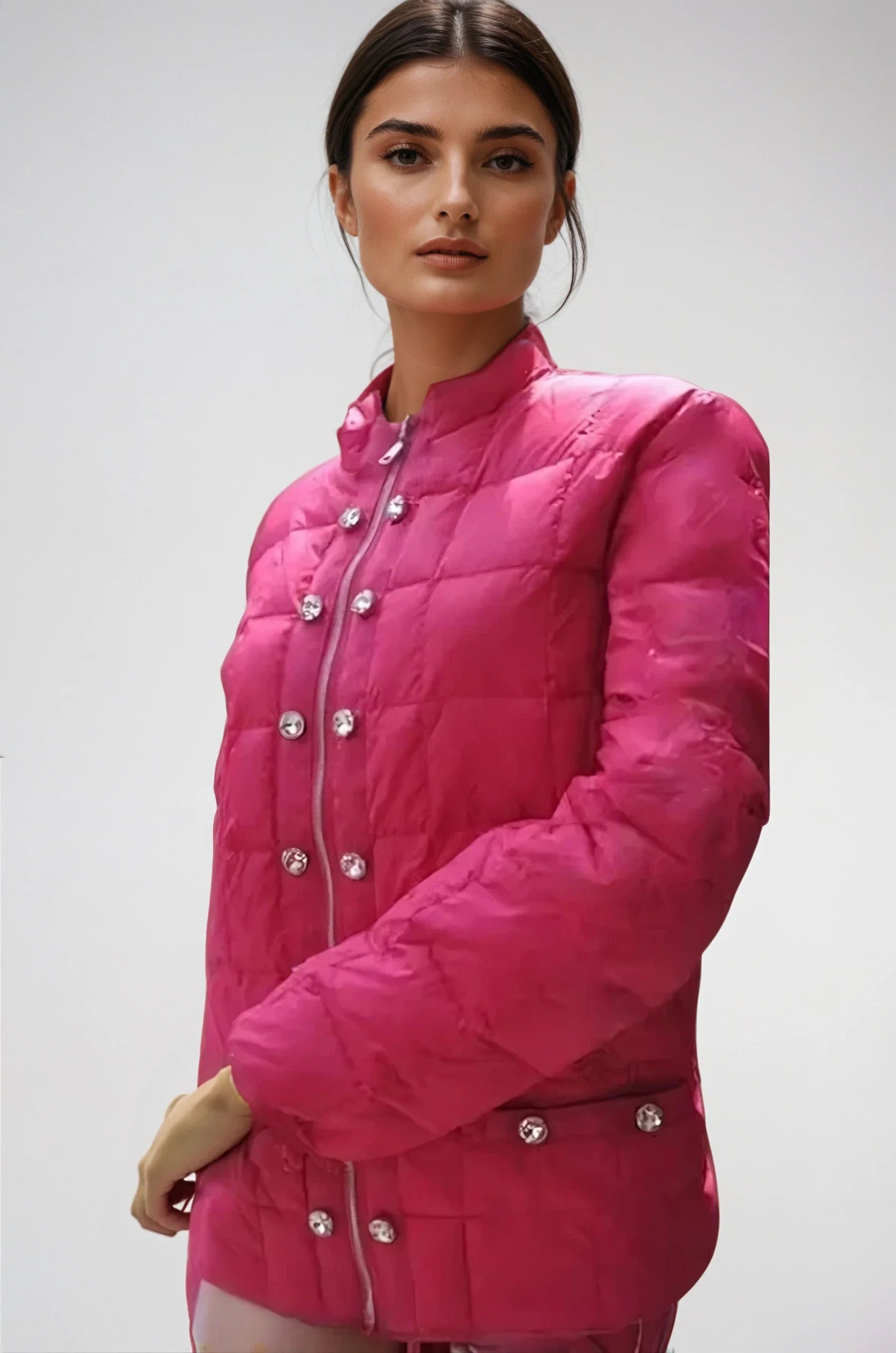 style Lia - same as style LIA but 1/2 the weight and slightly smaller buttons for that lightweight look. Down filled. Water resistance shell.