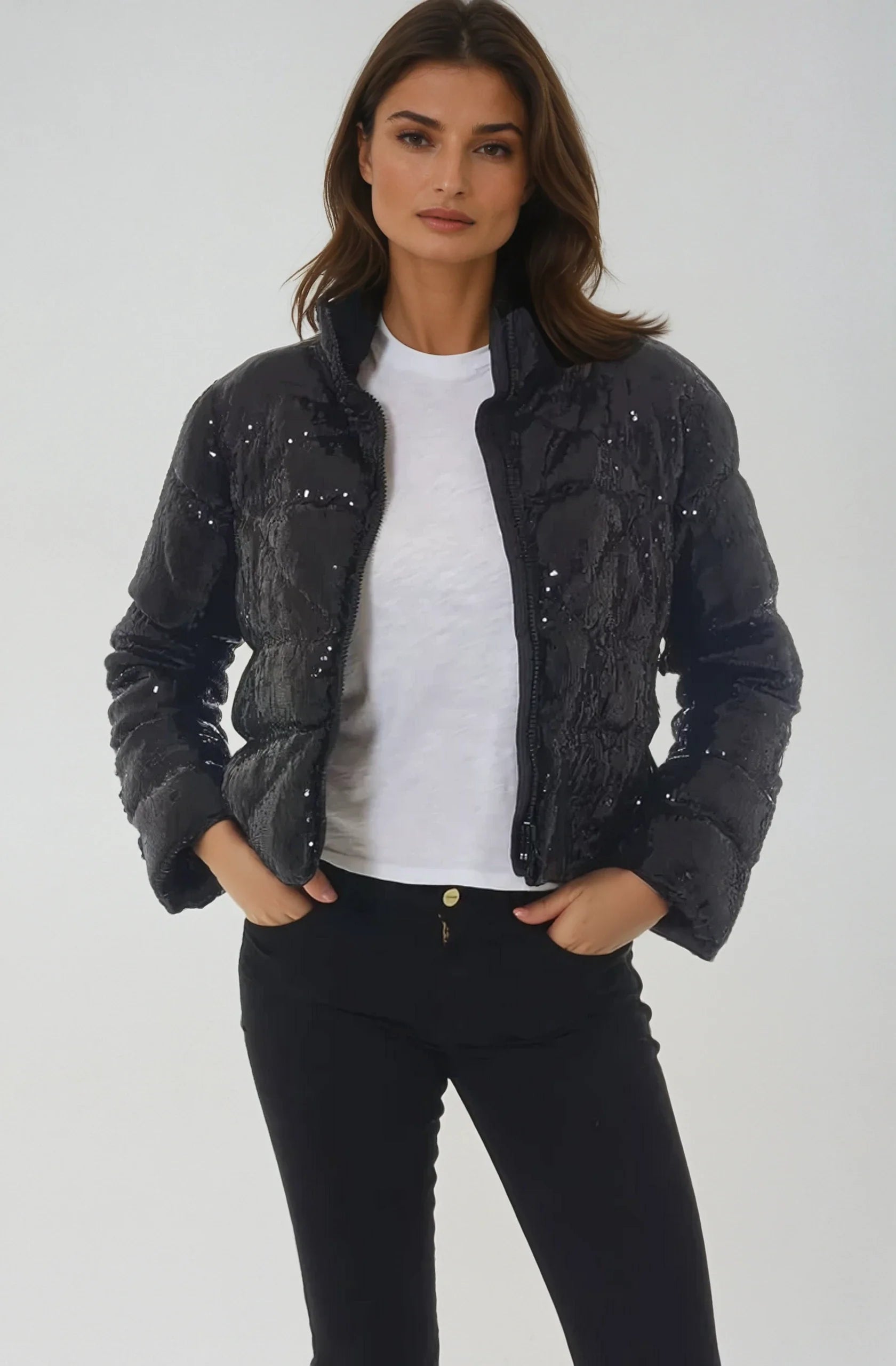 style RINA - Going somewhere casual fancy or very fancy? Temperature 40 to 60 degrees. Tired of your frumpy over-priced Northface or boring Canadian Goose? Rina is for you with its soft velvet inter-lining and color. Rich glittering finish will set you apart from the crowd, of course. Bell sleeves.