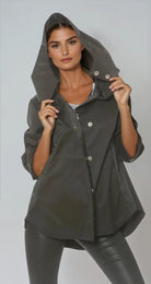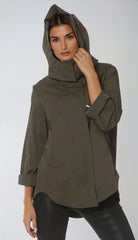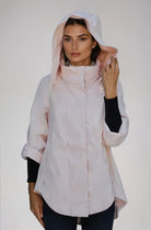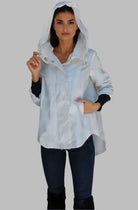 style SAVINA Same fabric and hardware as TESS but with a very sophisticated zip off hood.  It has the same adjustable sleeves that can be left at full length or cuffed and snapped to a fashionable ¾ sleeve.  Hidden side pockets on each side of the jacket are also well placed. SAVINA is unlined with taped seams and the length is shorter in the front than the back.  Fabric has a cotton feel to it.  Cotton Poly Lycra blend.
