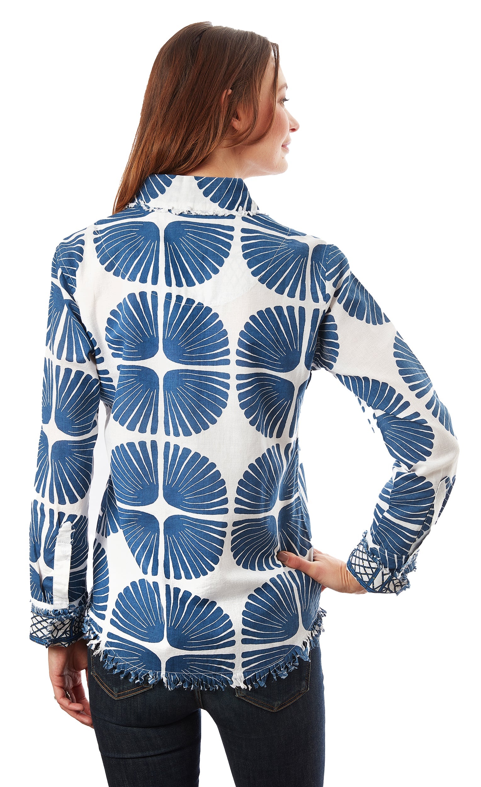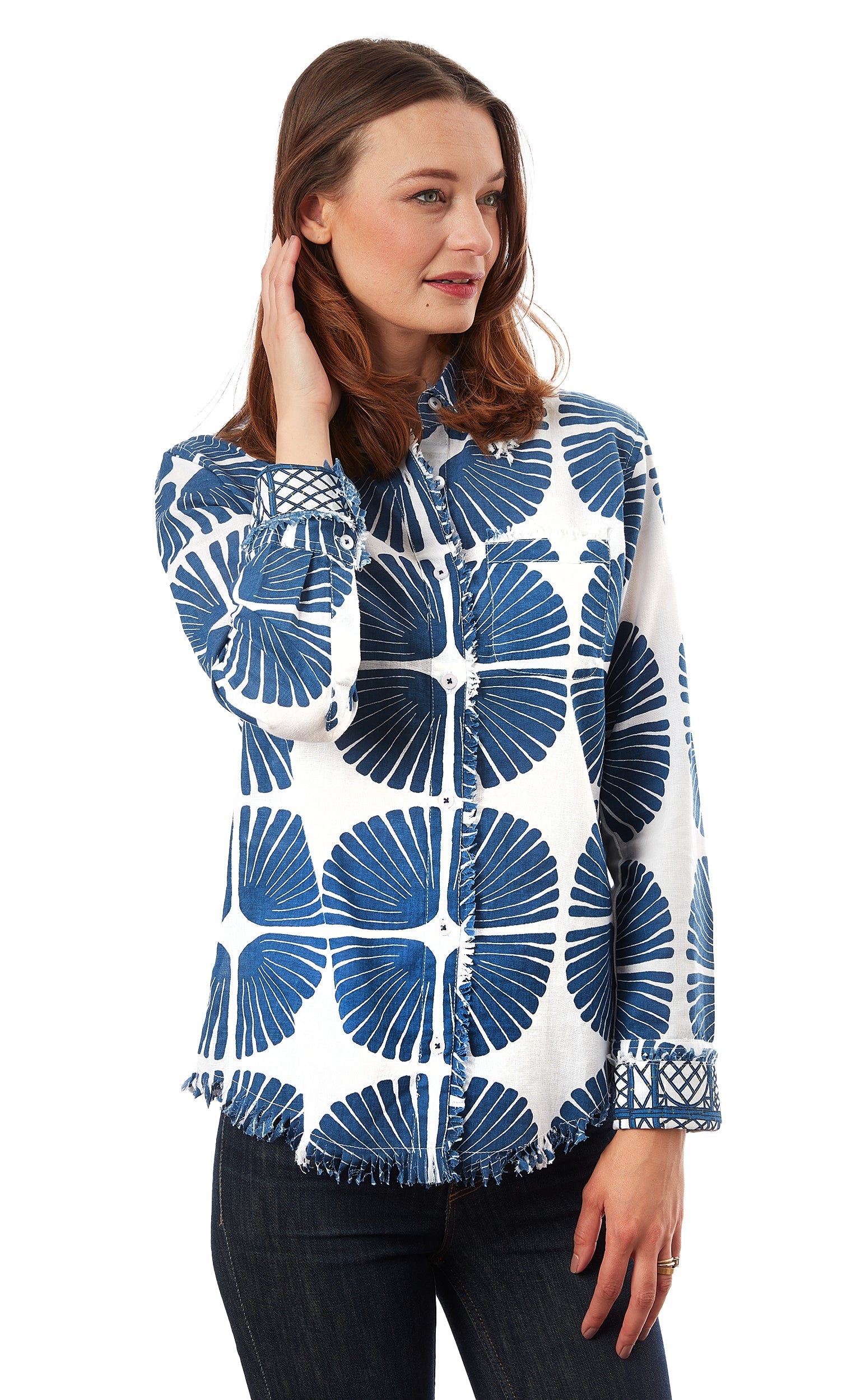 Cape Cod fringed bottom top, navy white palm fronds, excellent combo, love it!