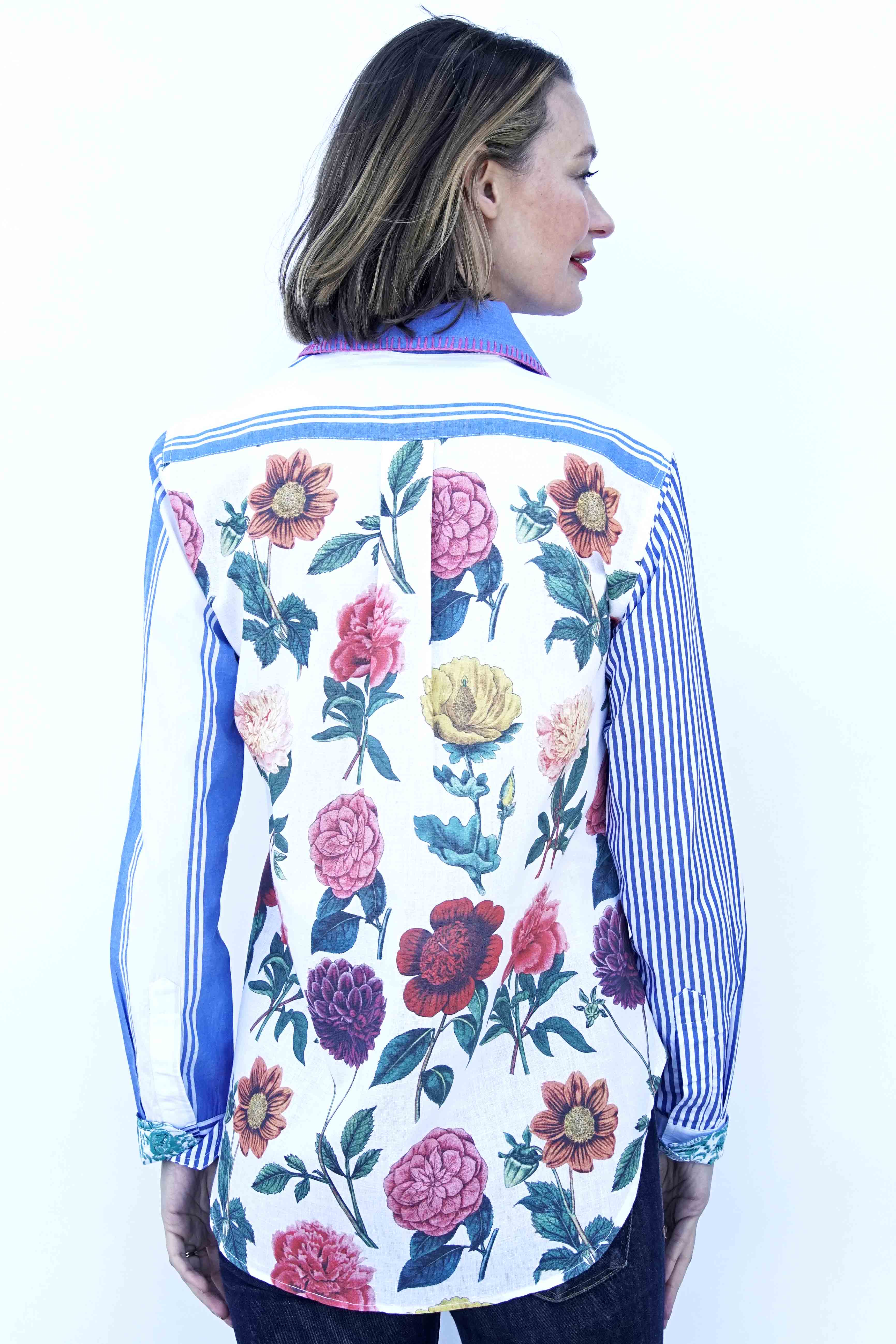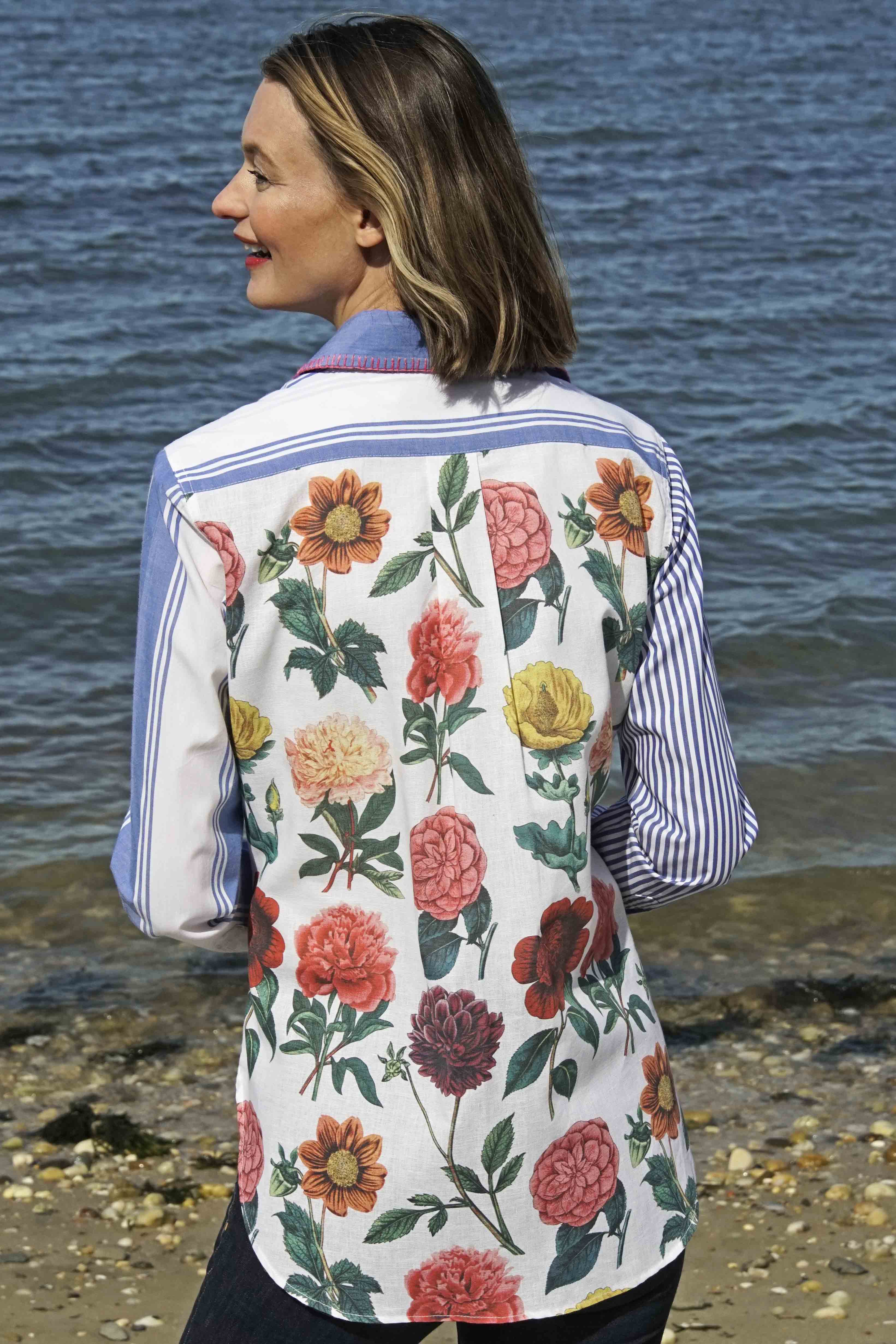 Madison Top Stripes And Flowers w Whipstitch At Collar. This is a new silhouette for Dizzy Lizzie. Based on the style 402 Rome fit, it has a high low finish on the front and back. Yarn-dyed variegated stripes for the front panel and sleeves, and the back is botanical linen cotton print. It's so lovely with white jeans on a cool day!