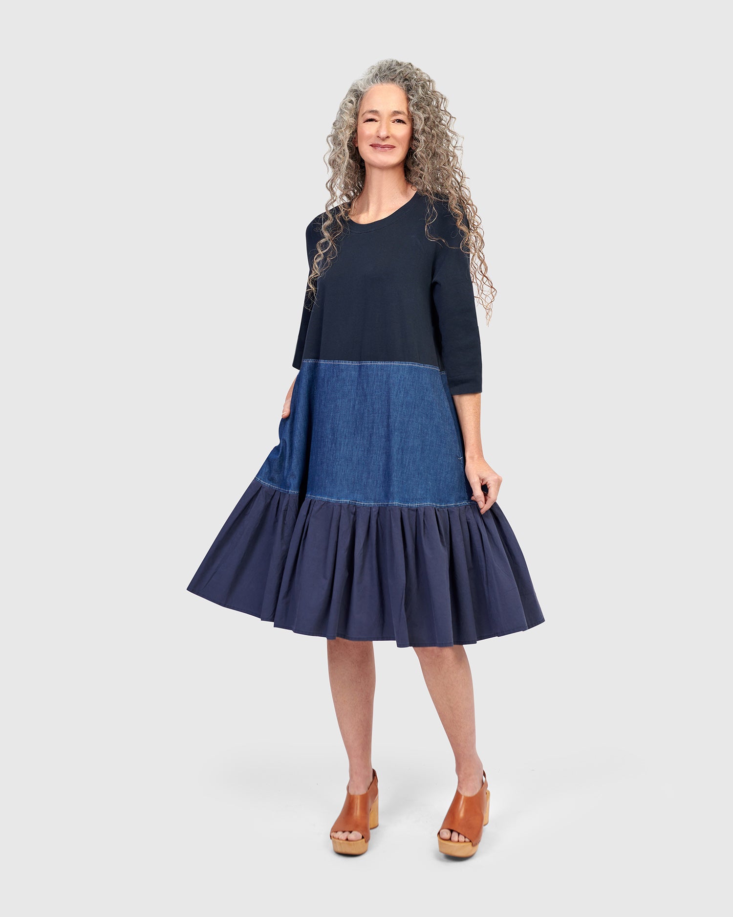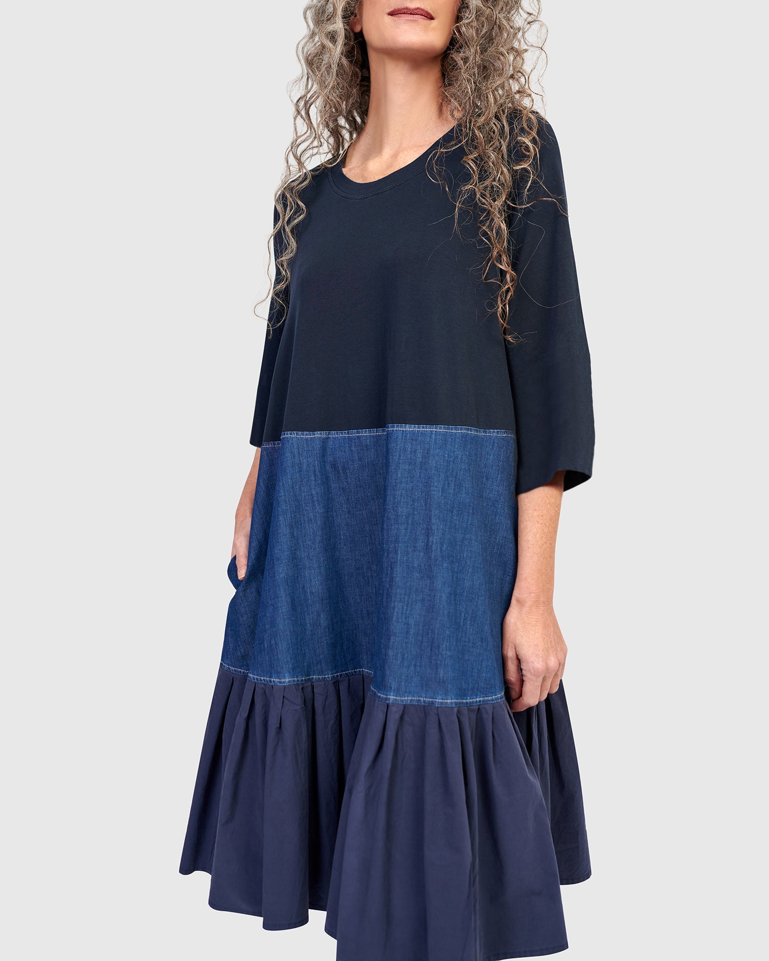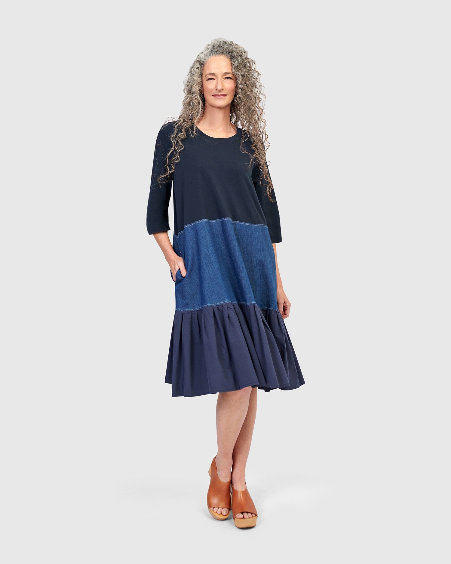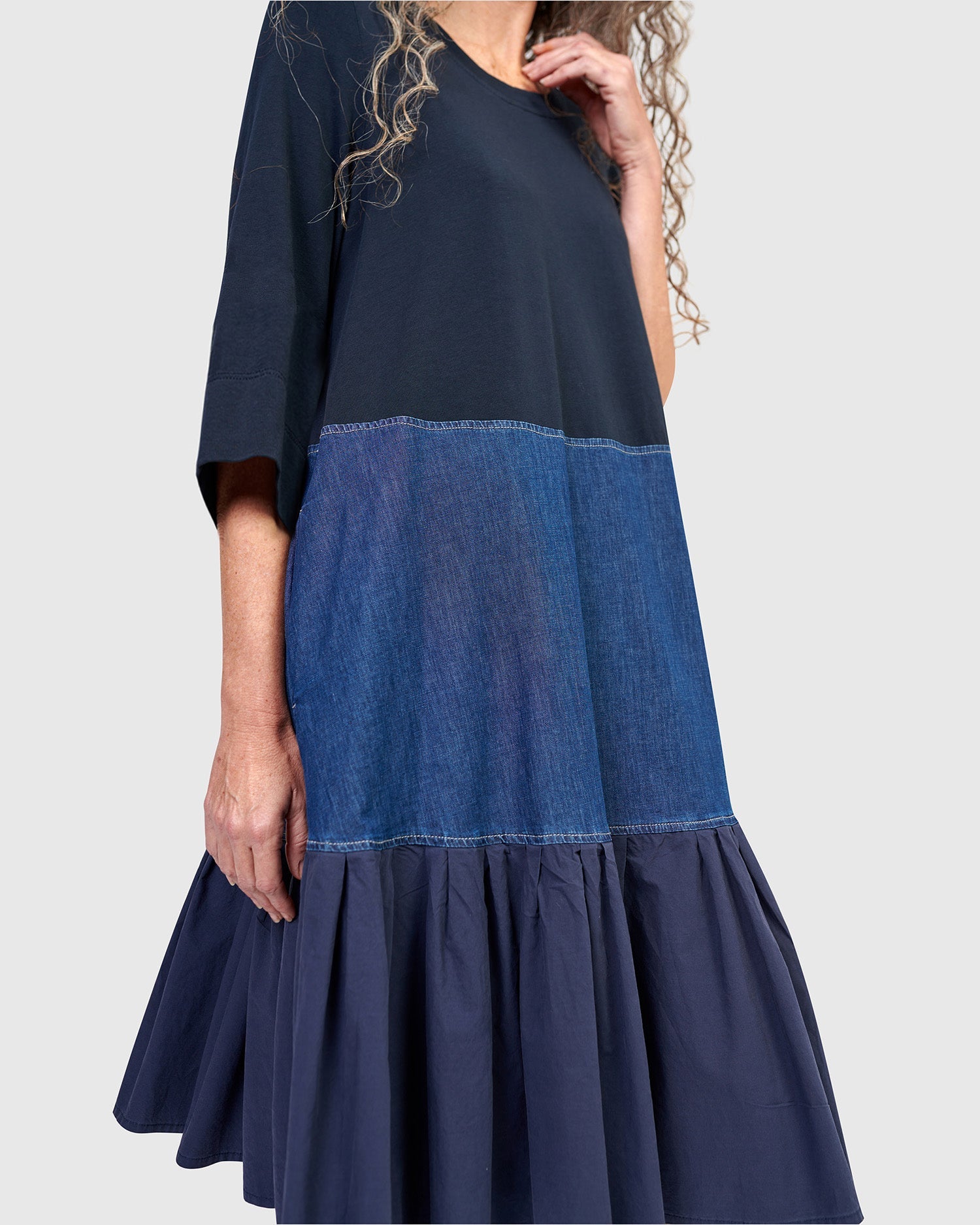 This pullover midi dress is made in a soft jersey knit with tiers of denim and cotton poplin. It has a crew neck, elbow length sleeves, and side pockets. The relaxed fit and A-line silhouette make this an easy dress for everyday wear.