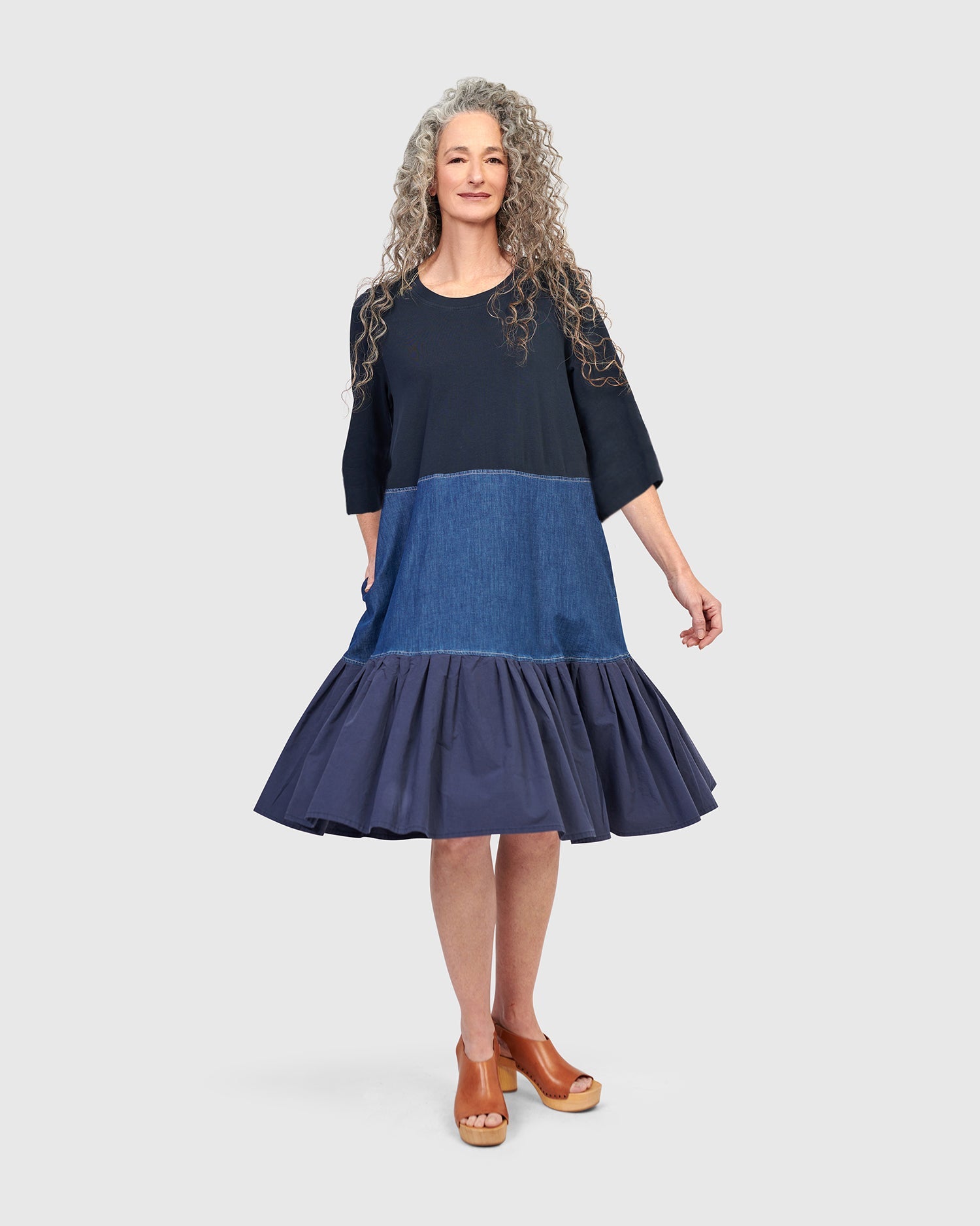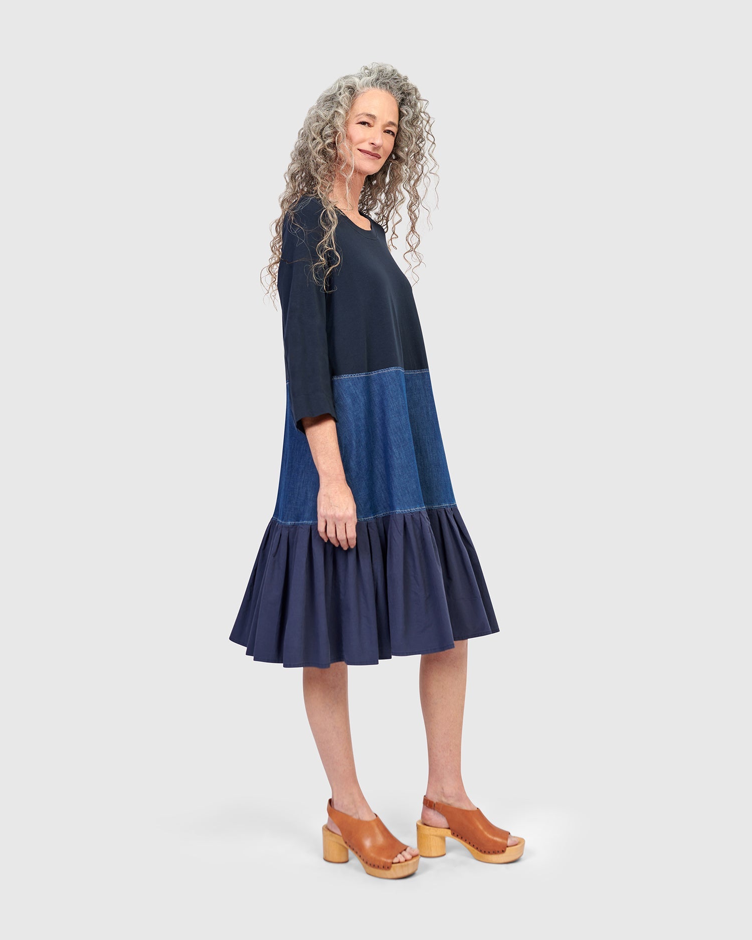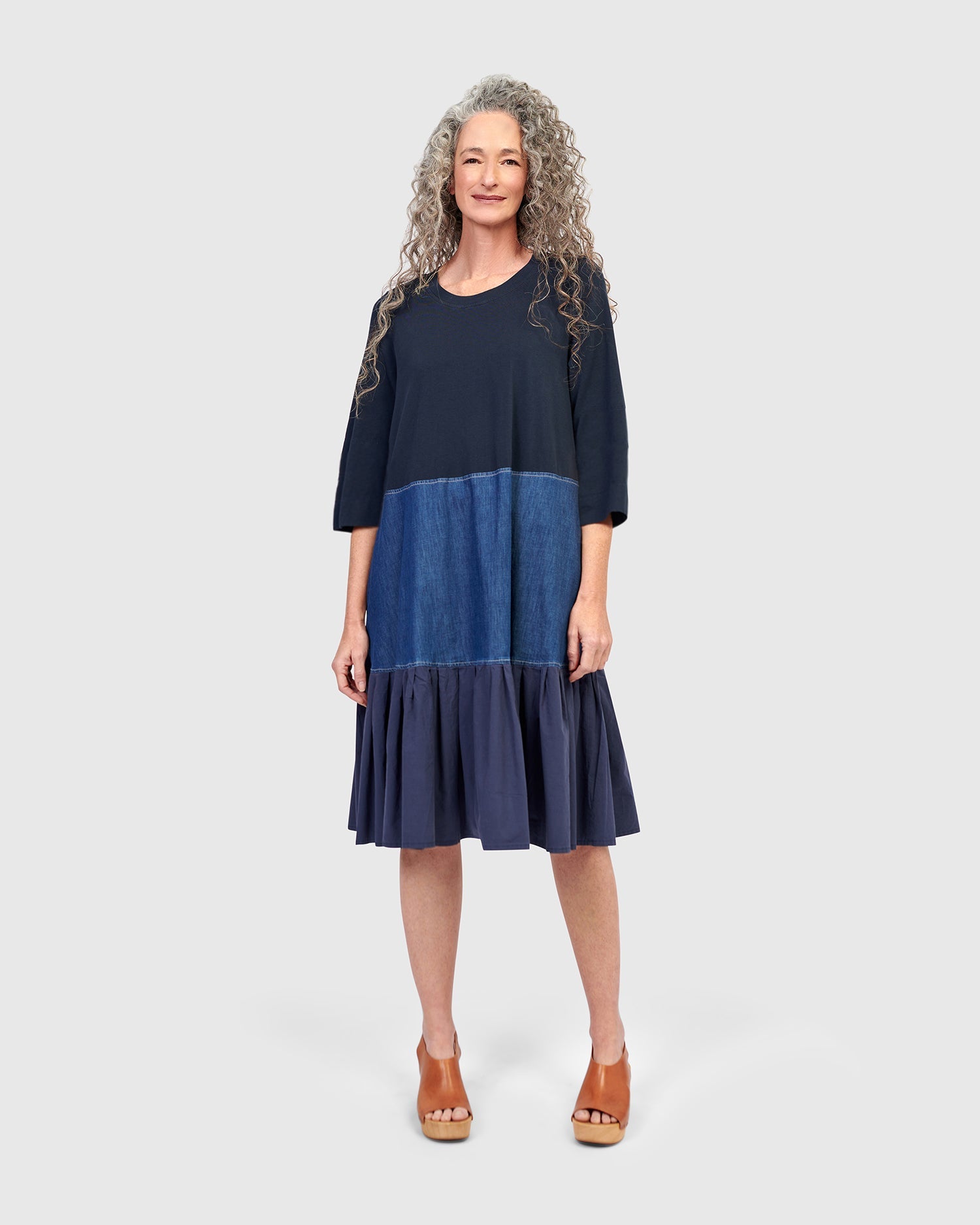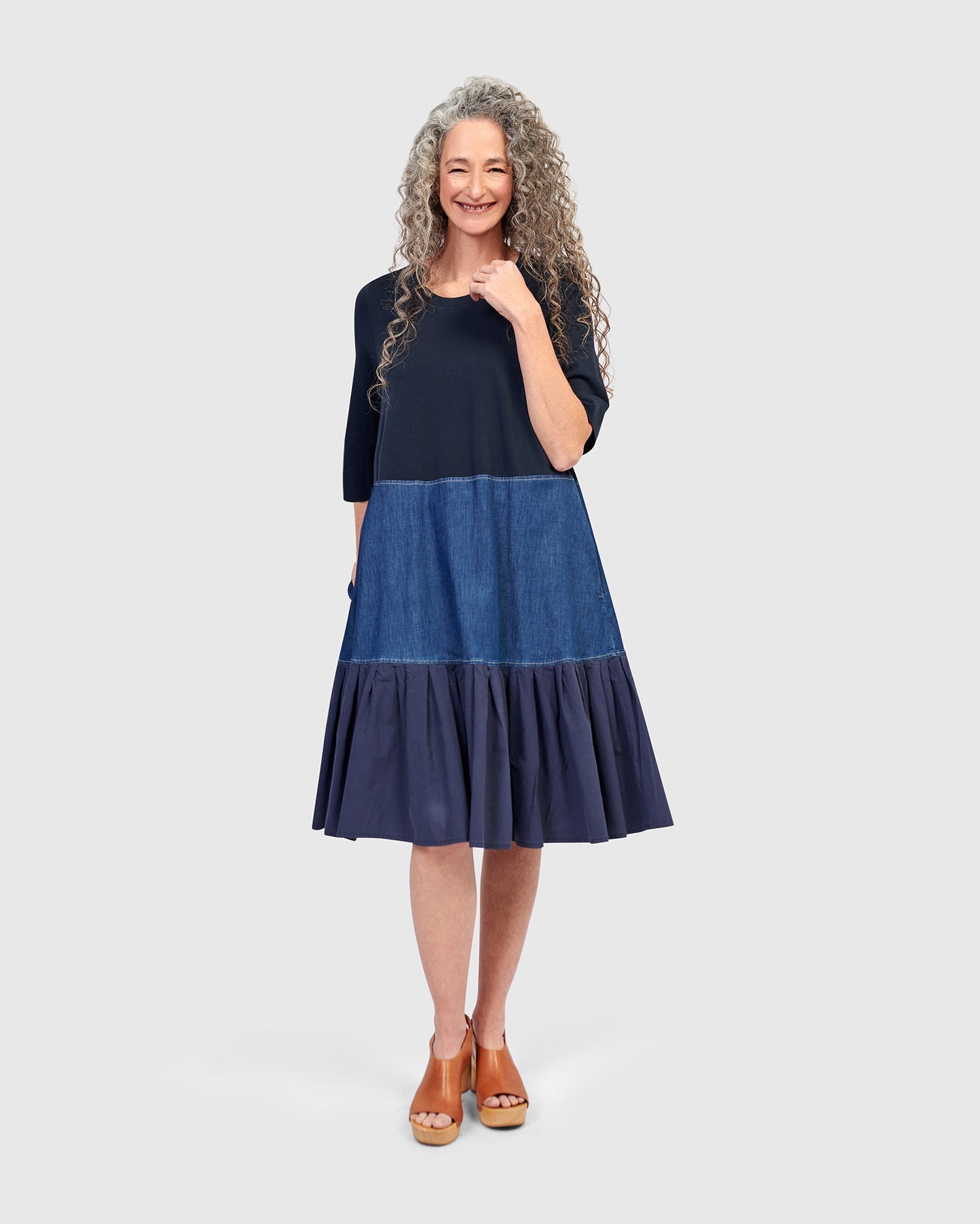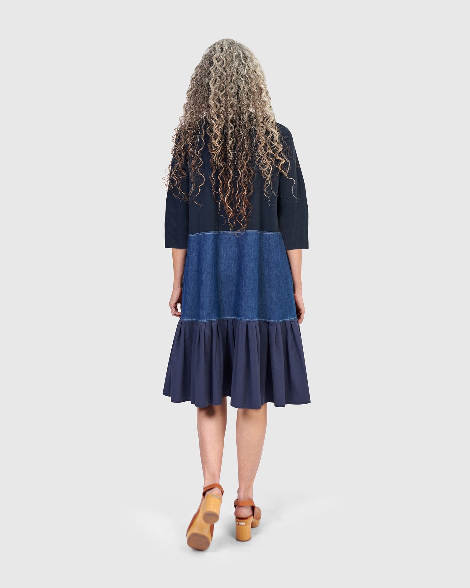 This pullover midi dress is made in a soft jersey knit with tiers of denim and cotton poplin. It has a crew neck, elbow length sleeves, and side pockets. The relaxed fit and A-line silhouette make this an easy dress for everyday wear.
