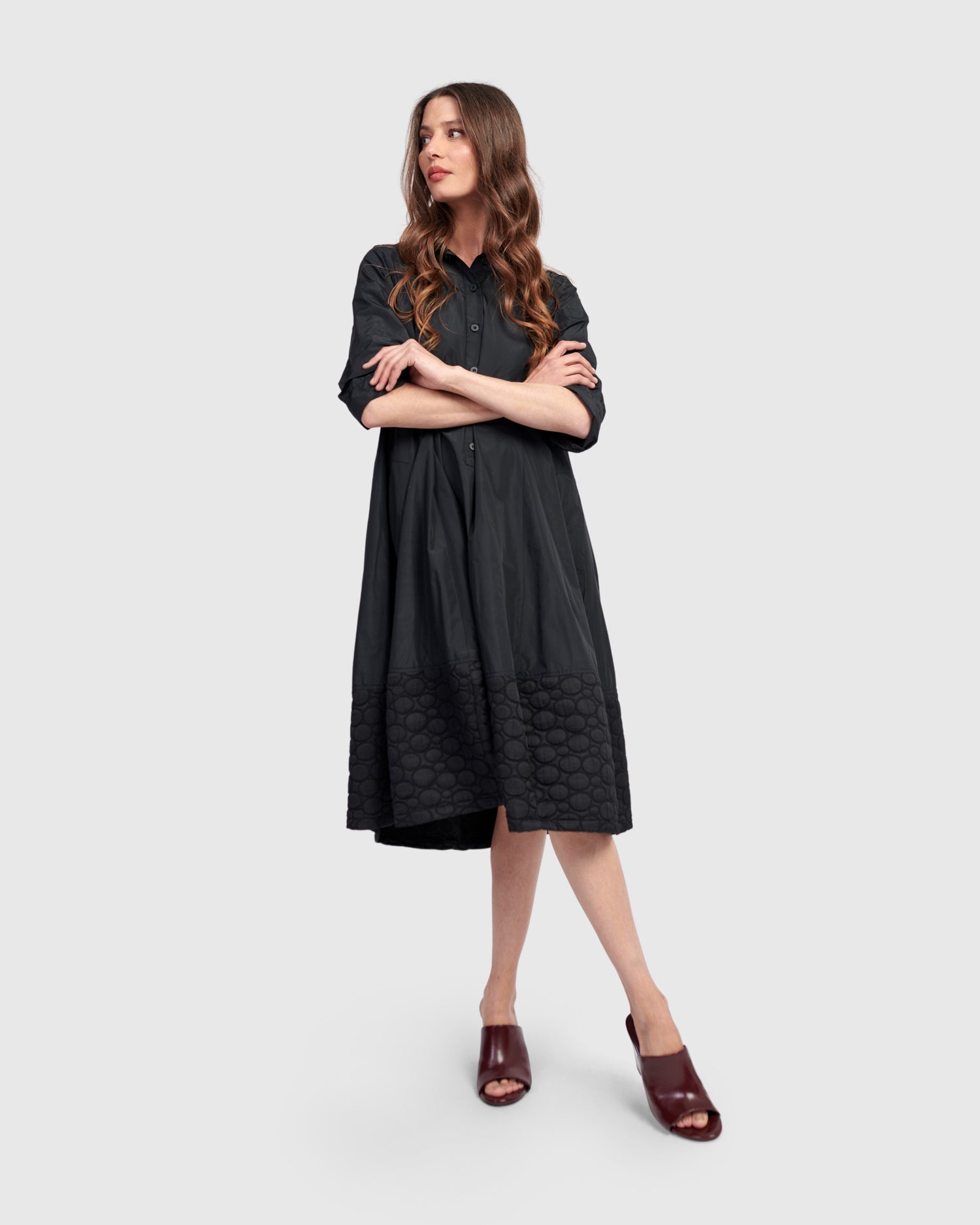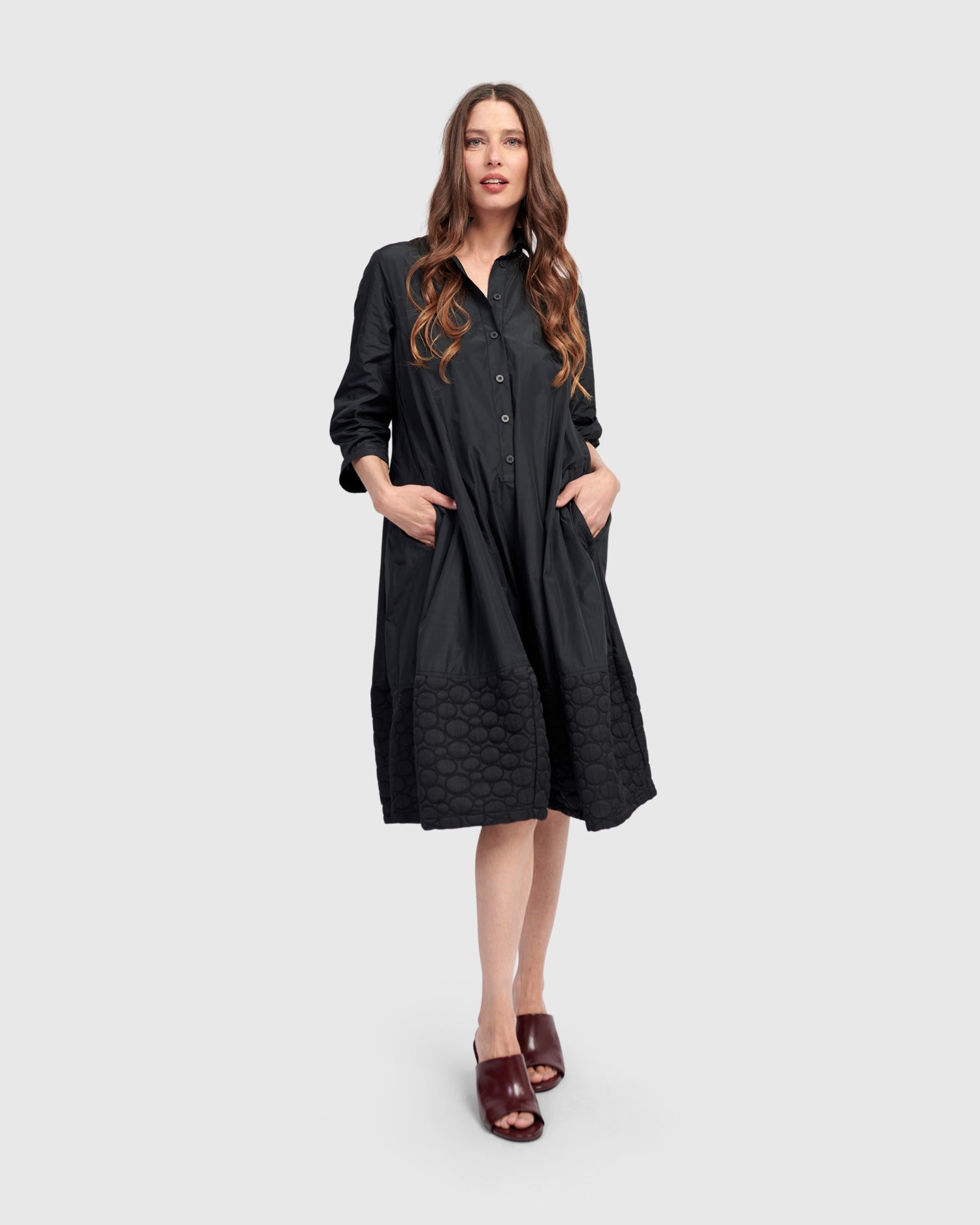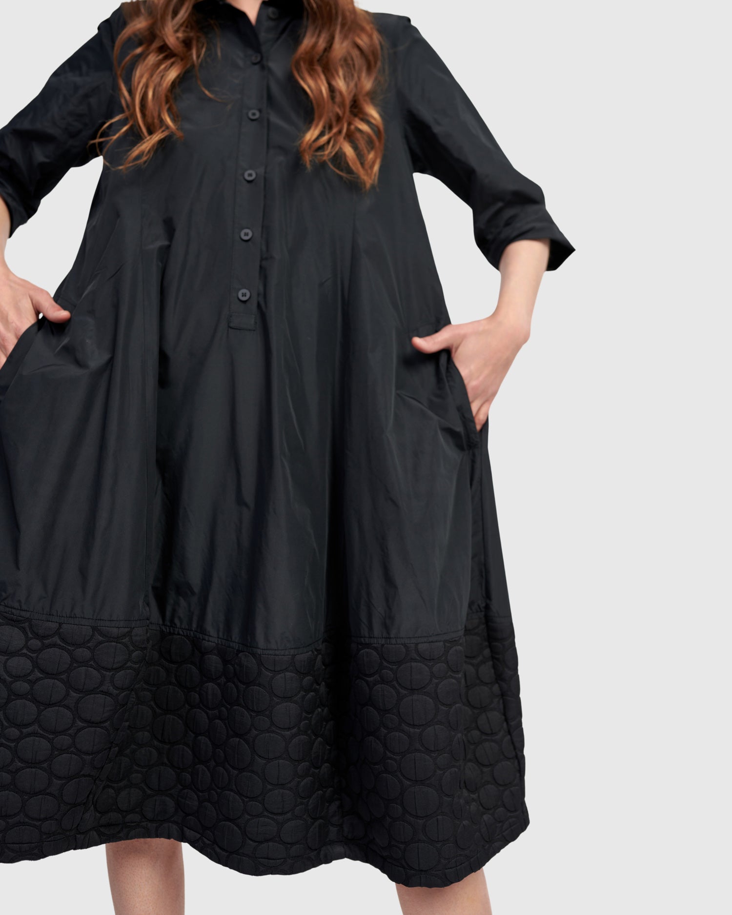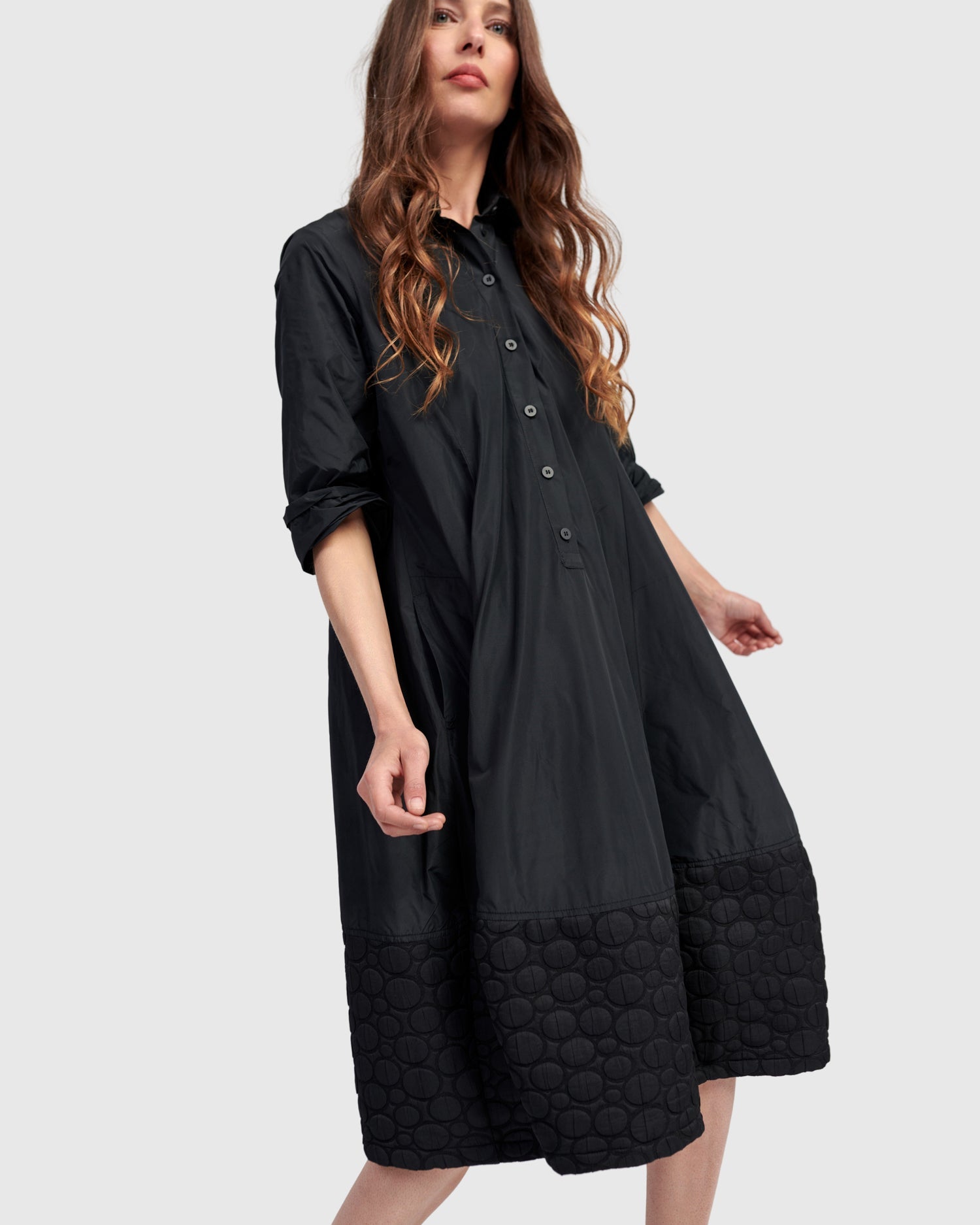 Made in a crisp woven taffeta with textured jacquard detailing at the hem, this relaxed shirt dress is fitted across bust and shoulders with tailored seaming, then flares out at waist and falls into cocoon skirting. Foldover collar with half button placket, three quarter length sleeves, side pockets, knee length.
