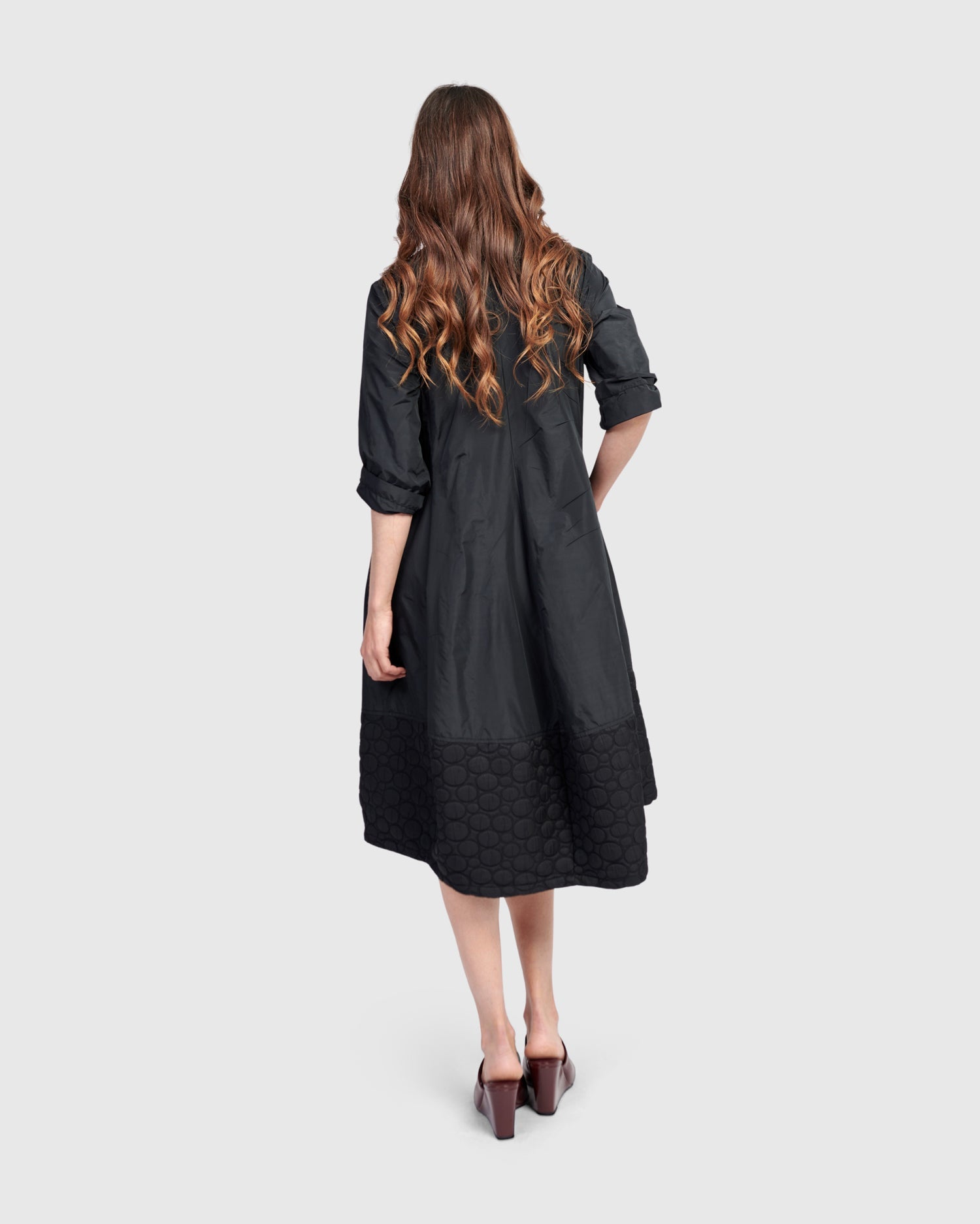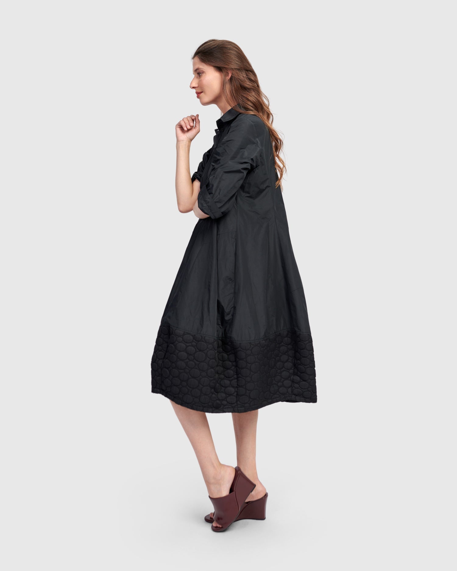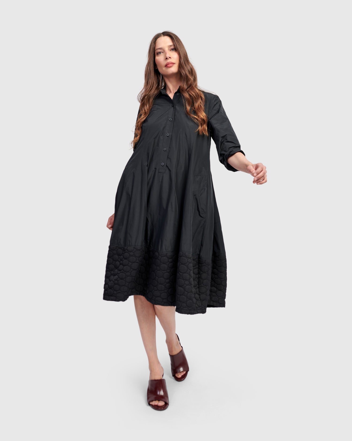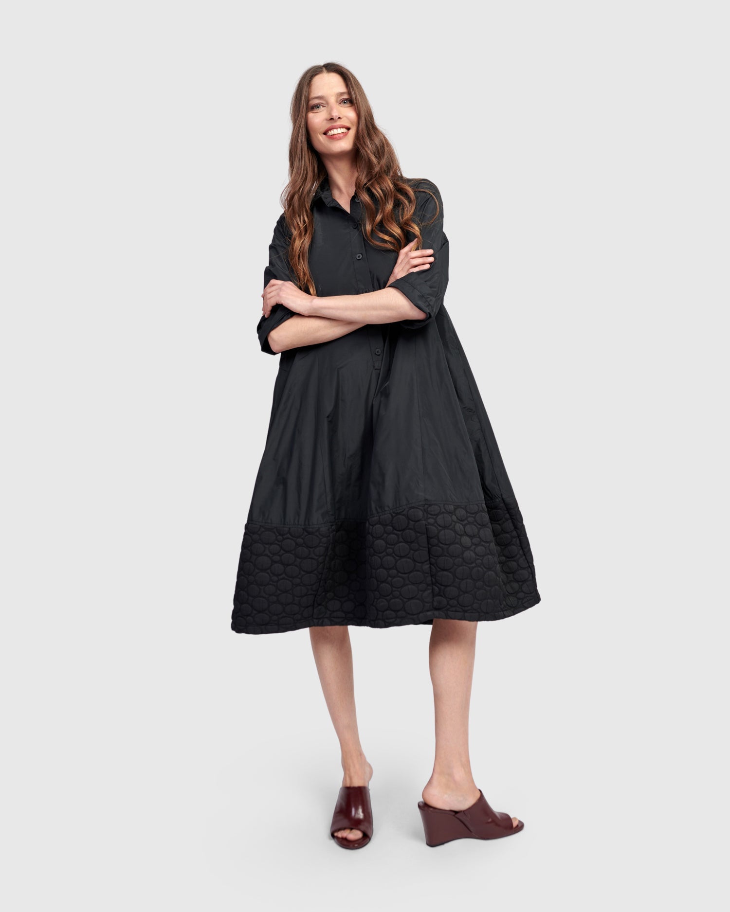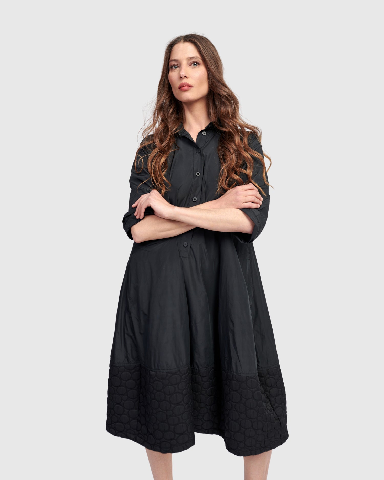 Made in a crisp woven taffeta with textured jacquard detailing at the hem, this relaxed shirt dress is fitted across bust and shoulders with tailored seaming, then flares out at waist and falls into cocoon skirting. Foldover collar with half button placket, three quarter length sleeves, side pockets, knee length.