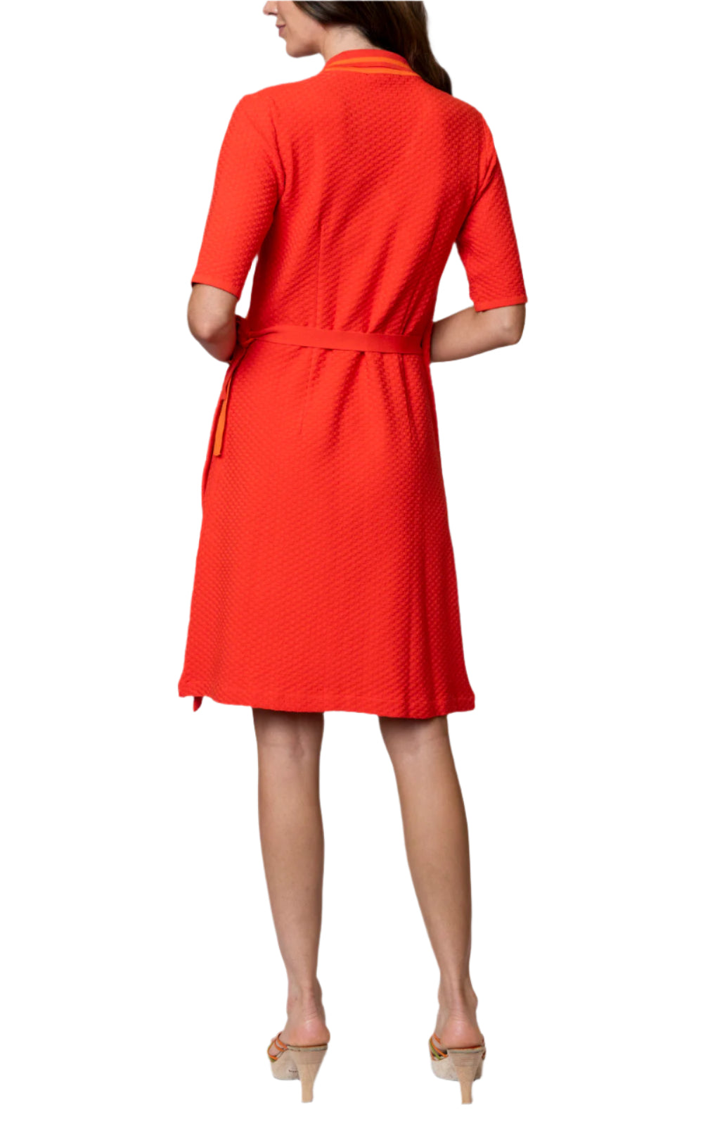 Small square piquet-knit short sleeved wrap dress with a collar; Made of high stretch supple viscose blend;