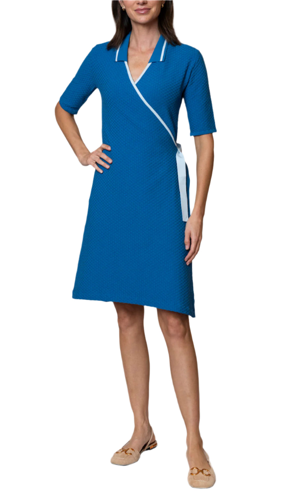 Small square piquet-knit short sleeved wrap dress with a collar; Made of high stretch supple viscose blend;
