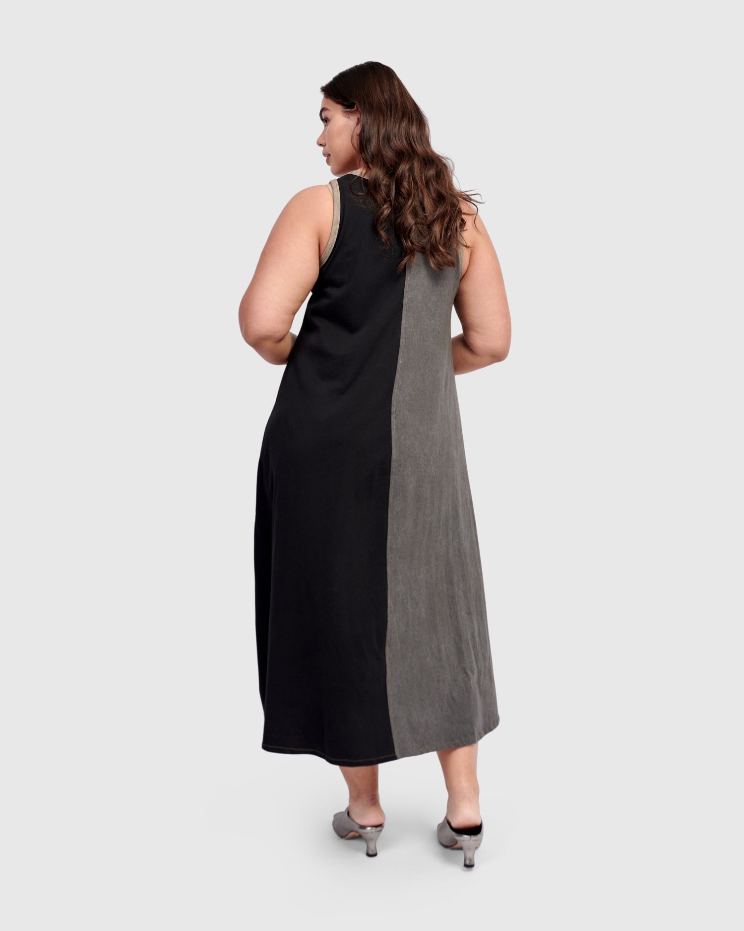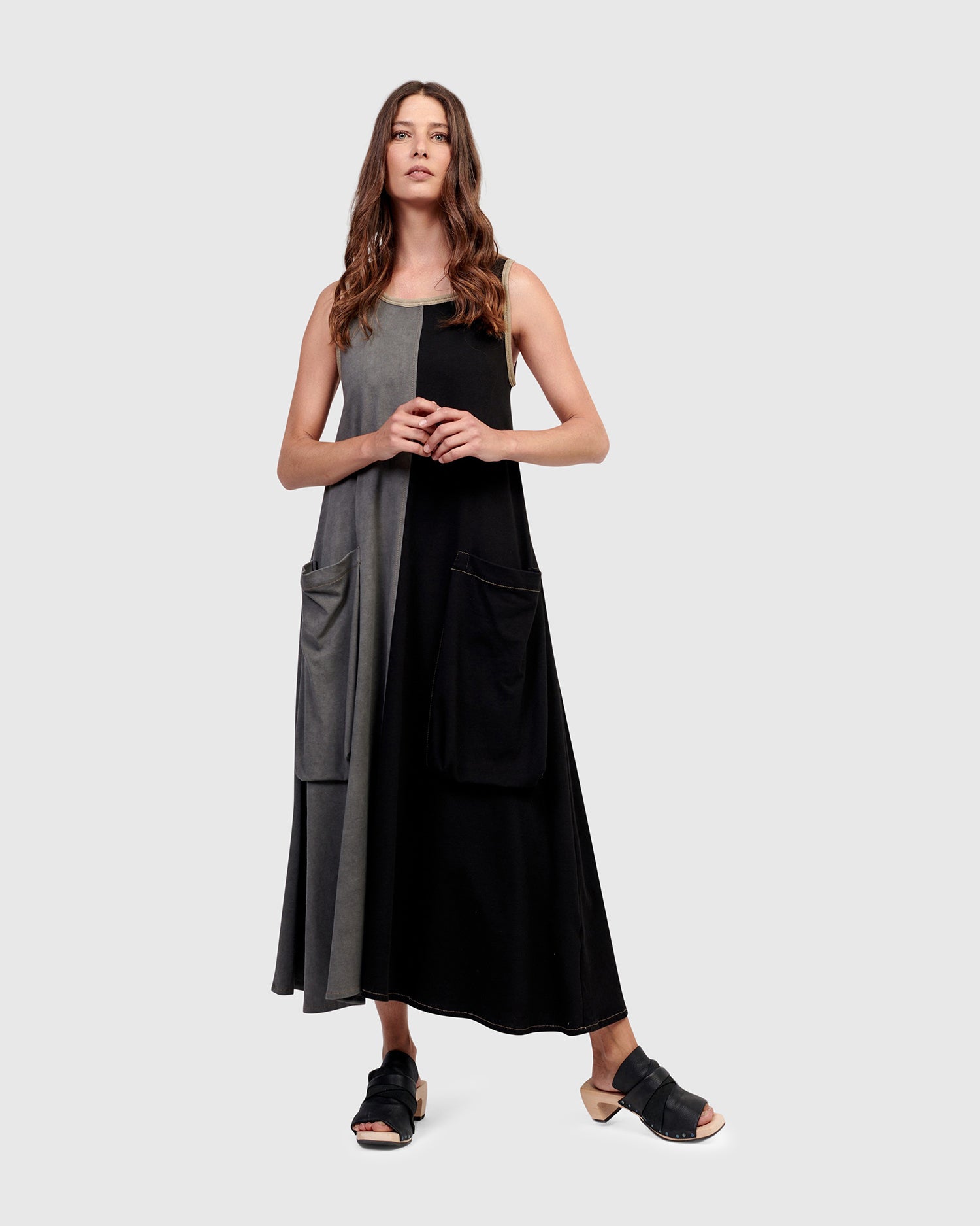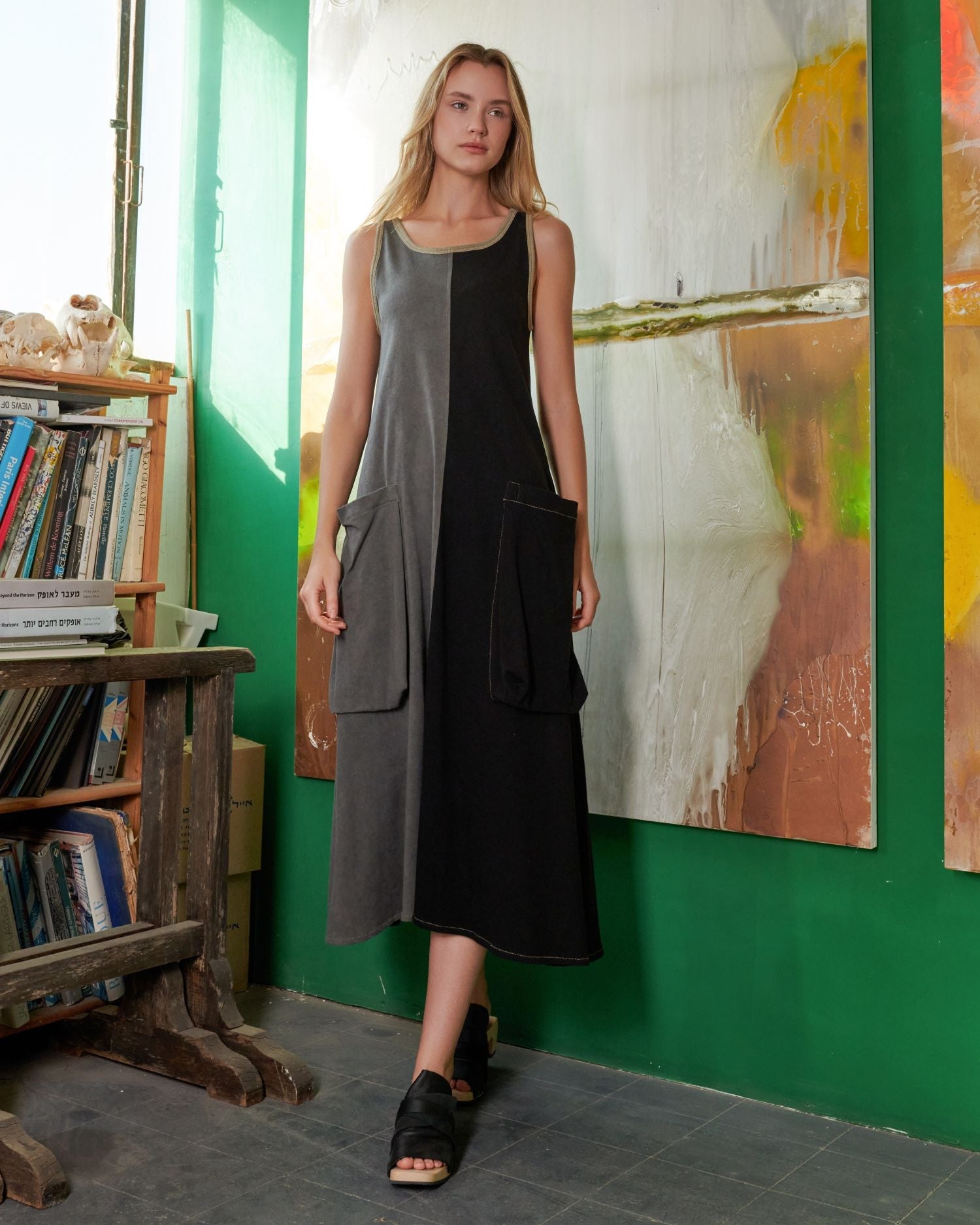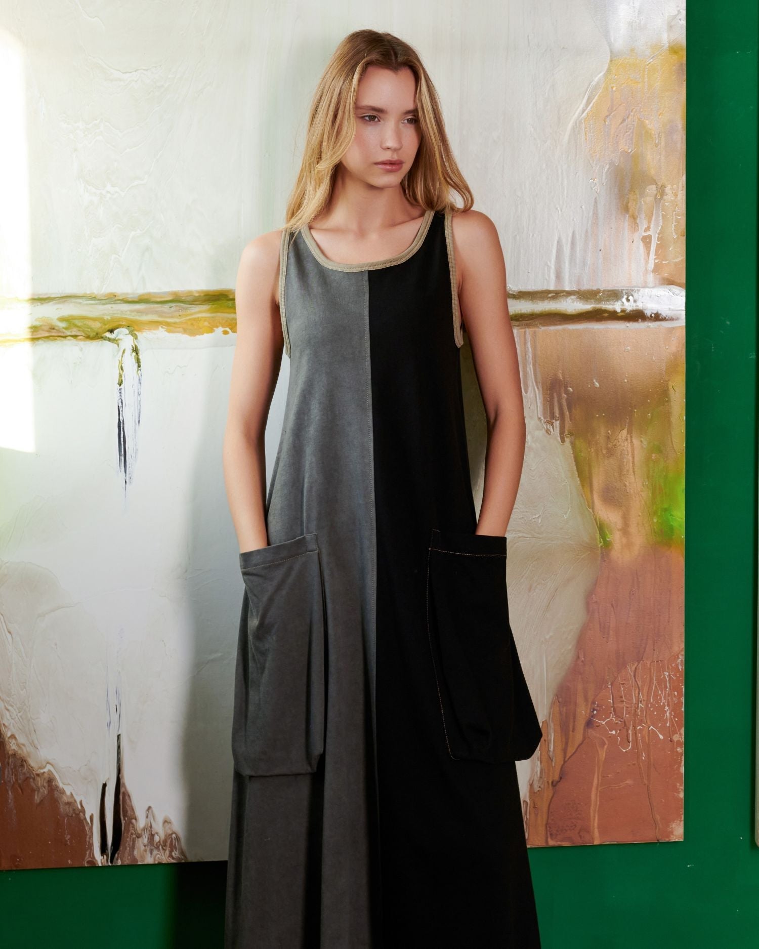 This sleeveless maxi dress boasts colorblock neutrals in a midweight cotton knit fabric that drapes with graceful structure. This slim, A-line style has a scoop neck and oversized patch pockets.