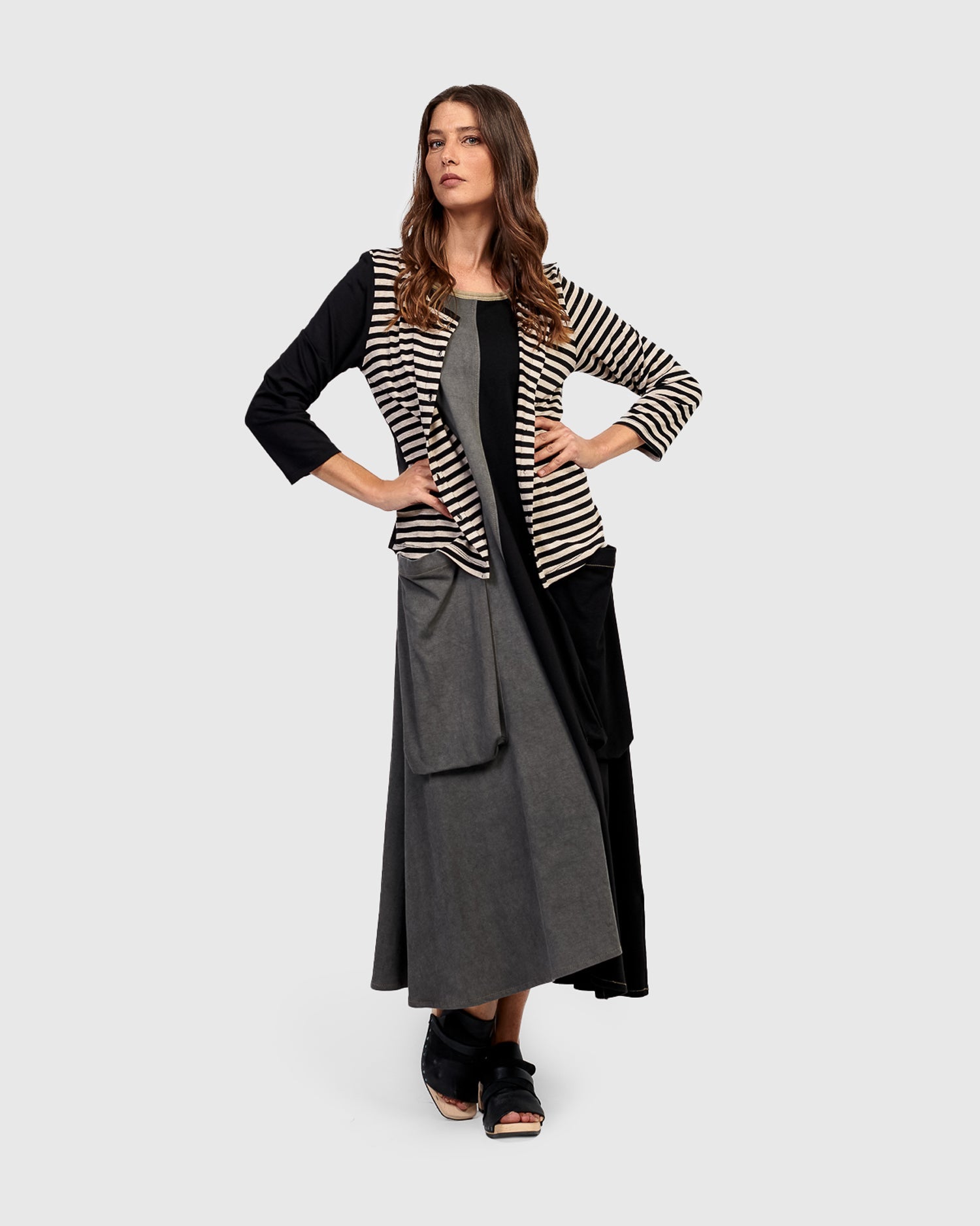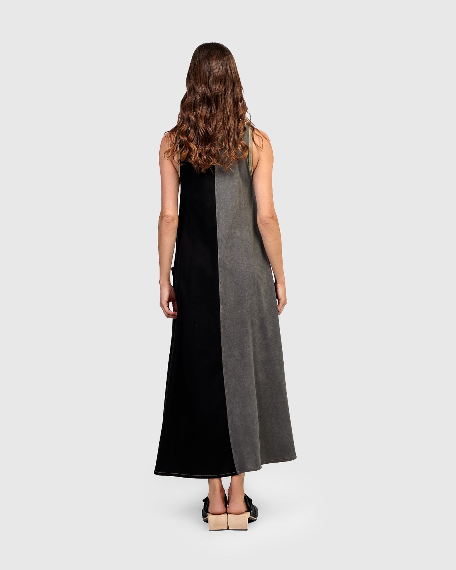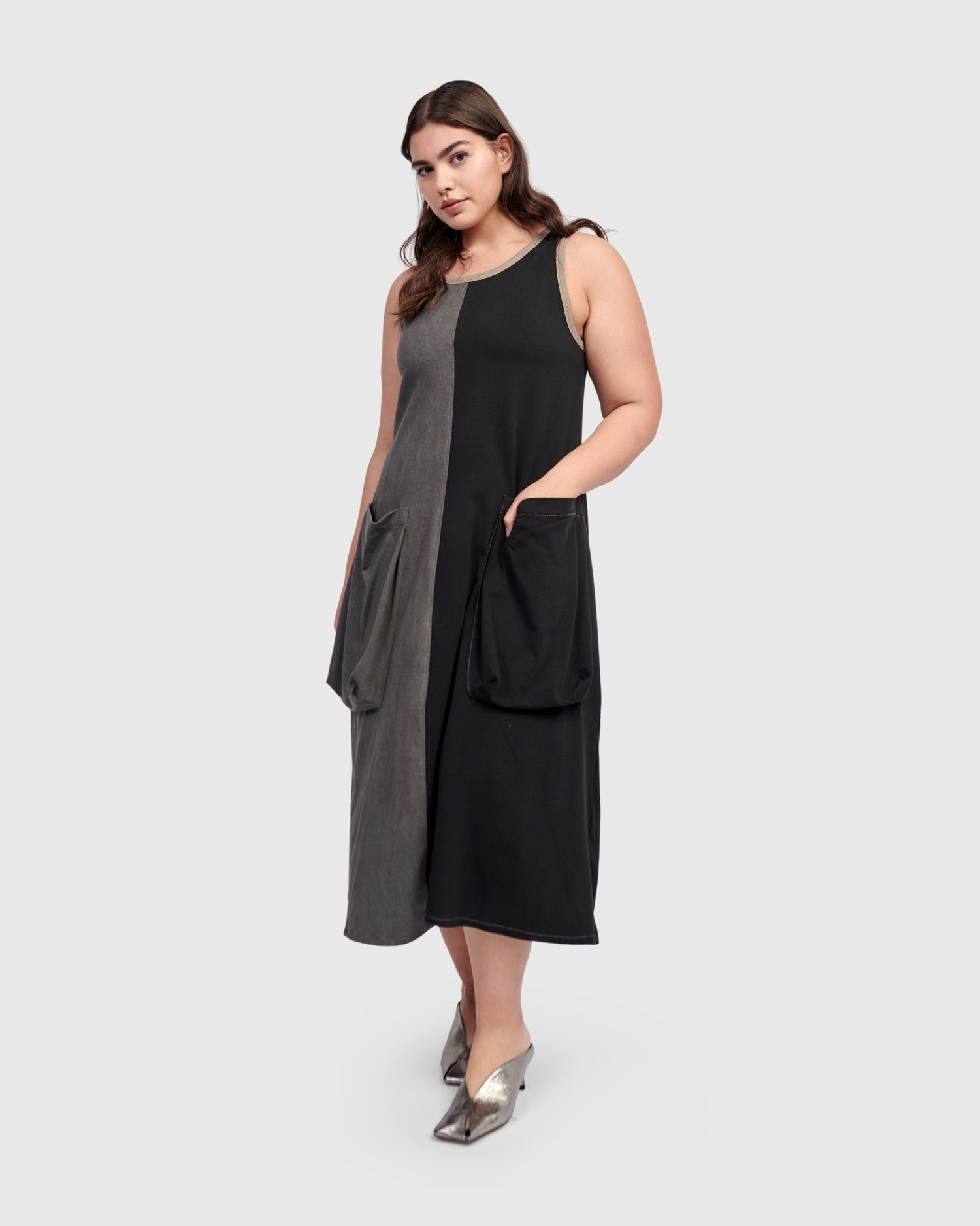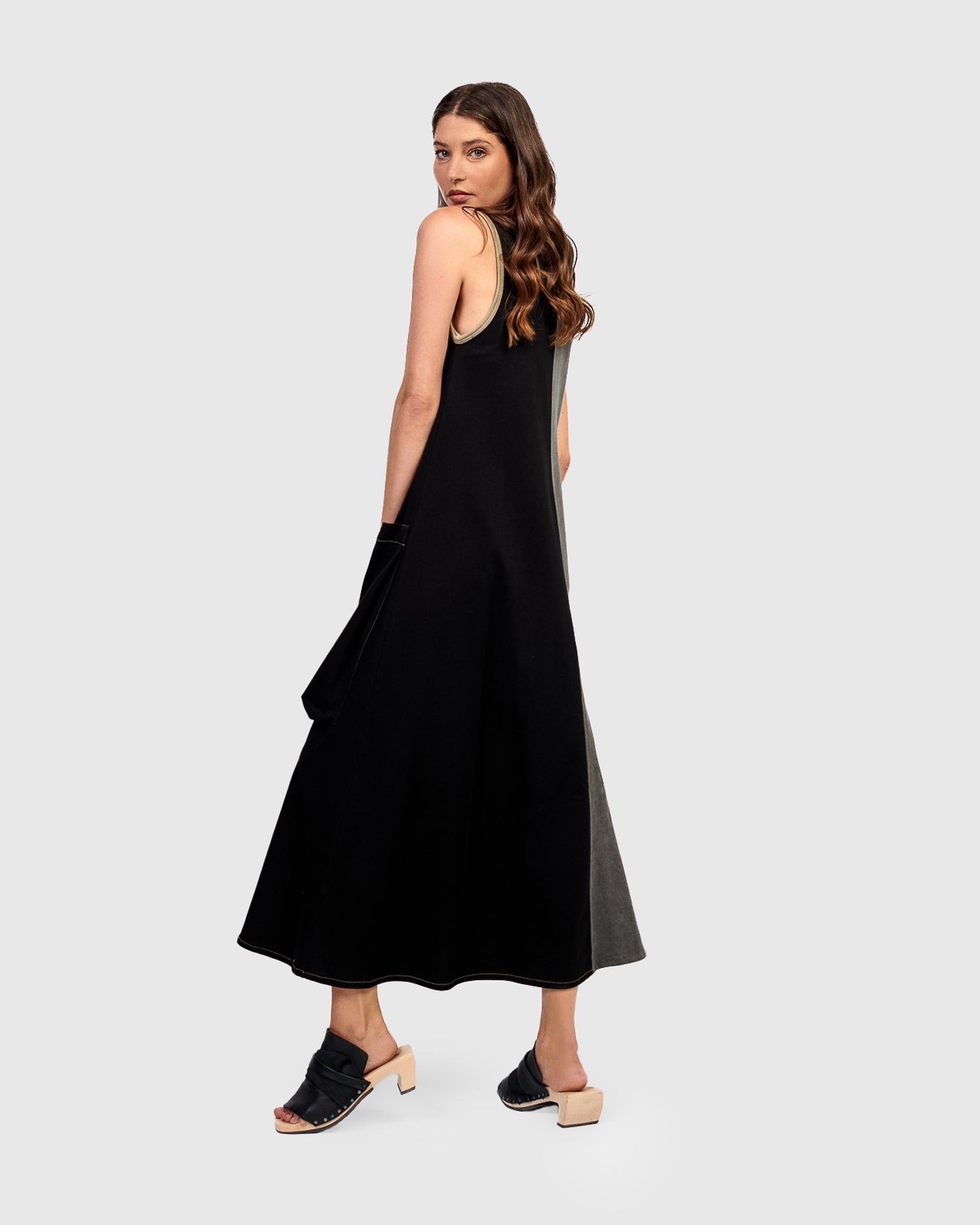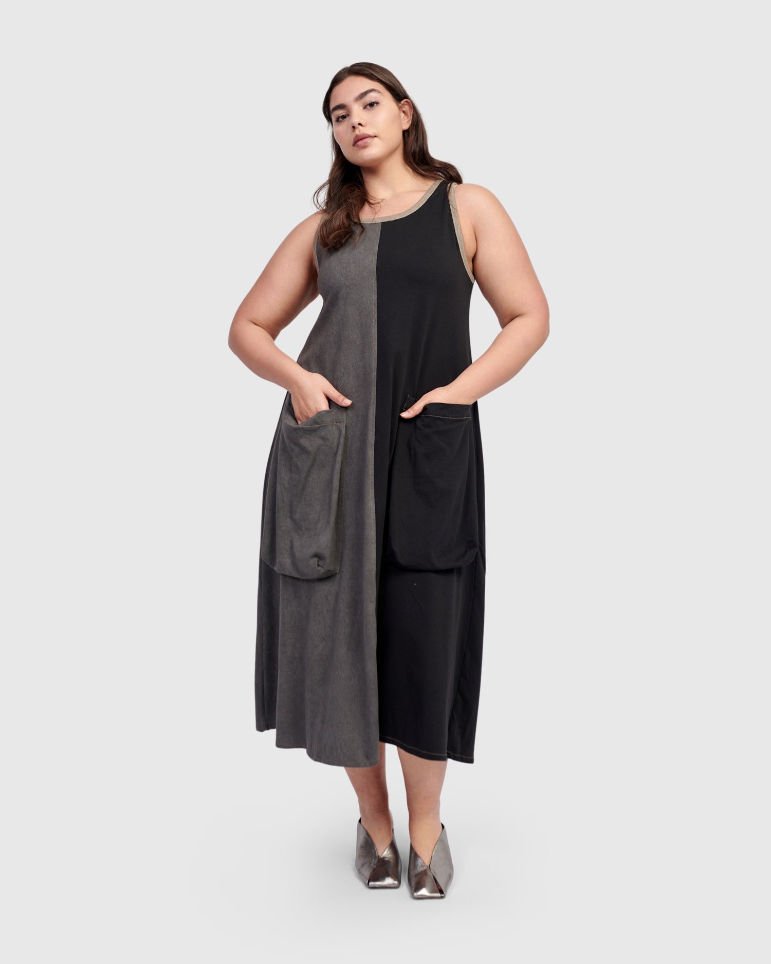 This sleeveless maxi dress boasts colorblock neutrals in a midweight cotton knit fabric that drapes with graceful structure. This slim, A-line style has a scoop neck and oversized patch pockets.