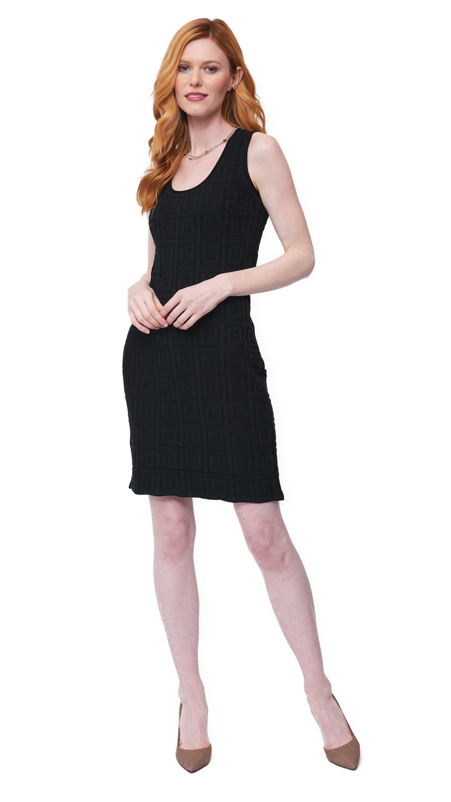 Square-detail knit sleeveless sheath dress; Scoop neck; Above knee; Looks good with the matching Zia Jacket; Made of high stretch supple viscose blend;