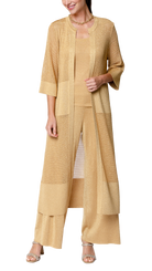 Long shimmery mesh-knit duster with 3/4 sleeves and flat-knit bands at waist, at base and on the sleeves' cuffs; Gold metallic shimmer;