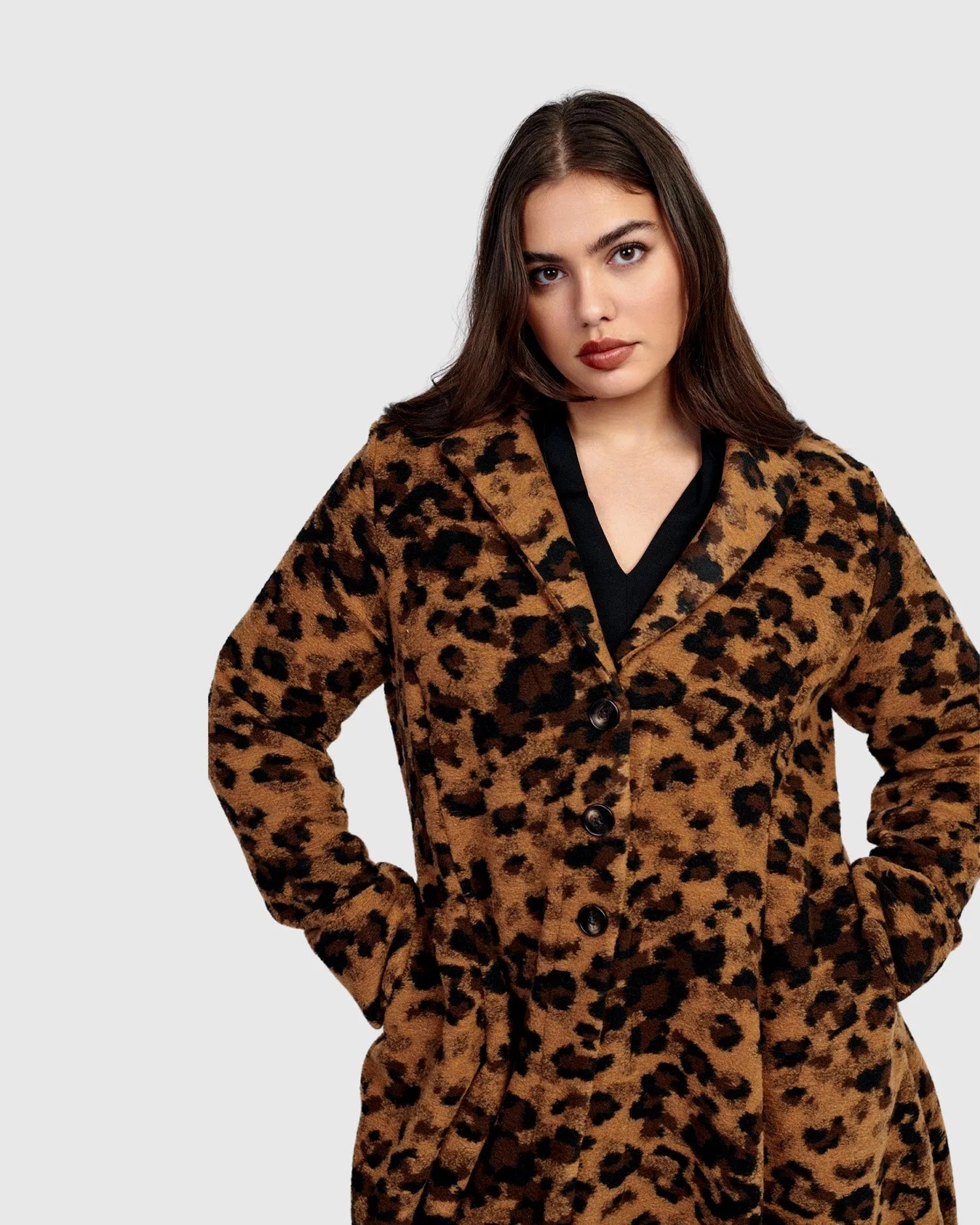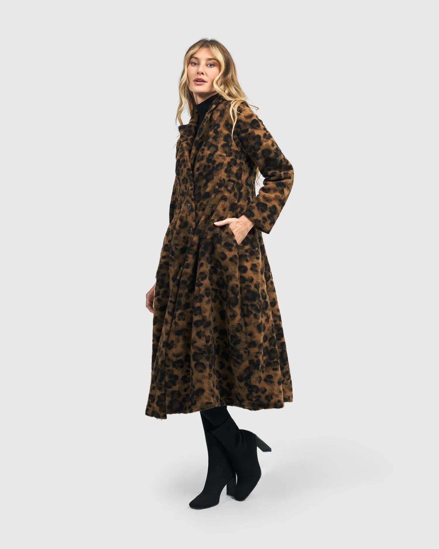 Strut down the streets in this statement leopard print coat – it's made in a fuzzy felted animal print fabric and has a slim full length silhouette with long set-in sleeves, a foldover collar with lapels, three large front buttons and hidden side pockets. A chic tailored finish to complete any outfit. Interior is unlined.