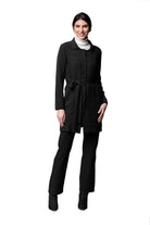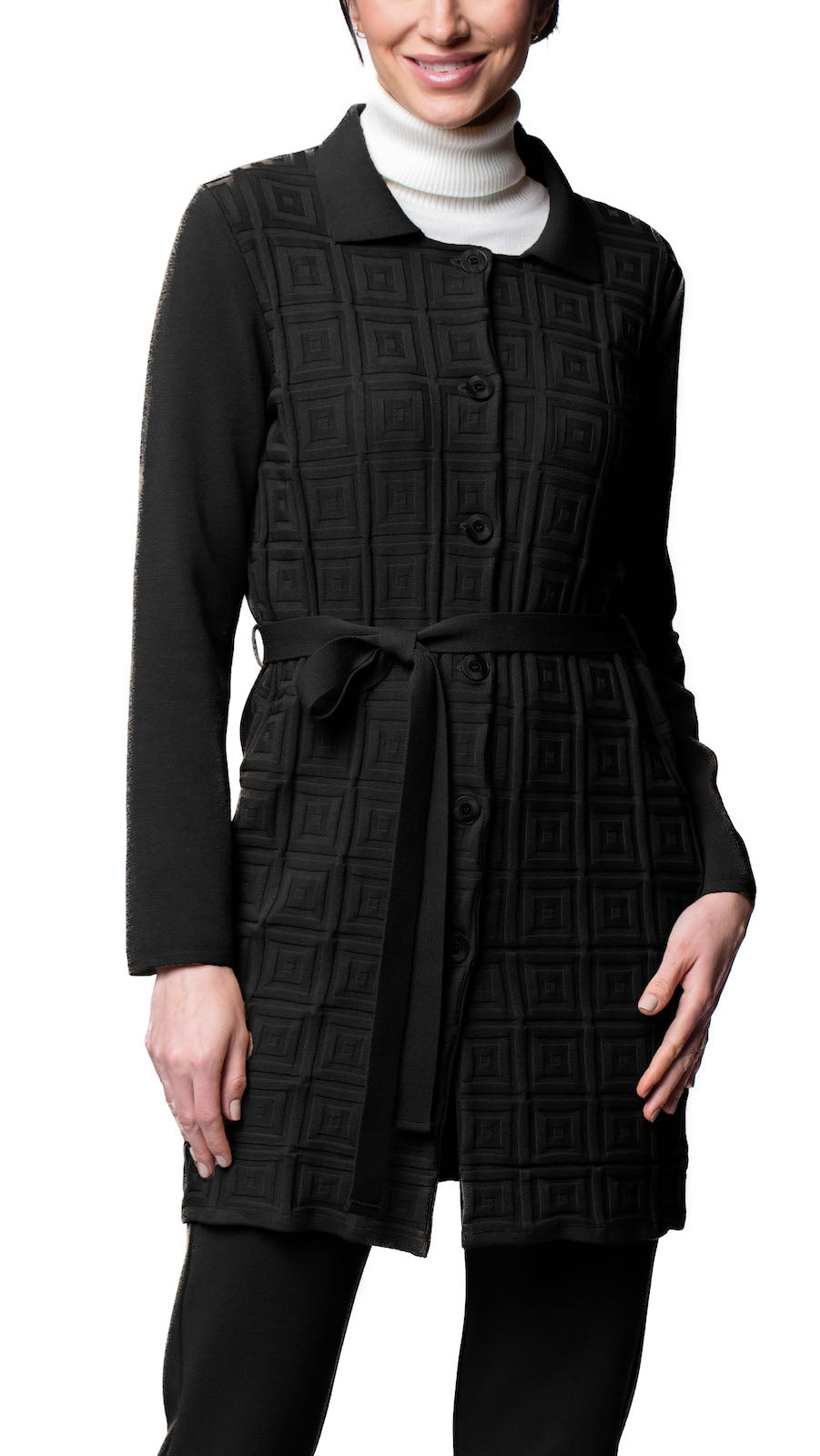 Square-detail knit Car Coat with a belt; Flat-knit back and sleeves; Collar; Buttons; Made of high-stretch supple viscose blend;