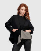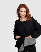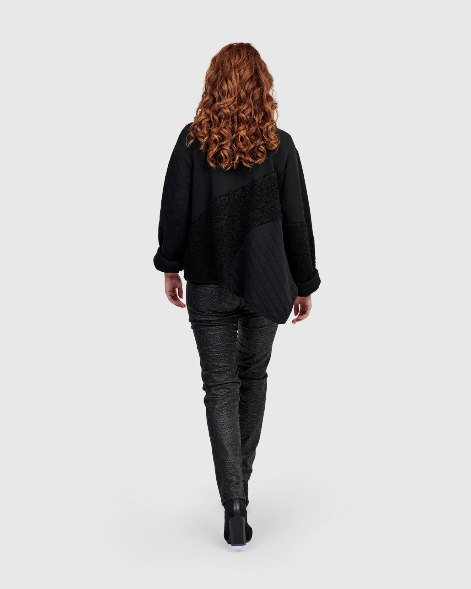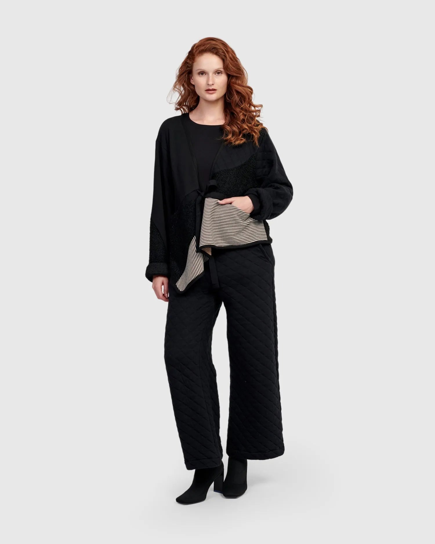 This cardigan sweater has long sleeves, front pockets, a ribbon tie front, and is made in a mix of fabrics: boucle, quilted, plain jersey and striped knits. With an asymmetrical hem, it's the ultimate whimsical piece for your wardrobe.