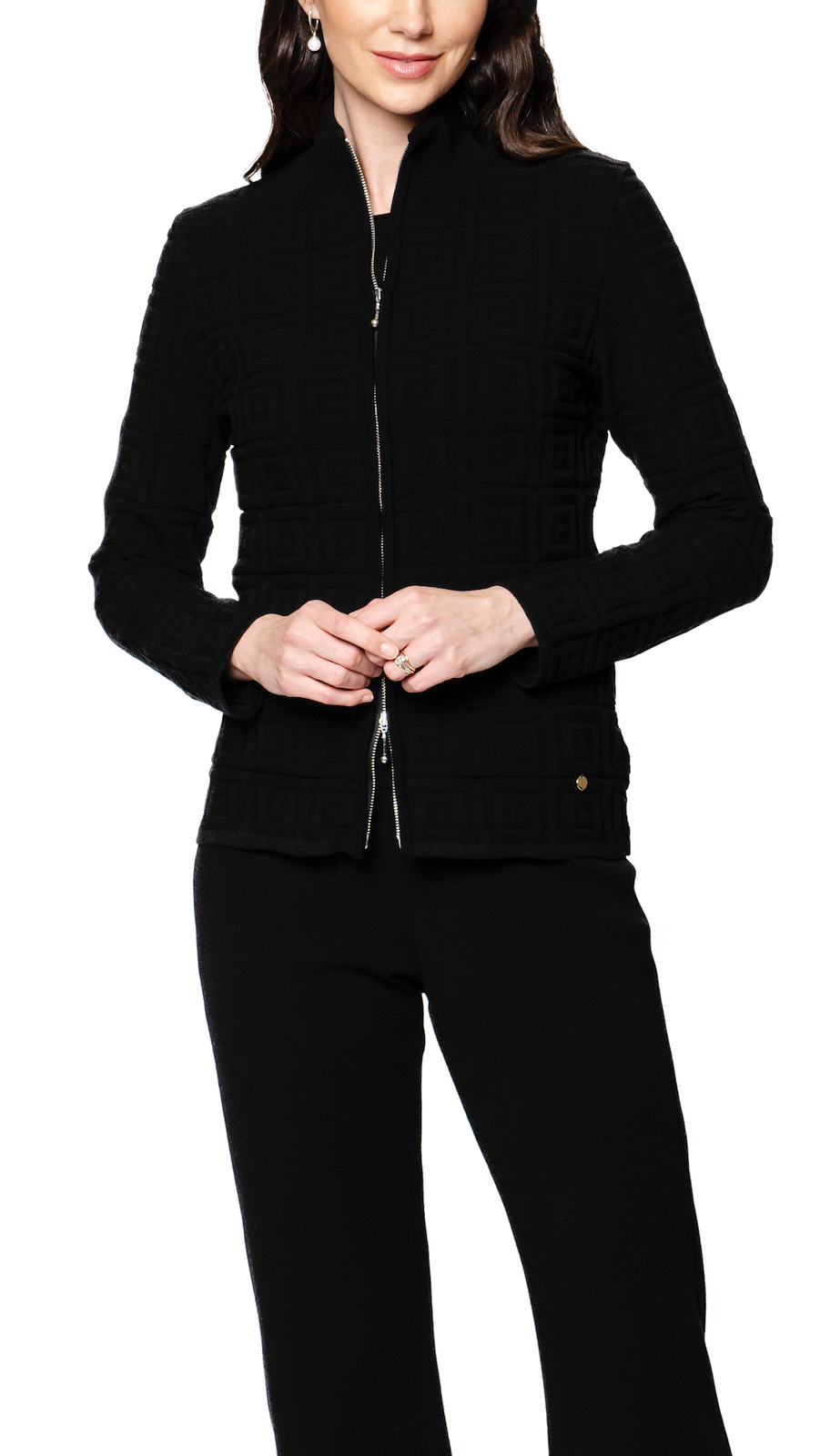 Square-detail knit (front and back) Jacket; Mock neck; full length sleeves; Two-way zipper; Made of high-stretch supple viscose blend;
