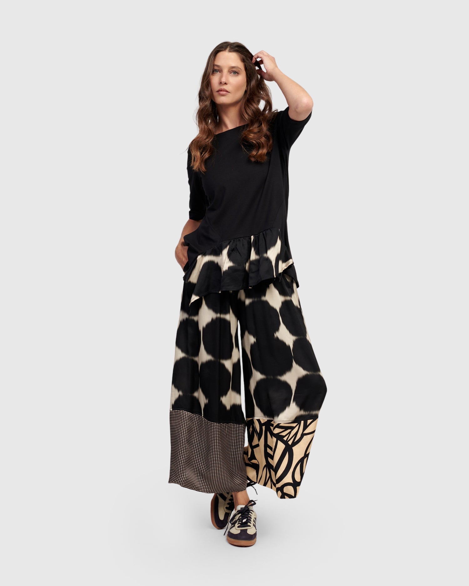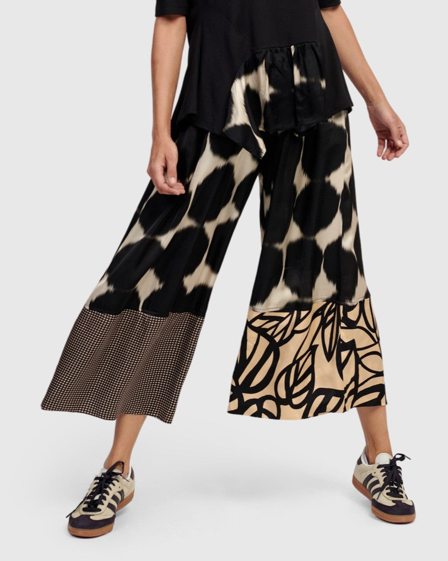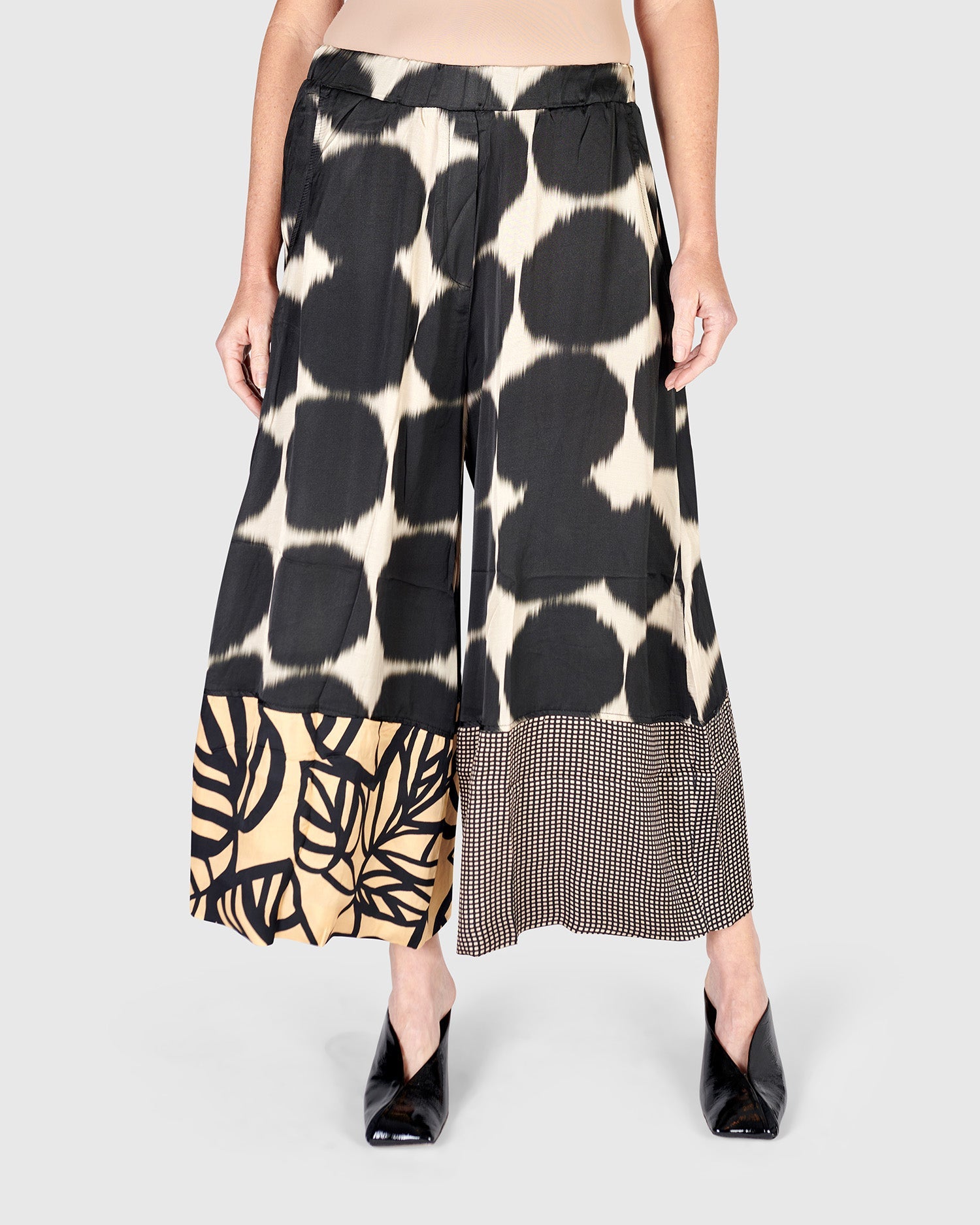 These stylish wide leg pants have a relaxed, high-waisted fit, and cropped length in a mixed print. A wide, all-around elastic waistband with mock fly and side pockets make this the perfect all-day chic pant.