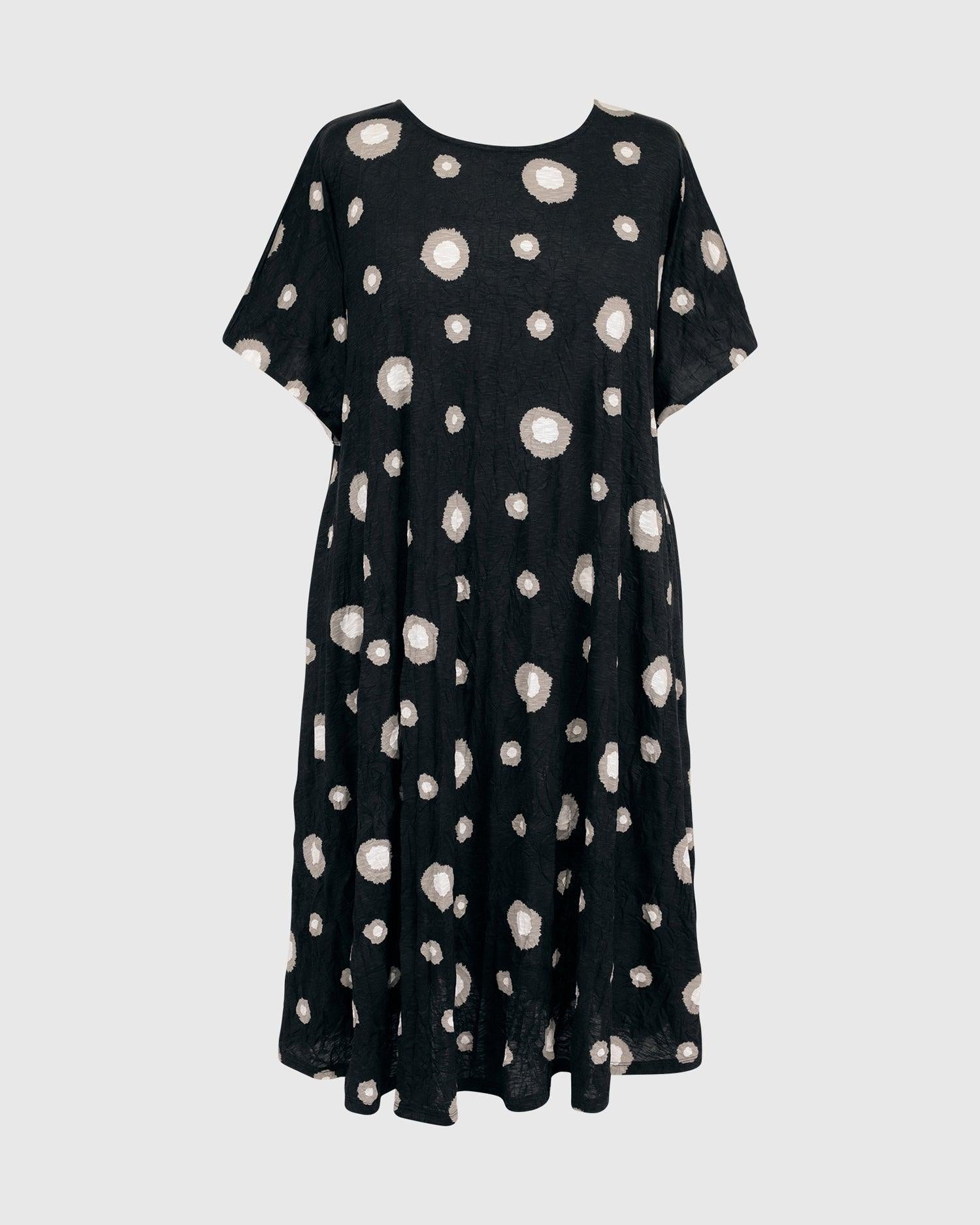 Turn-back cuffs on the sleeves of our effortless pullover add a pop of artsy contrast. Light and airy, the crinkled slub knit sports a bubble dot print. Hagar's generous A-line silhouette provides perfect drape and fullness with the trapeze swing we love. Scoop neck, elbow sleeves, side pockets and straight hem. Finished with a neat center-back seam.