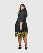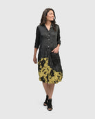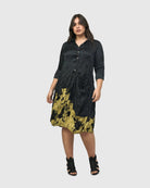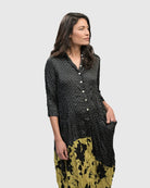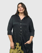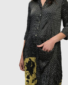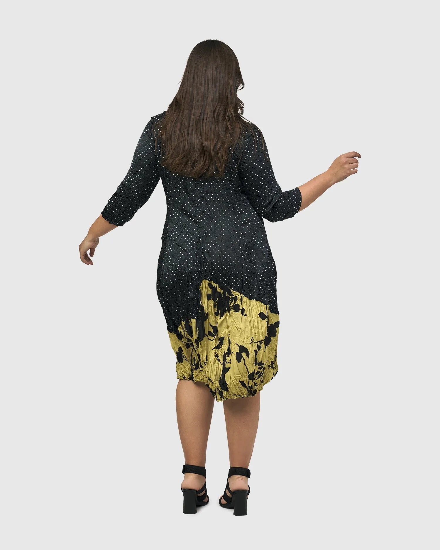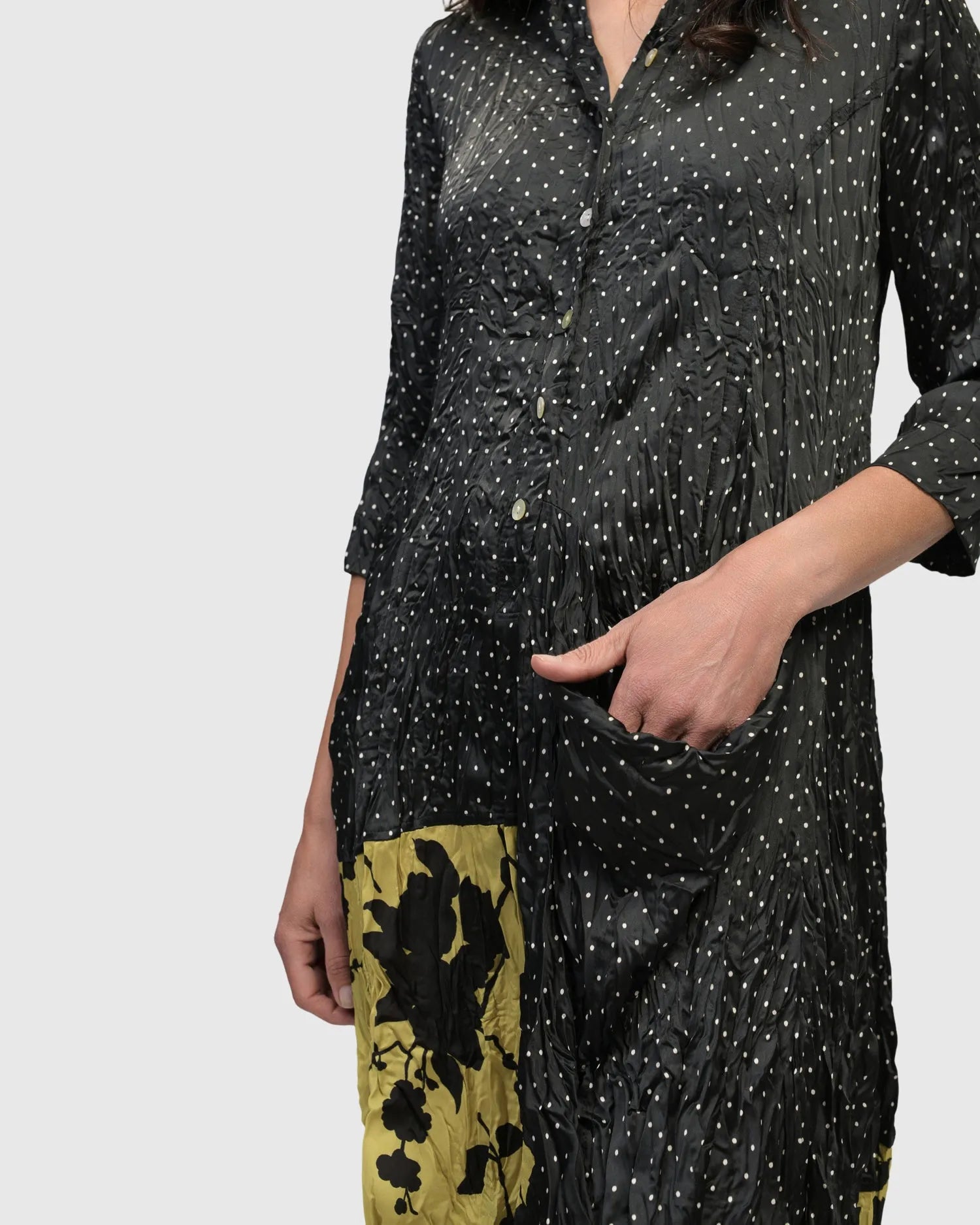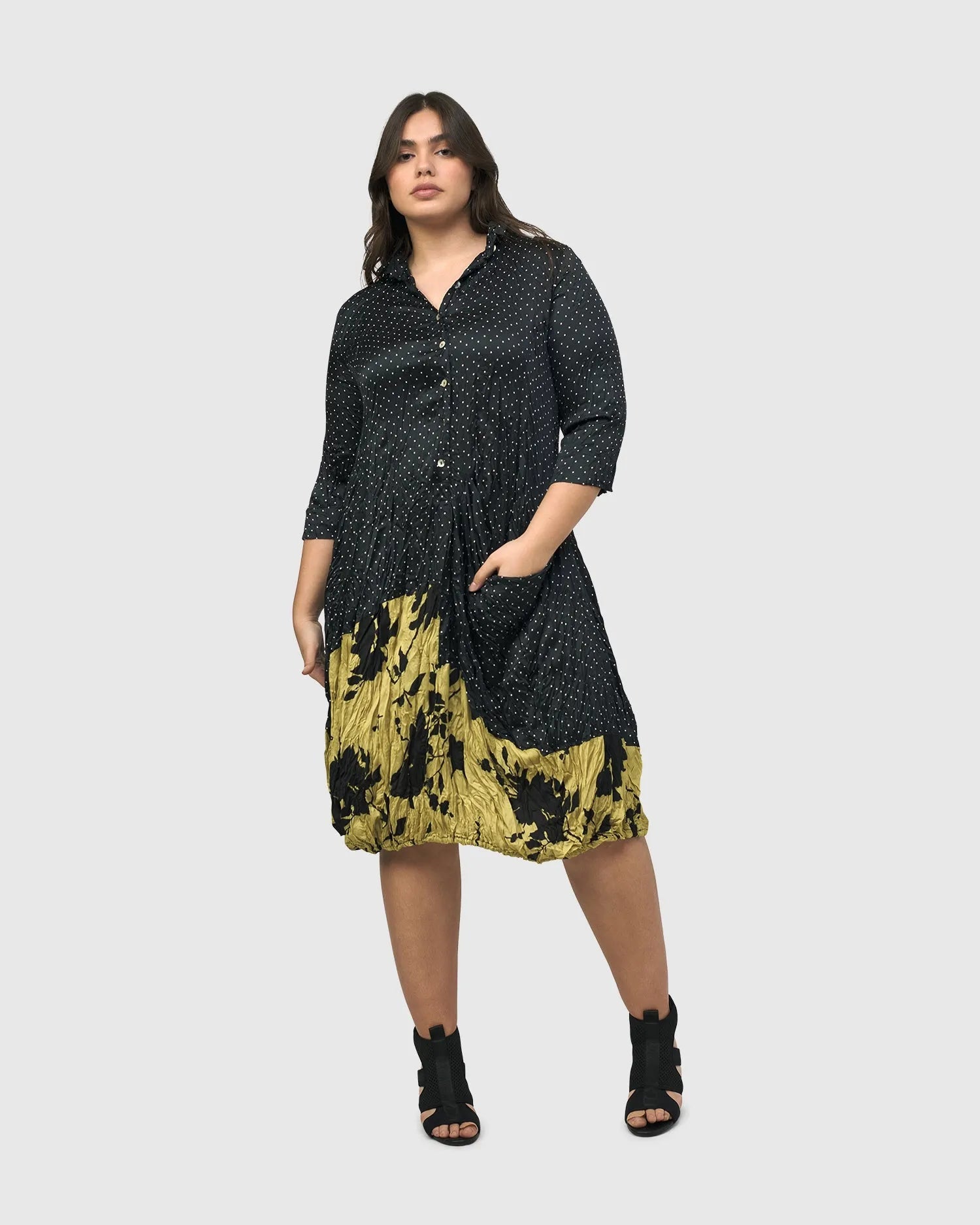 Our classic Wonderful Dress in a slinky and moveable crinkle satin mix fabric. From day dress or dinner dress, this beloved style has a button front placket, foldover collar, elbow-length sleeves, signature draped front pocket and slight pouf skirt with an elastic hem to hold some shape. Indulge the traveler in you!