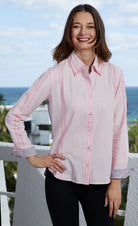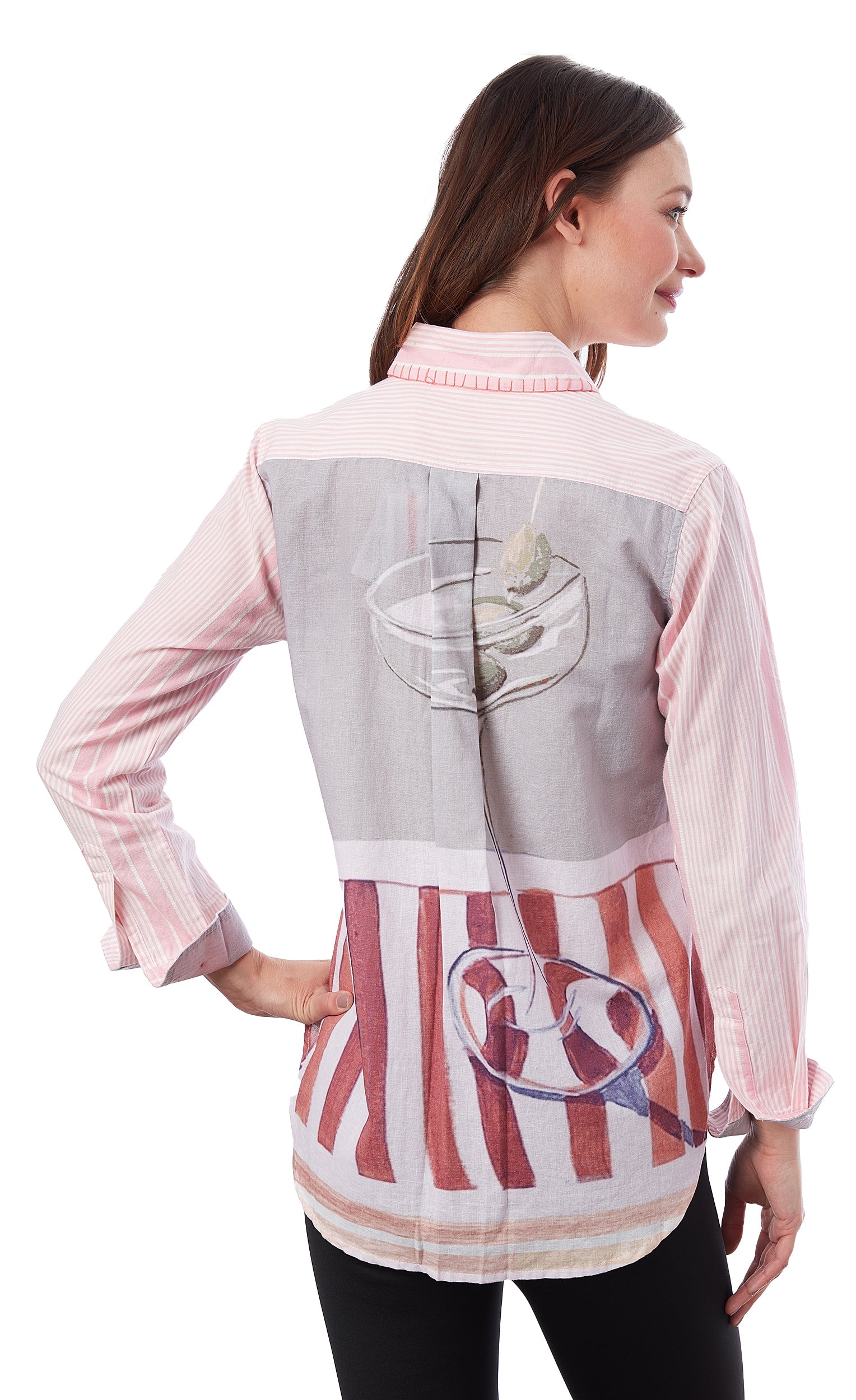 Shake Up Your Style! 🍸 This sassy button-down features pink stripes on the front and a fun twist on the back—martini art to toast to good times! With a crisp collar and cuffs, it's the ultimate party partner for anyone ready to stir up some fun!