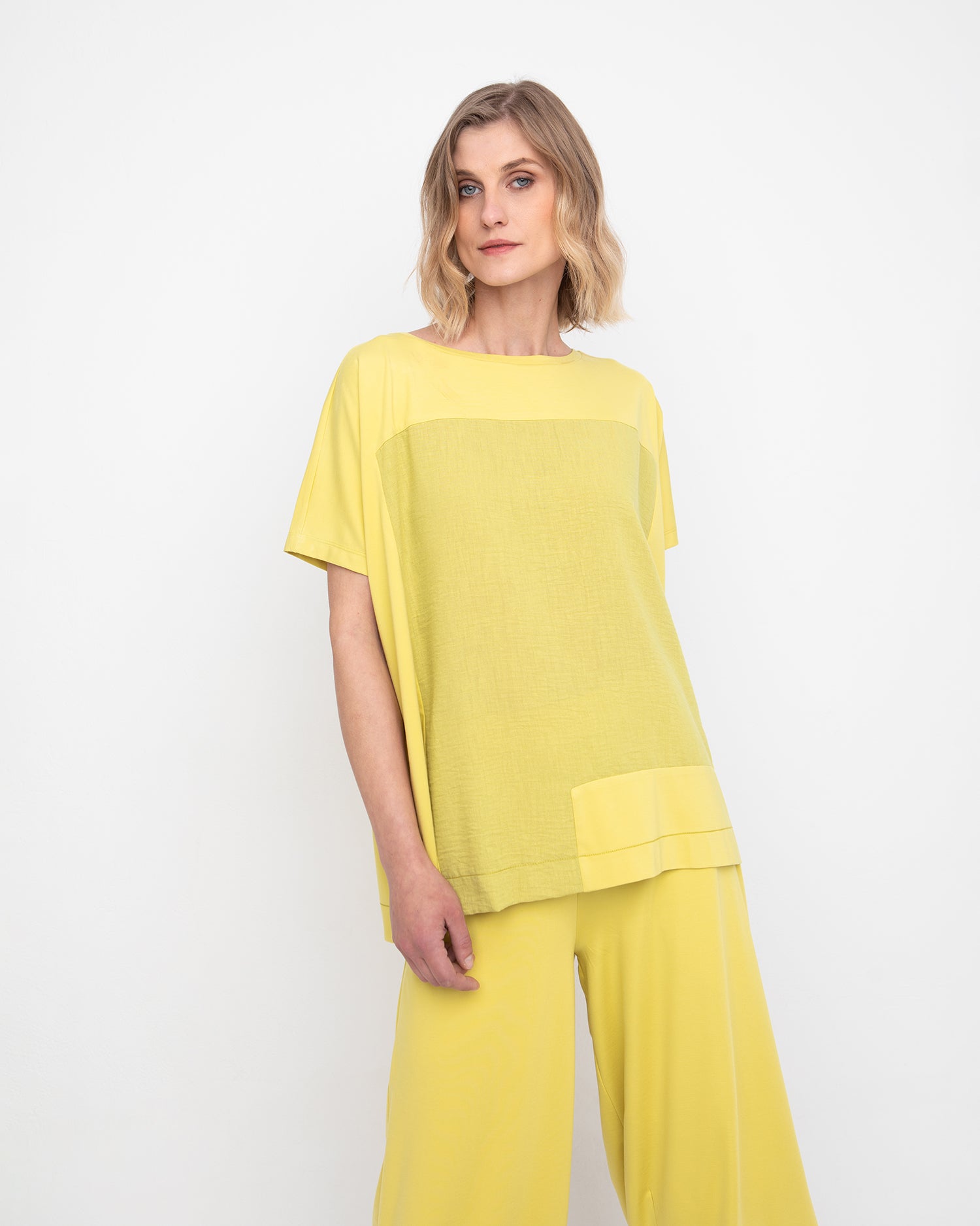 This relaxed hip-length tee has a boxy silhouette, plus a crew neck, drop shoulder short sleeves and is made in a midweight ponte knit. Features a textural woven contrast fabric on front.