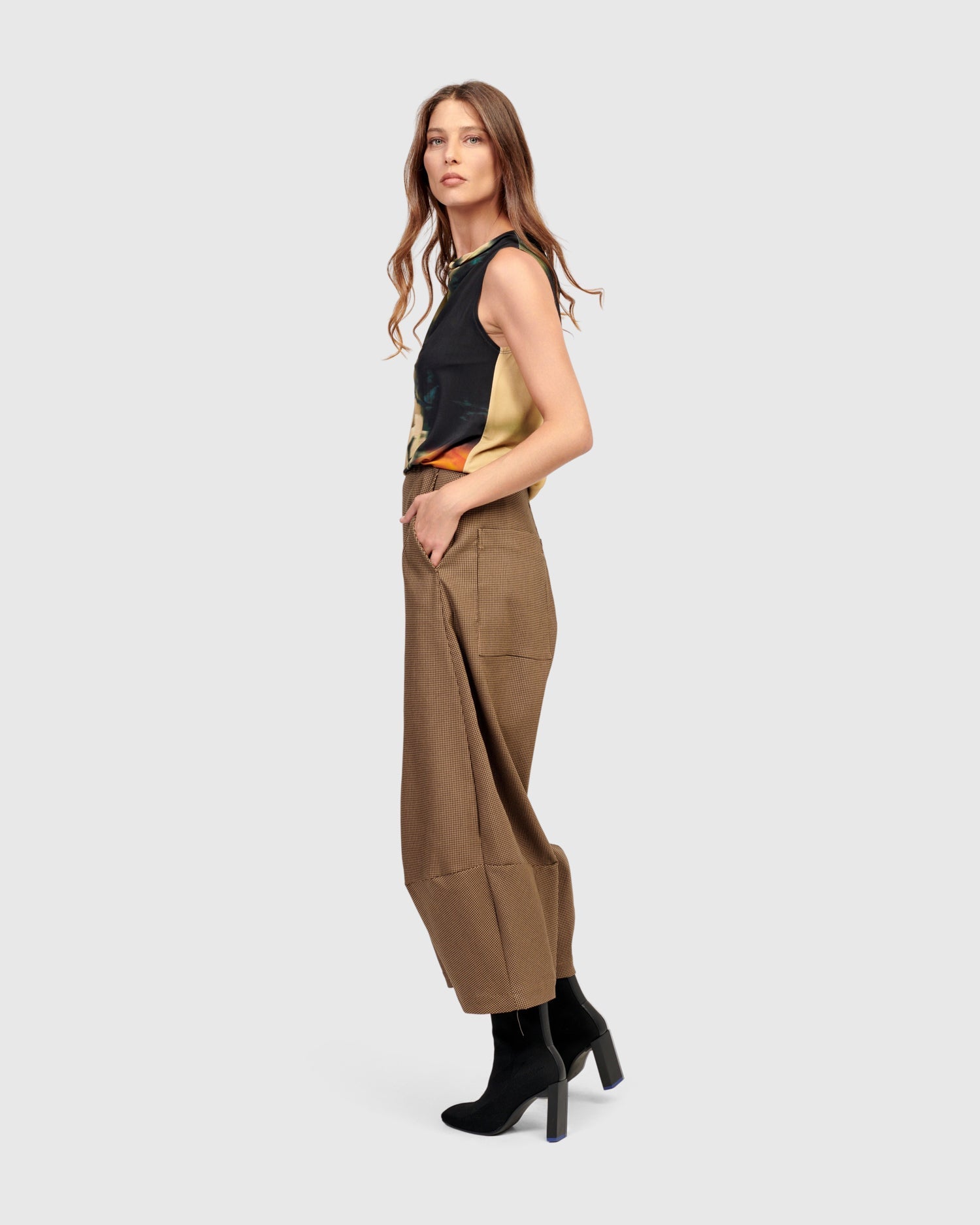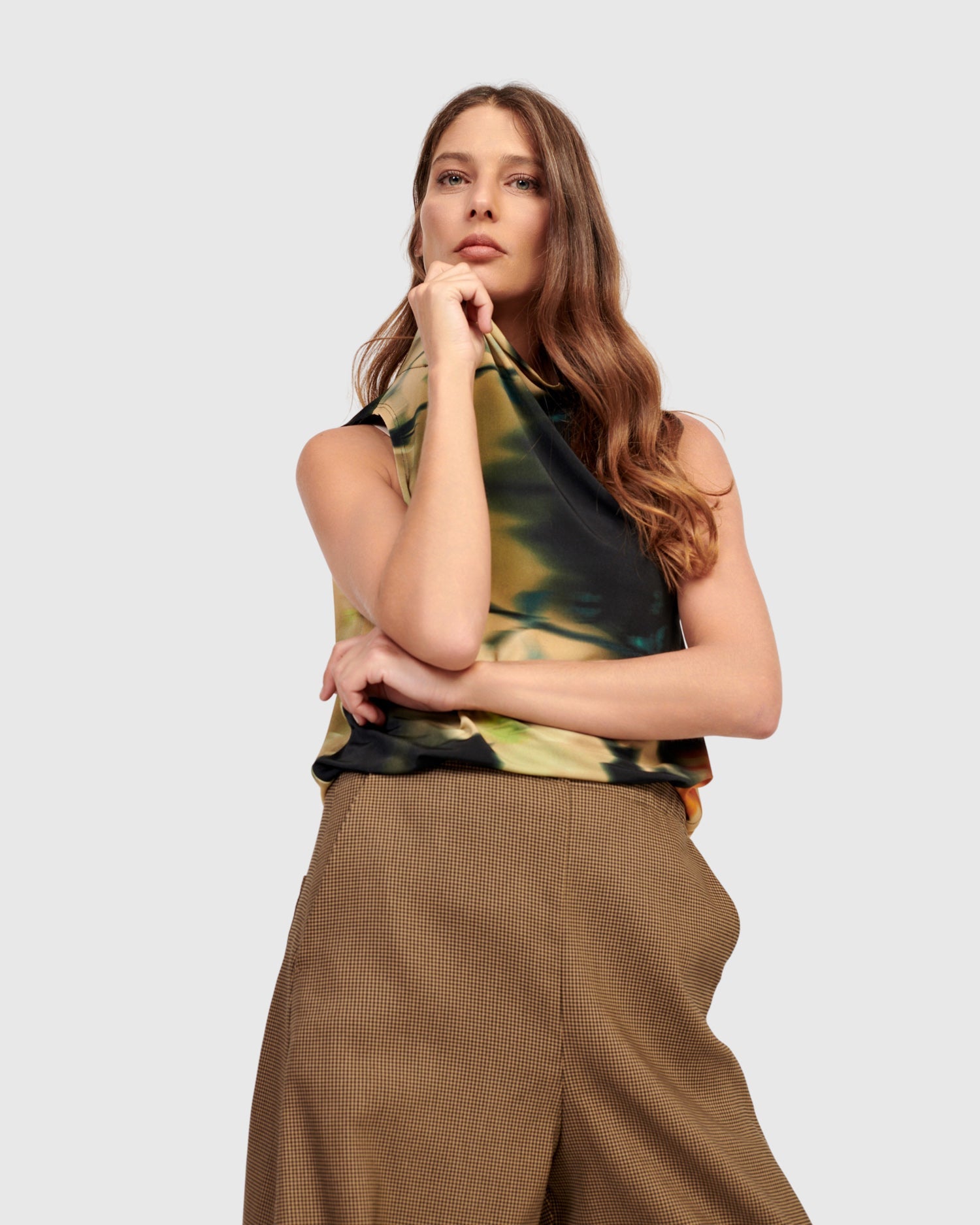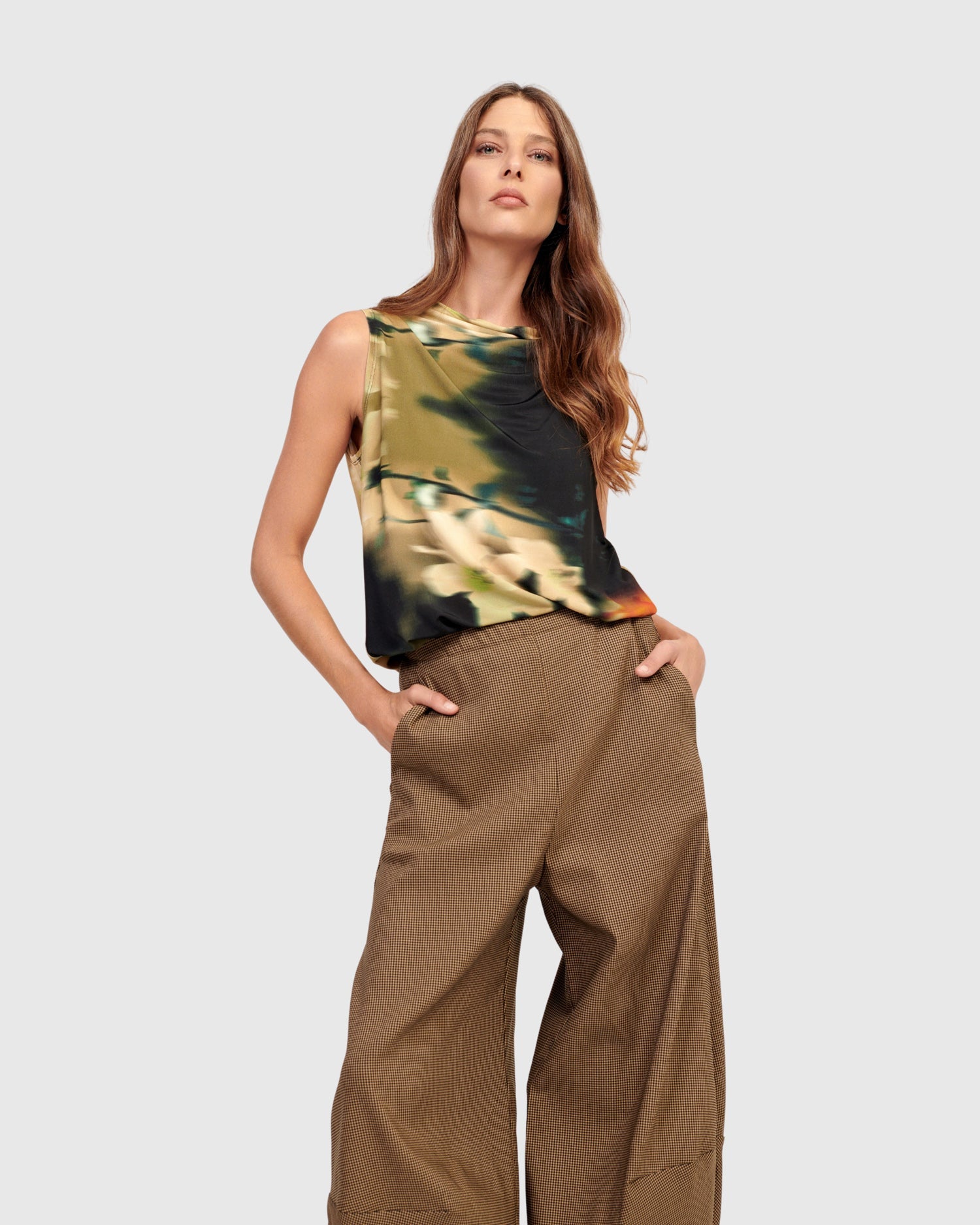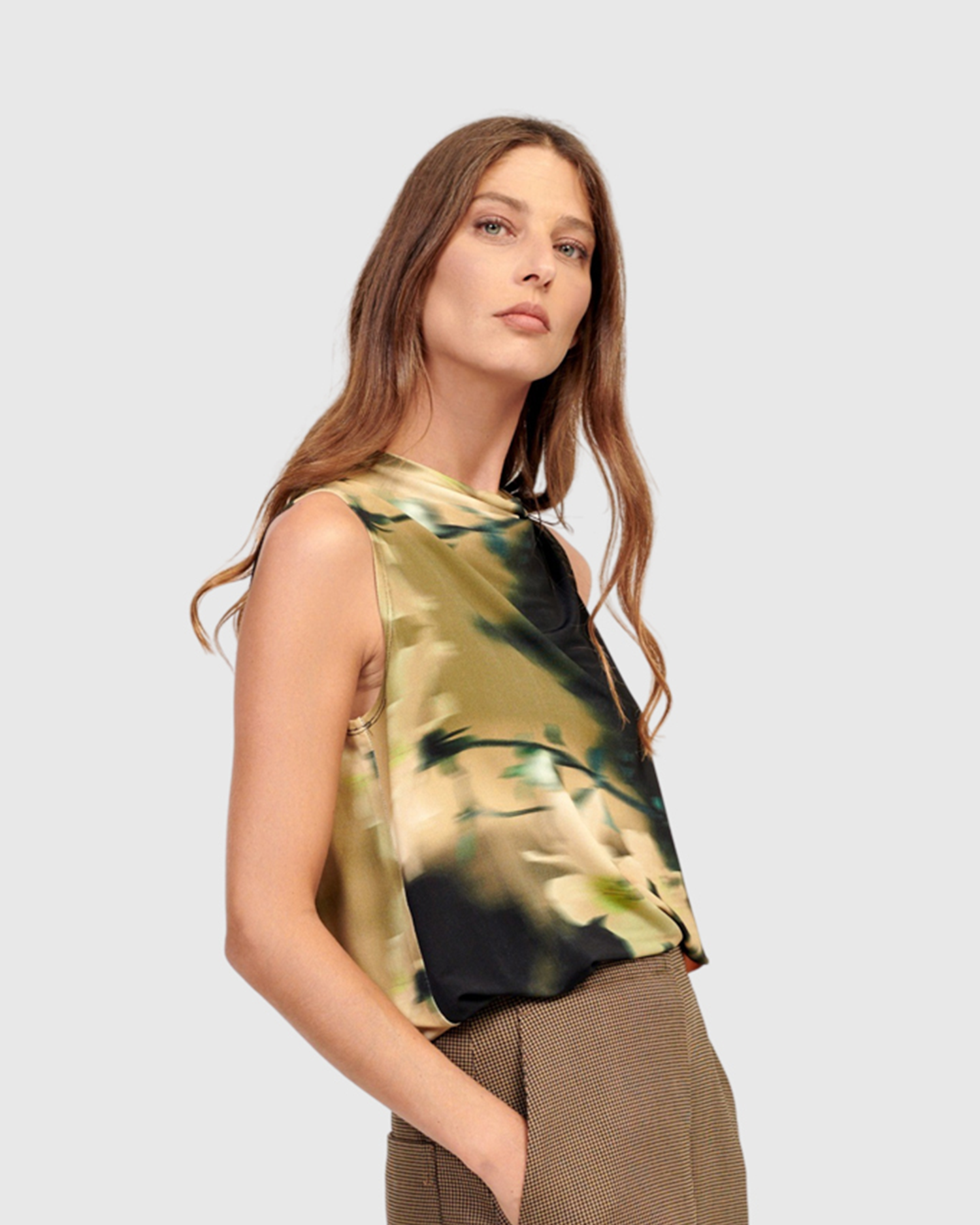 Chic, effortless and made in a slinky stretch jersey knit, this hip-length sleeveless top has a relaxed, slim fit that drapes elegantly and can be tucked into bottoms or left out.