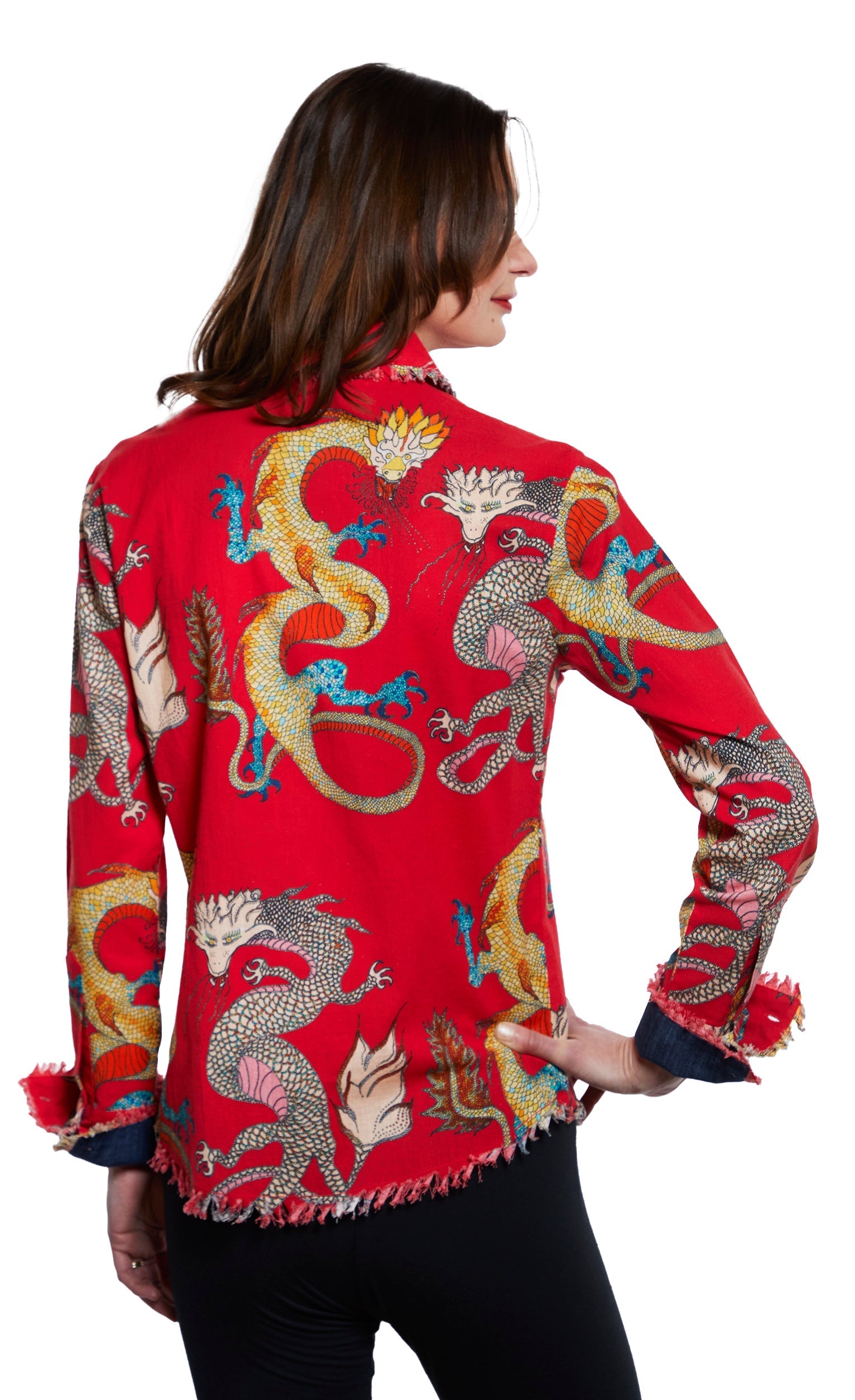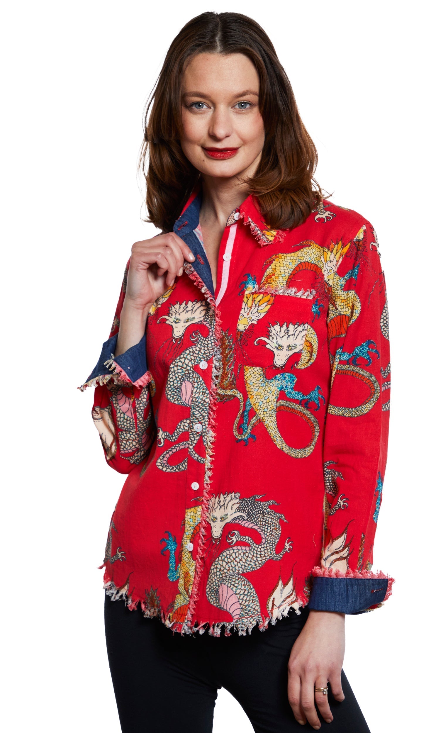 3/4 Sleeve Rome Shirt Black and White Dragons On Voile