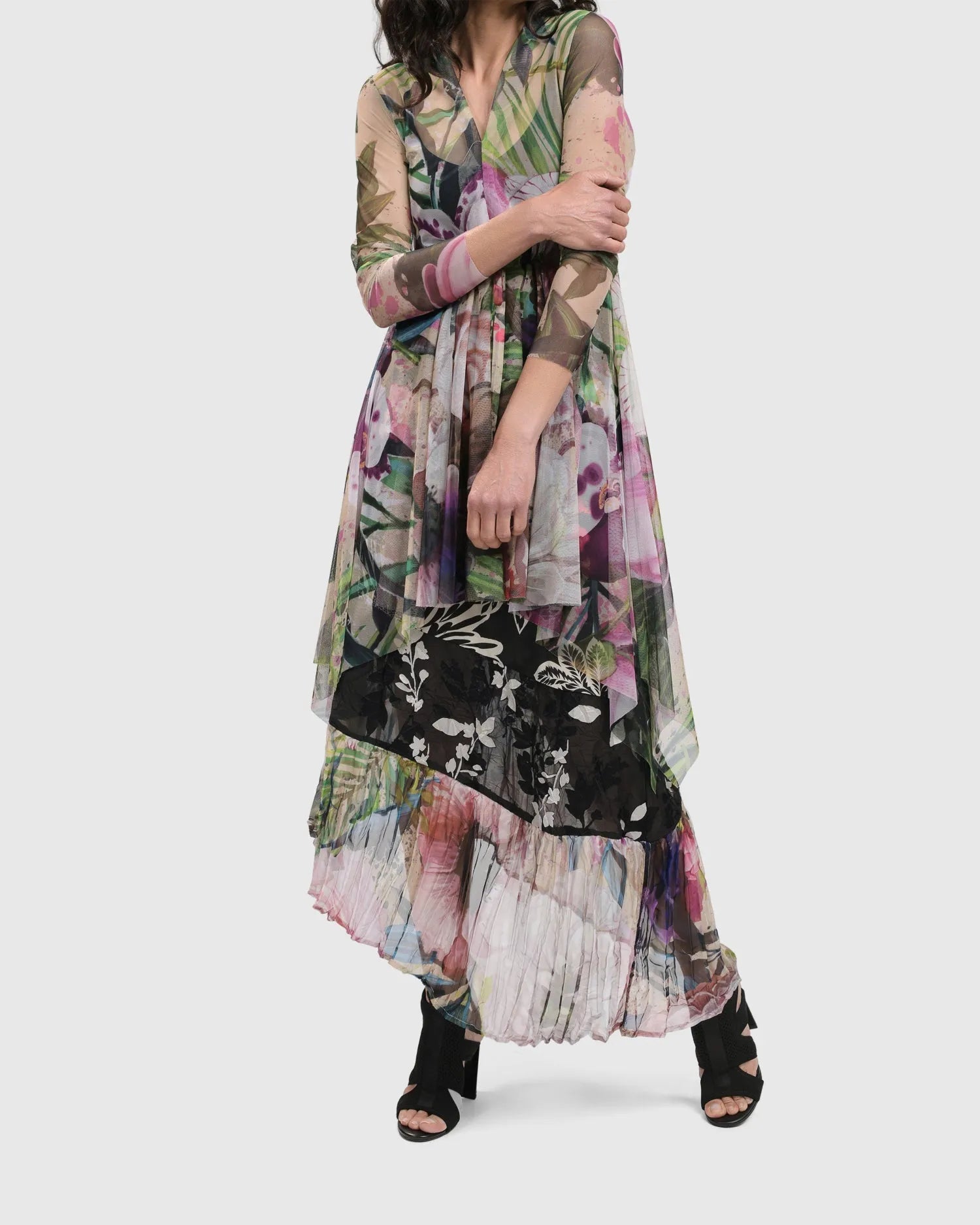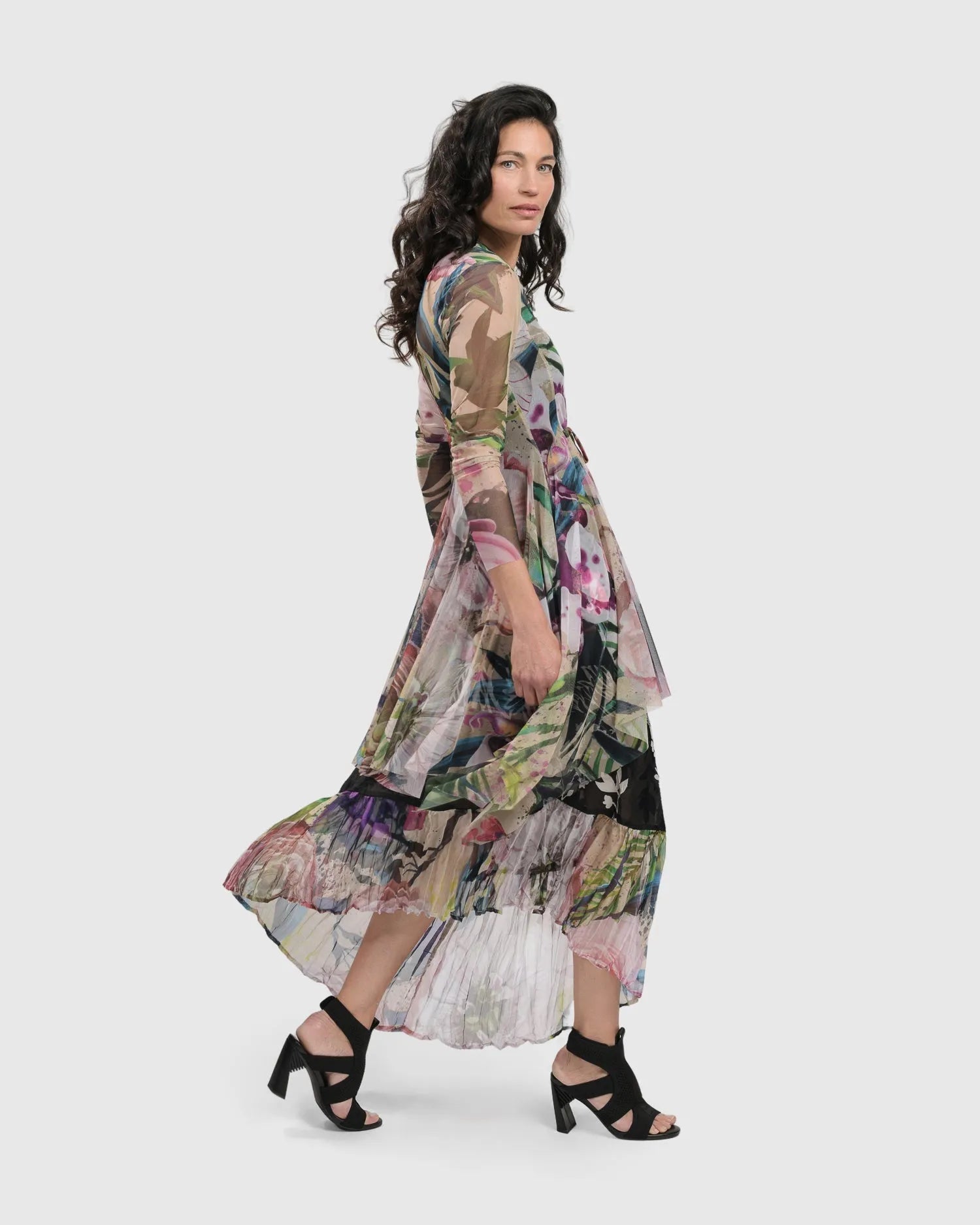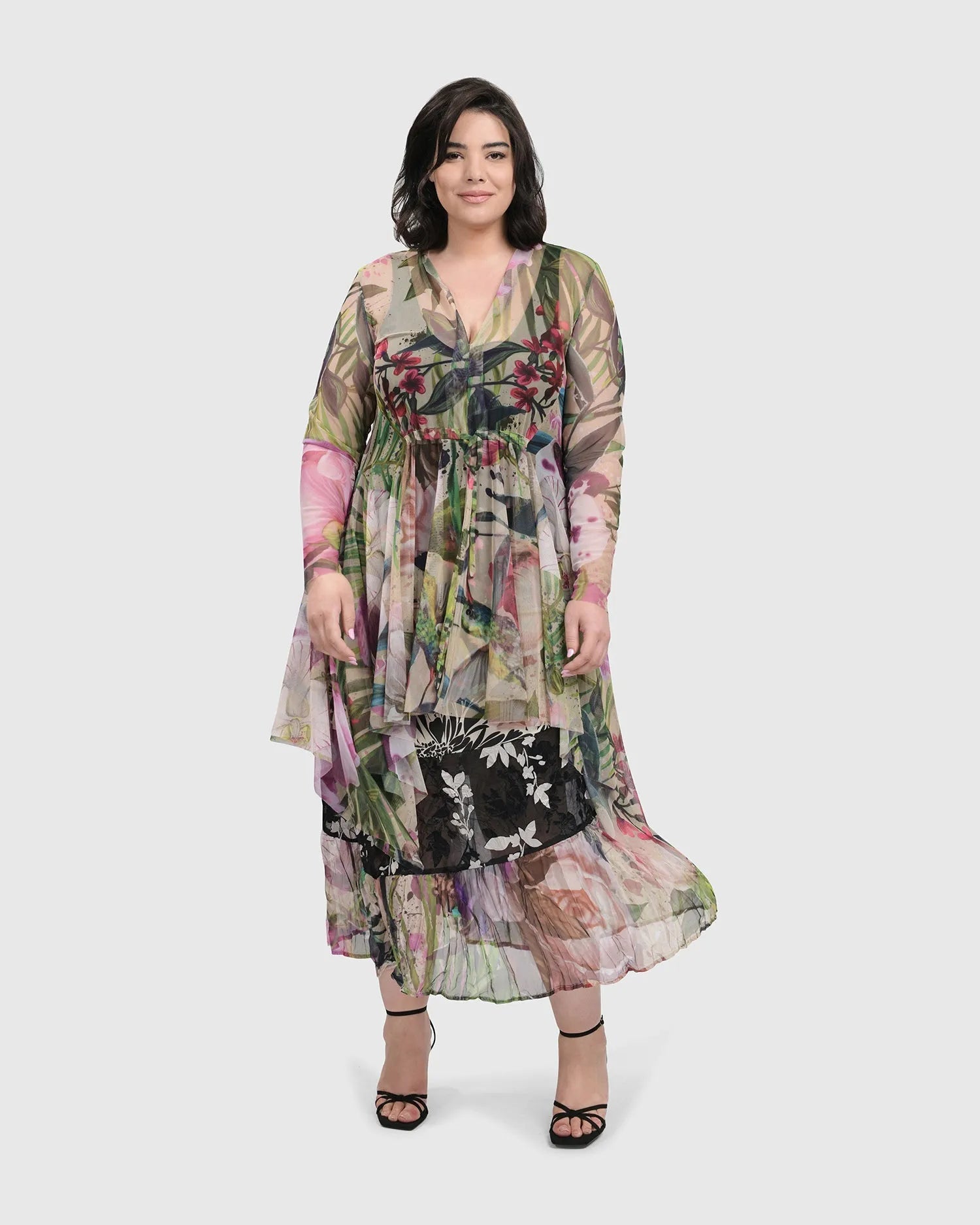 This evening pastel bouquet collection features sheer, woven fabric that is tailored and fitted. Designed for easy elegance with a comfy elasticized waist, side seam pockets and gathered flounce hem.