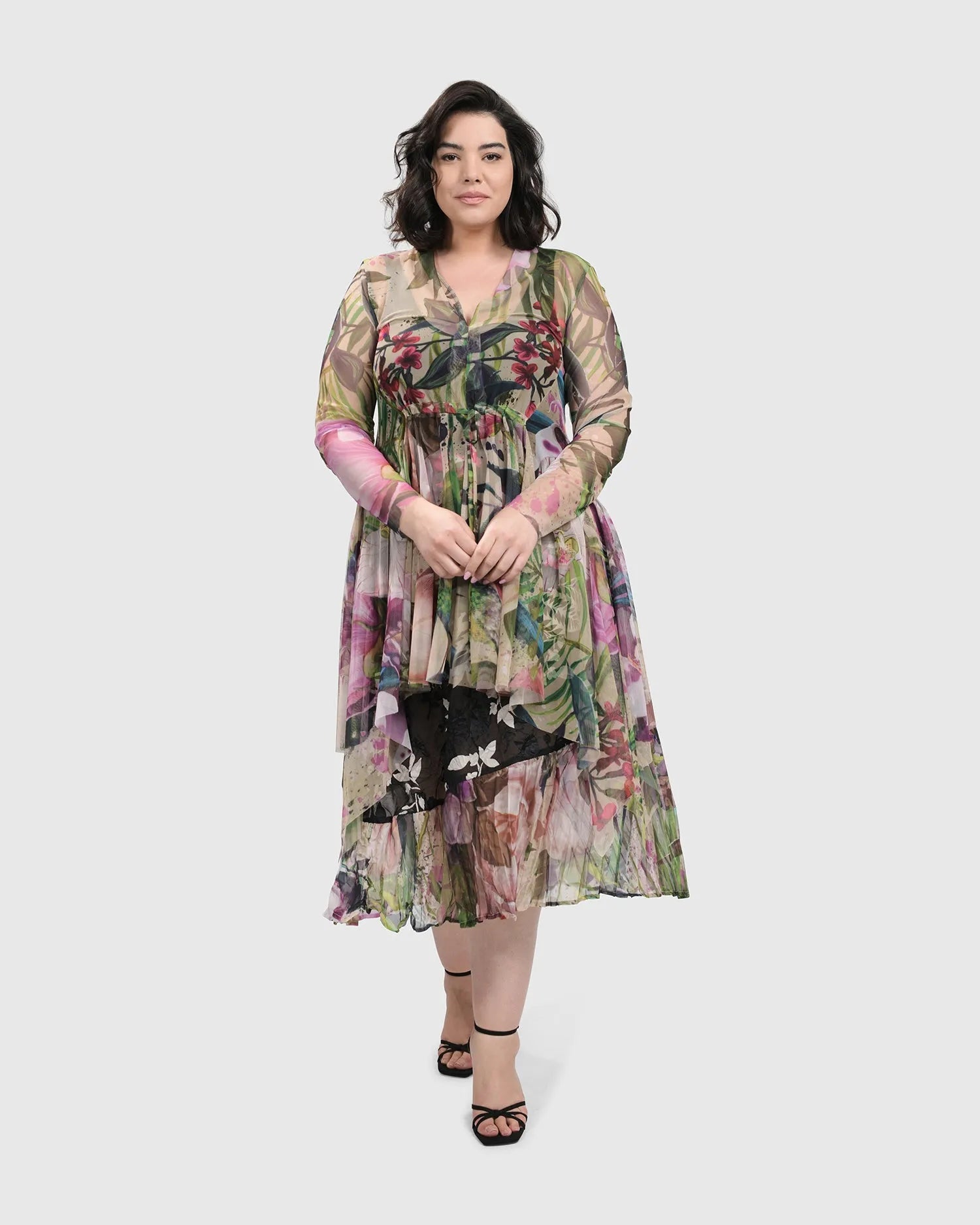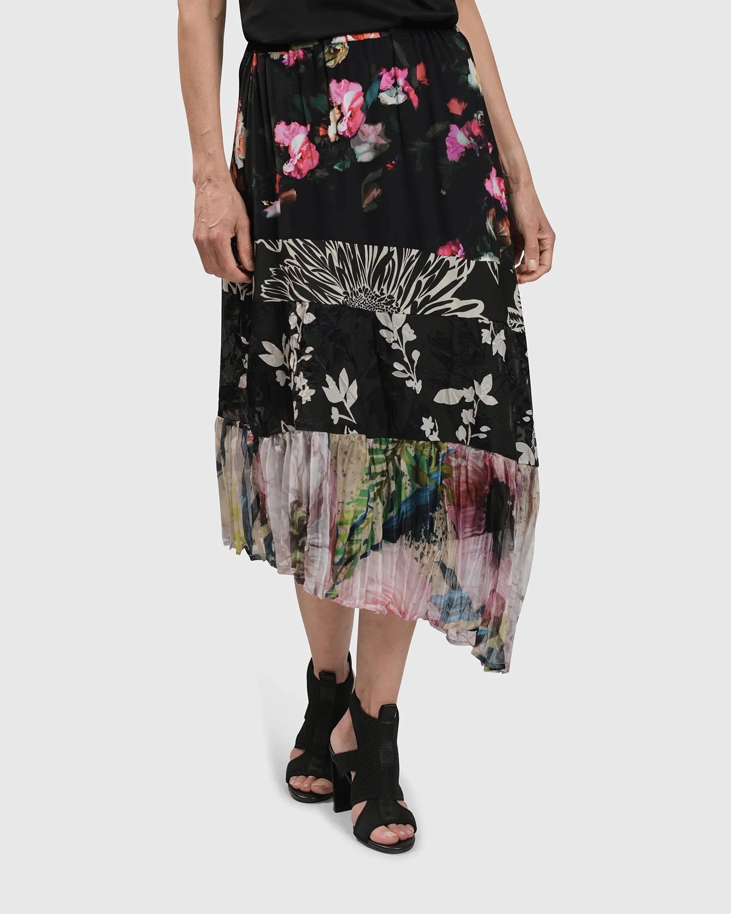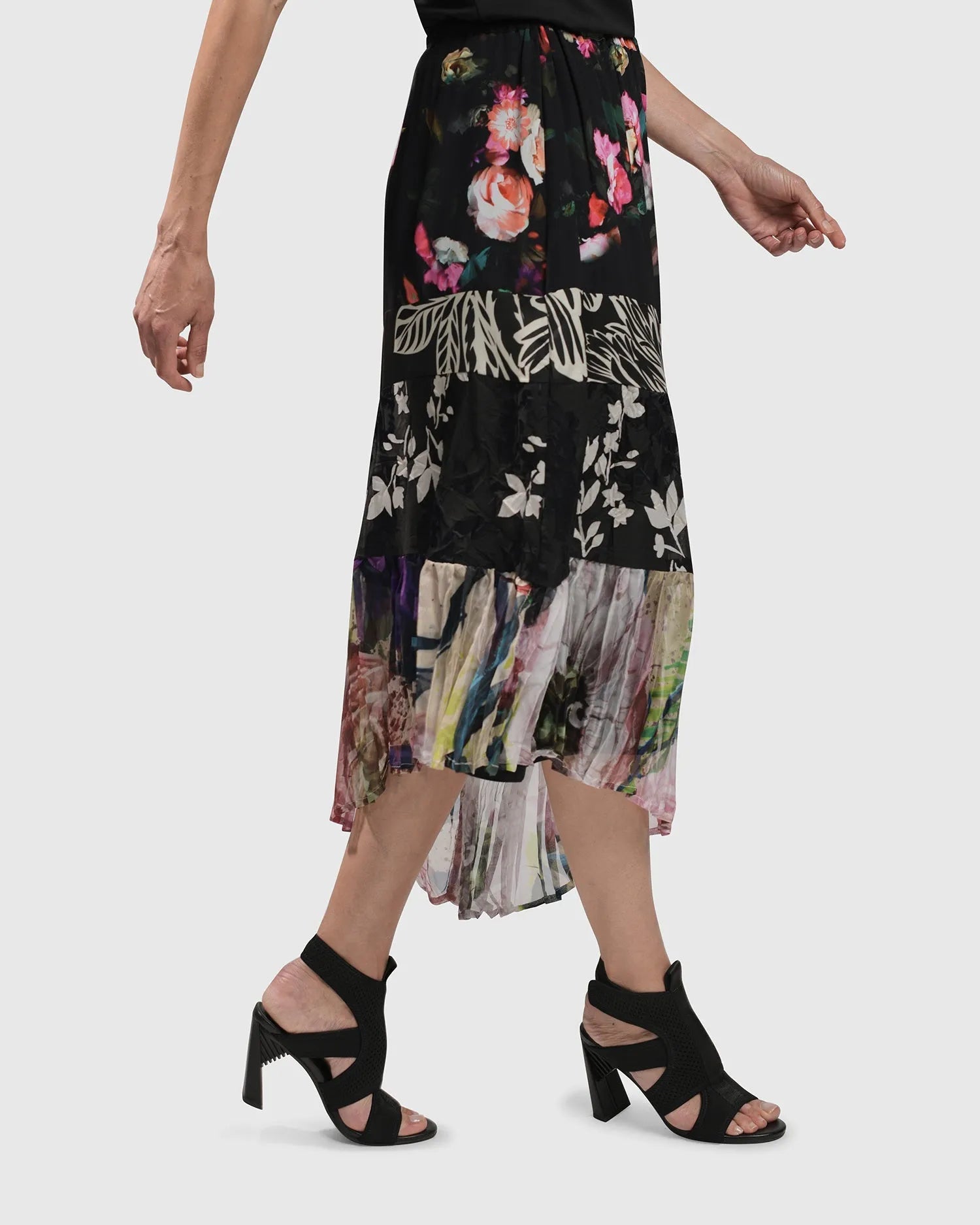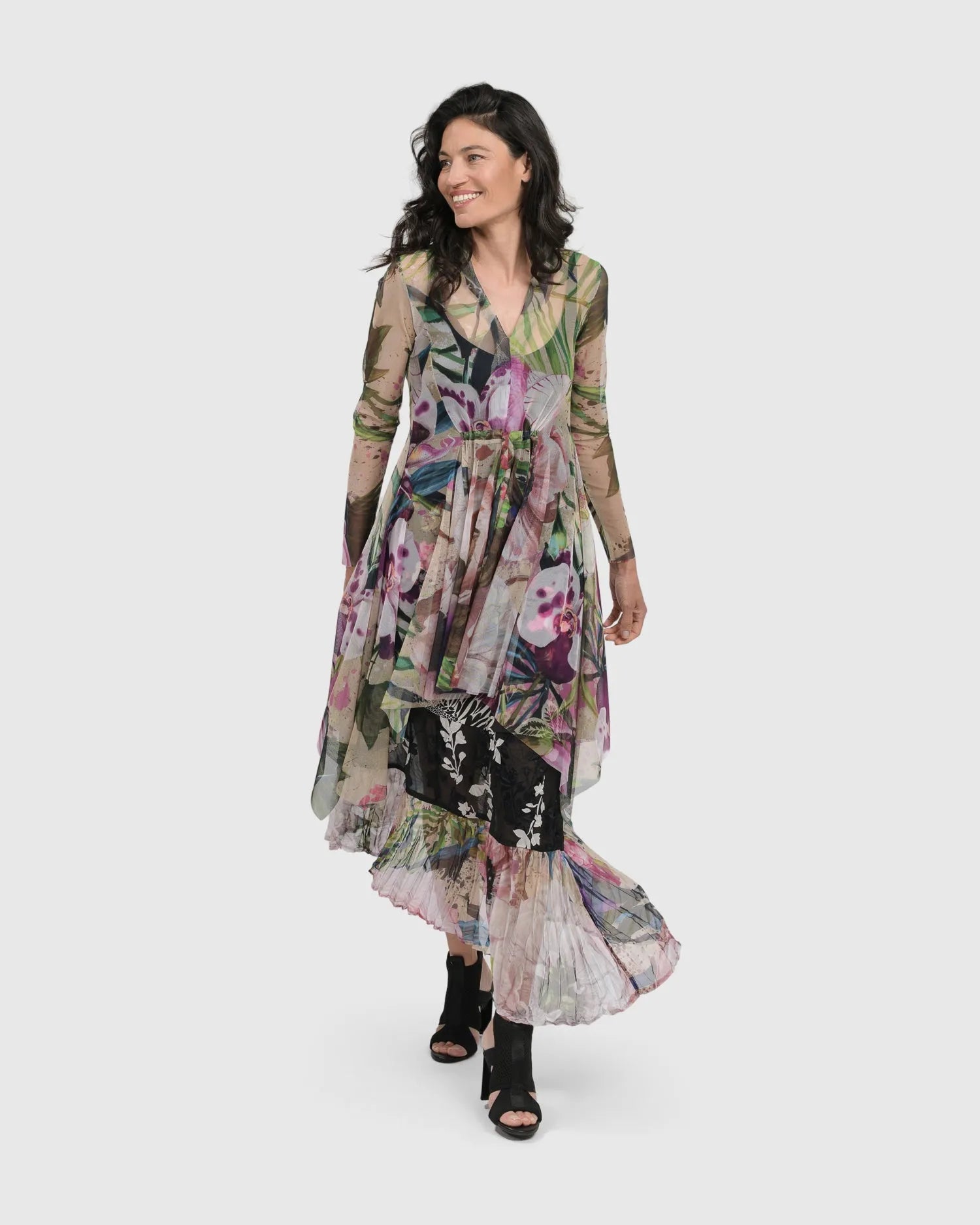 This evening pastel bouquet collection features sheer, woven fabric that is tailored and fitted. Designed for easy elegance with a comfy elasticized waist, side seam pockets and gathered flounce hem.