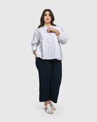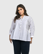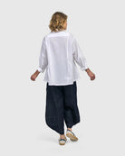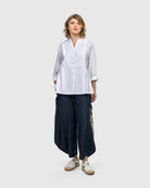 This peplum-style white button down is a great way to elevate a timeless outfit. Collarless V-neck, long cuffable sleeves, and gathered peplum detailing on sides. Full button placket that ends at the waist to allow for elegant draping.
