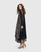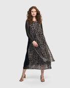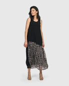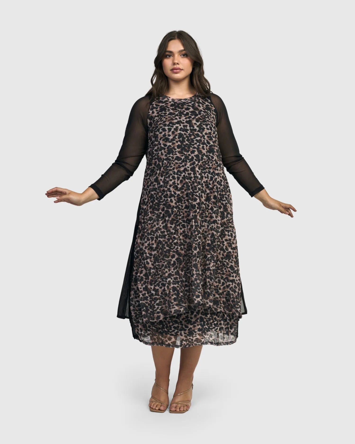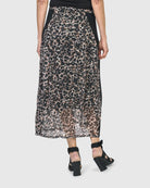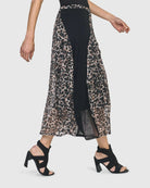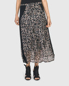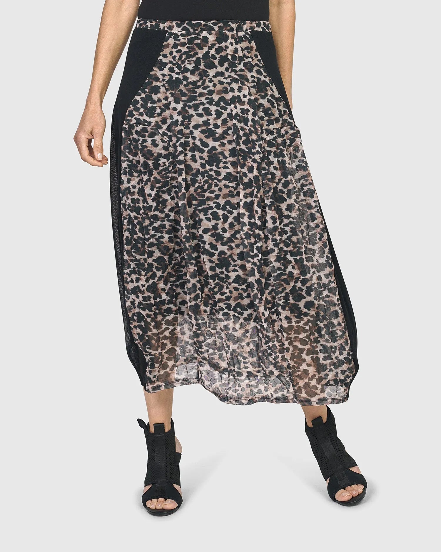 Get wild in animal print! This high-waisted midi skirt features a leopard print pattern with panels of black swingy mesh and an all-around elastic waist. Wear it as a statement pattern or go all out and style with every animal print pattern in your wardrobe. This skirt comes with a slip.