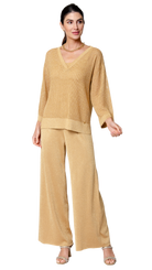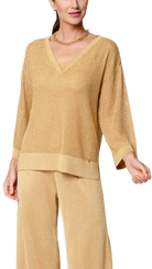 Oversized V-neck mesh top. 3/4 sleeves. The back is a couple of inches longer. The fabric is light and rich and has a golden lurex shimmer;