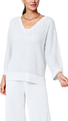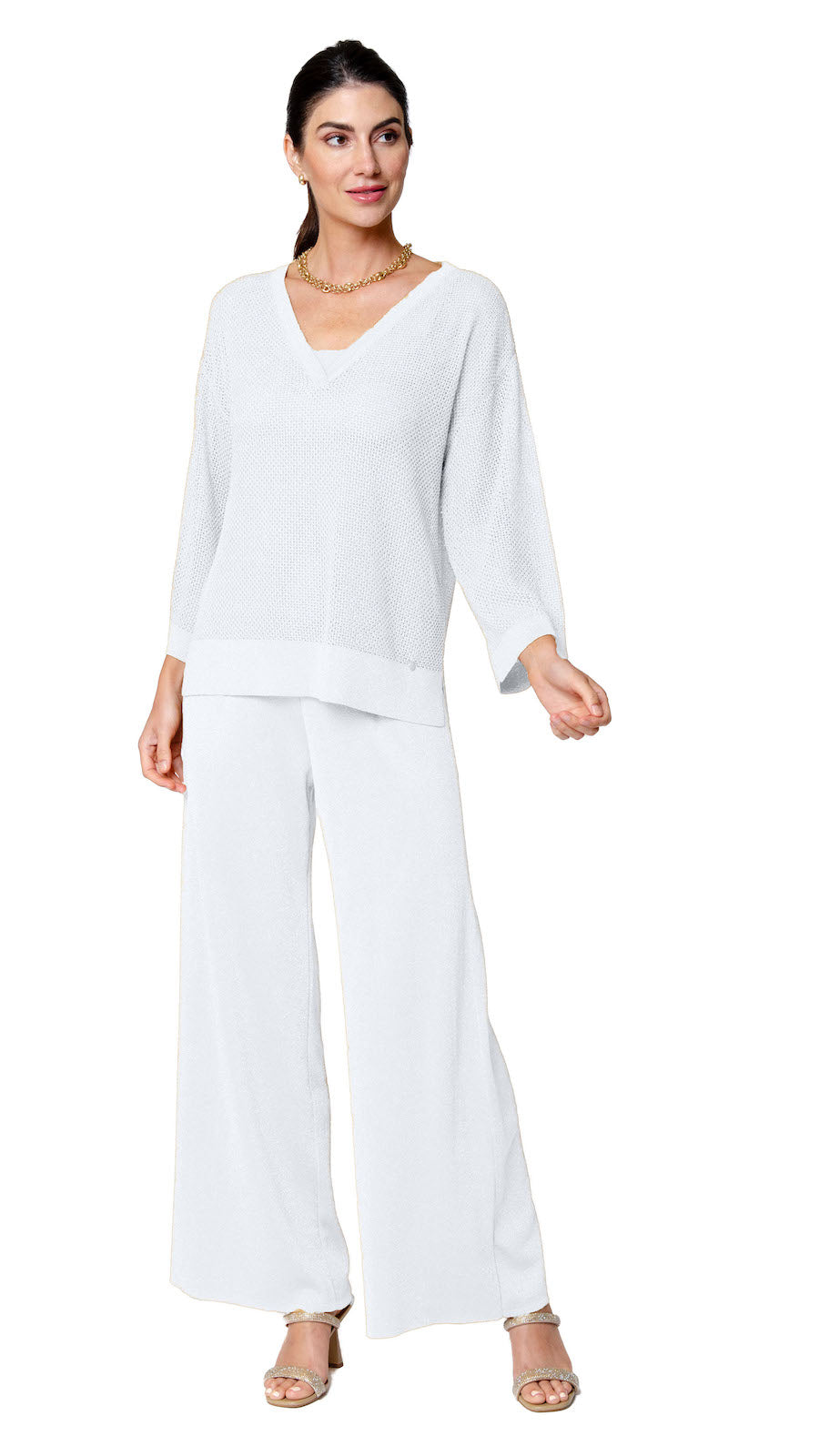 Oversized V-neck mesh top. 3/4 sleeves. The back is a couple of inches longer. The fabric is light and rich and has a silver lurex shimmer;