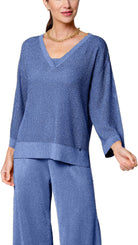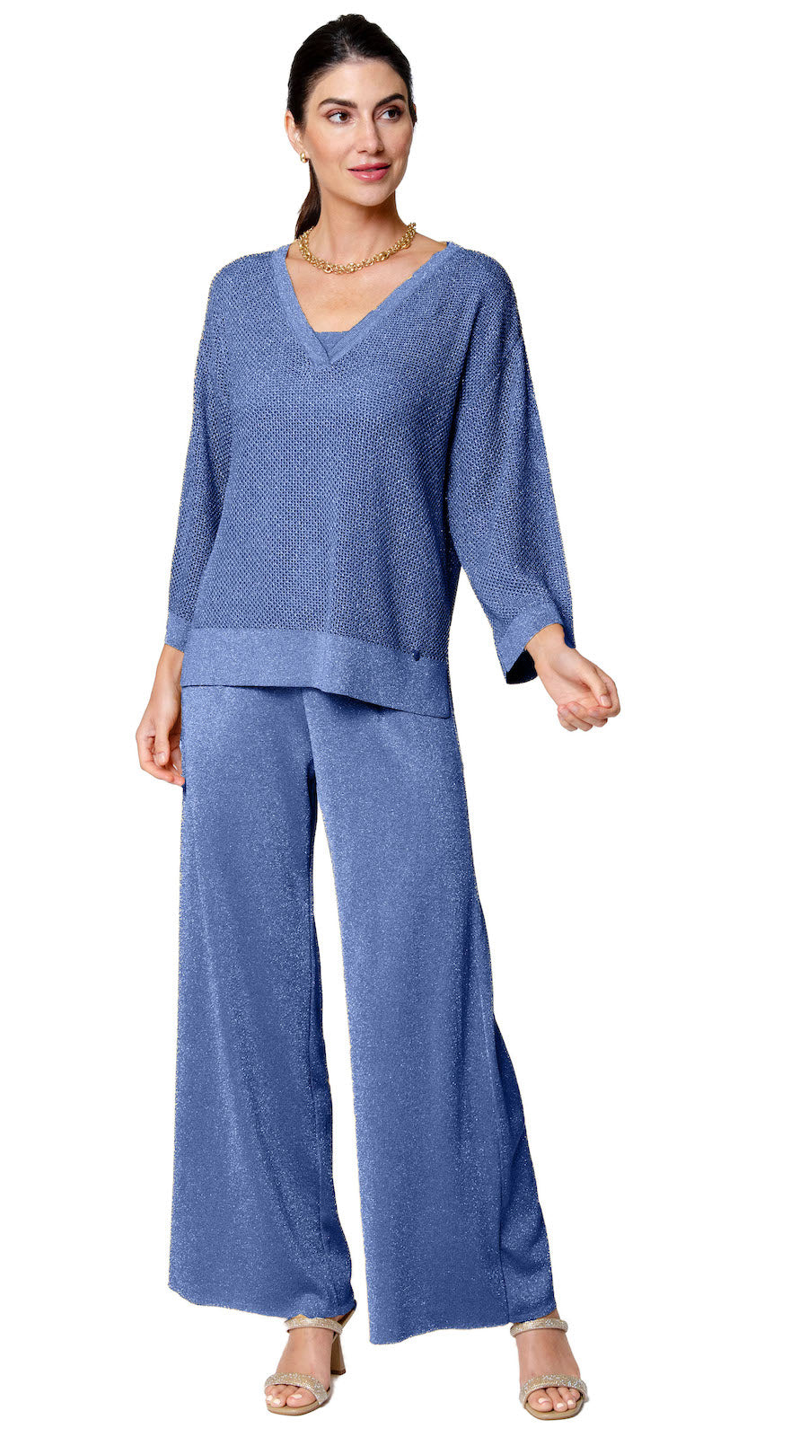 Oversized V-neck mesh top. 3/4 sleeves. The back is a couple of inches longer. The fabric is light and rich and has a silver lurex shimmer;