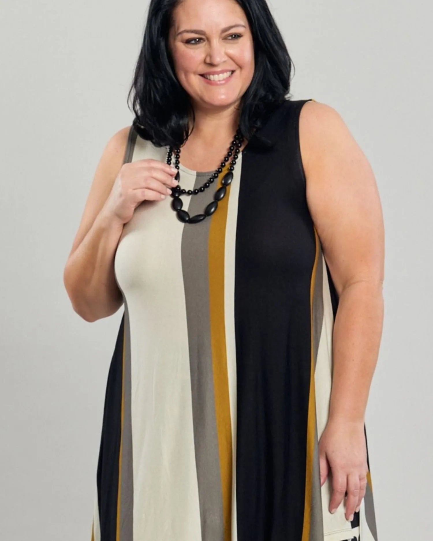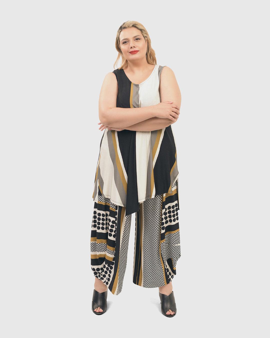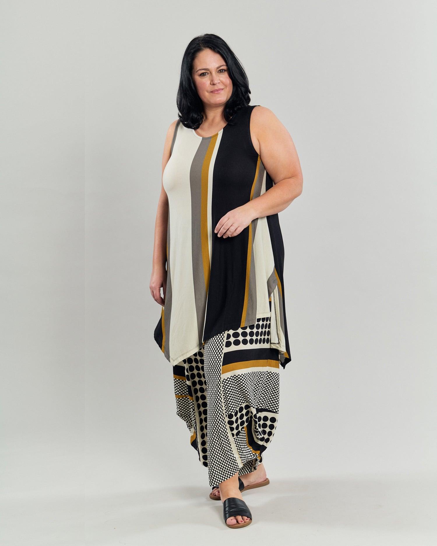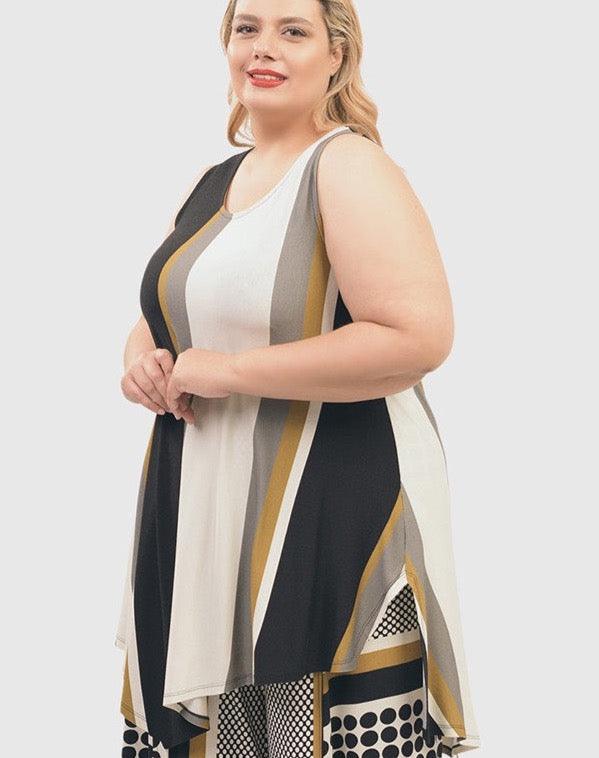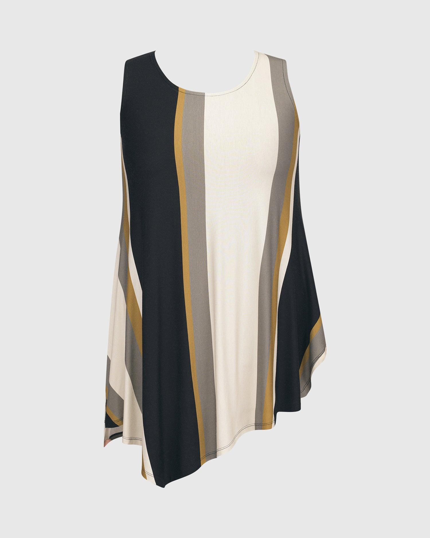 Flattering vertical stripes add modern flair to a popular silhouette... Our wear-everywhere top in an asymmetrical tunic length is a must-have layer, beautiful beneath any jacket or cardigan. Simply indispensable scoop-neck style has a bra-friendly cut at the shoulders and a swingy silhouette with one side slit at the hem.